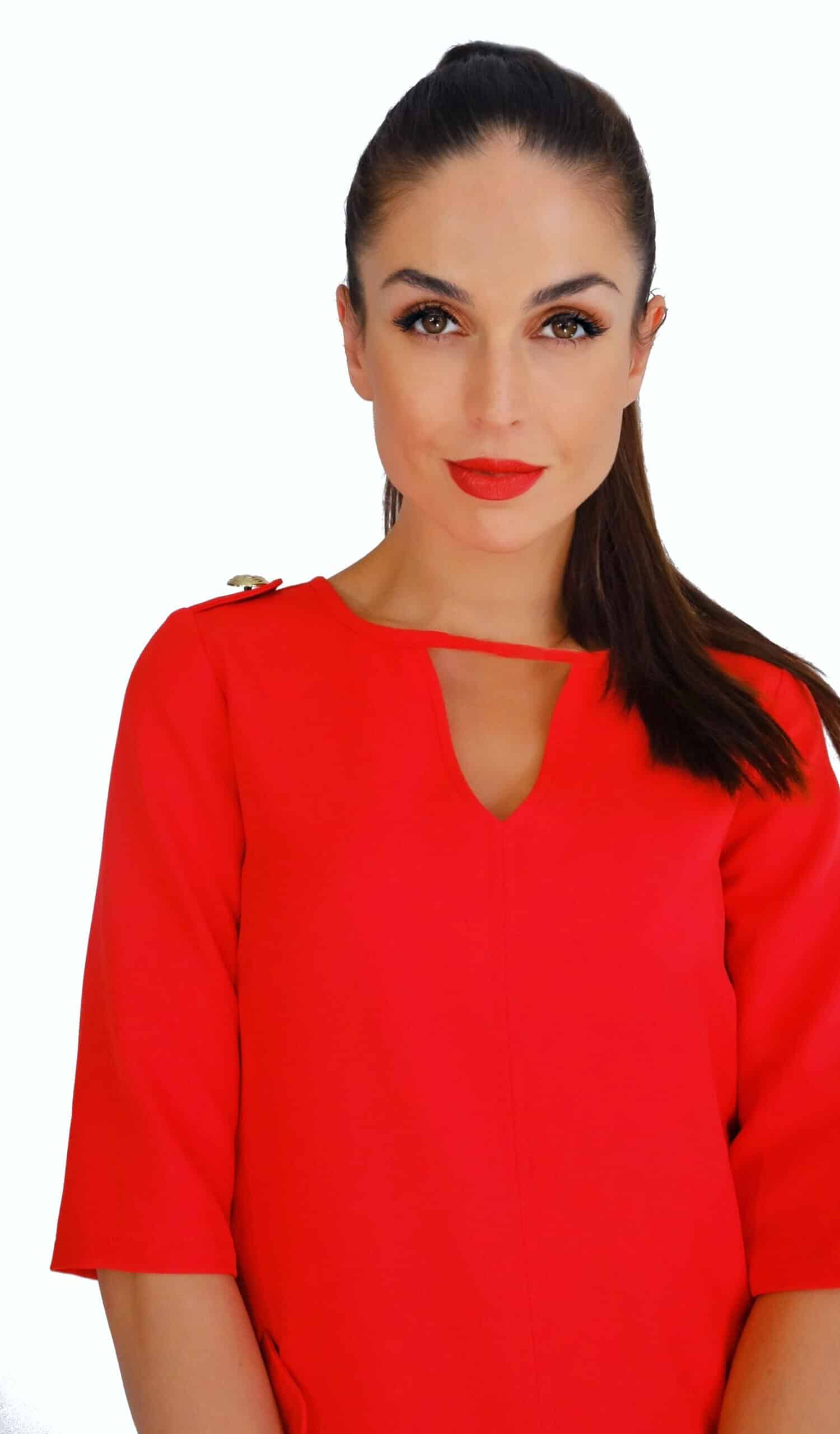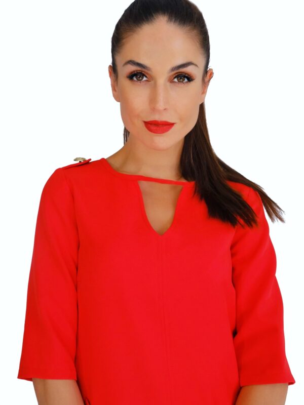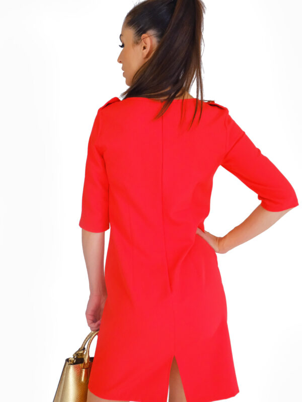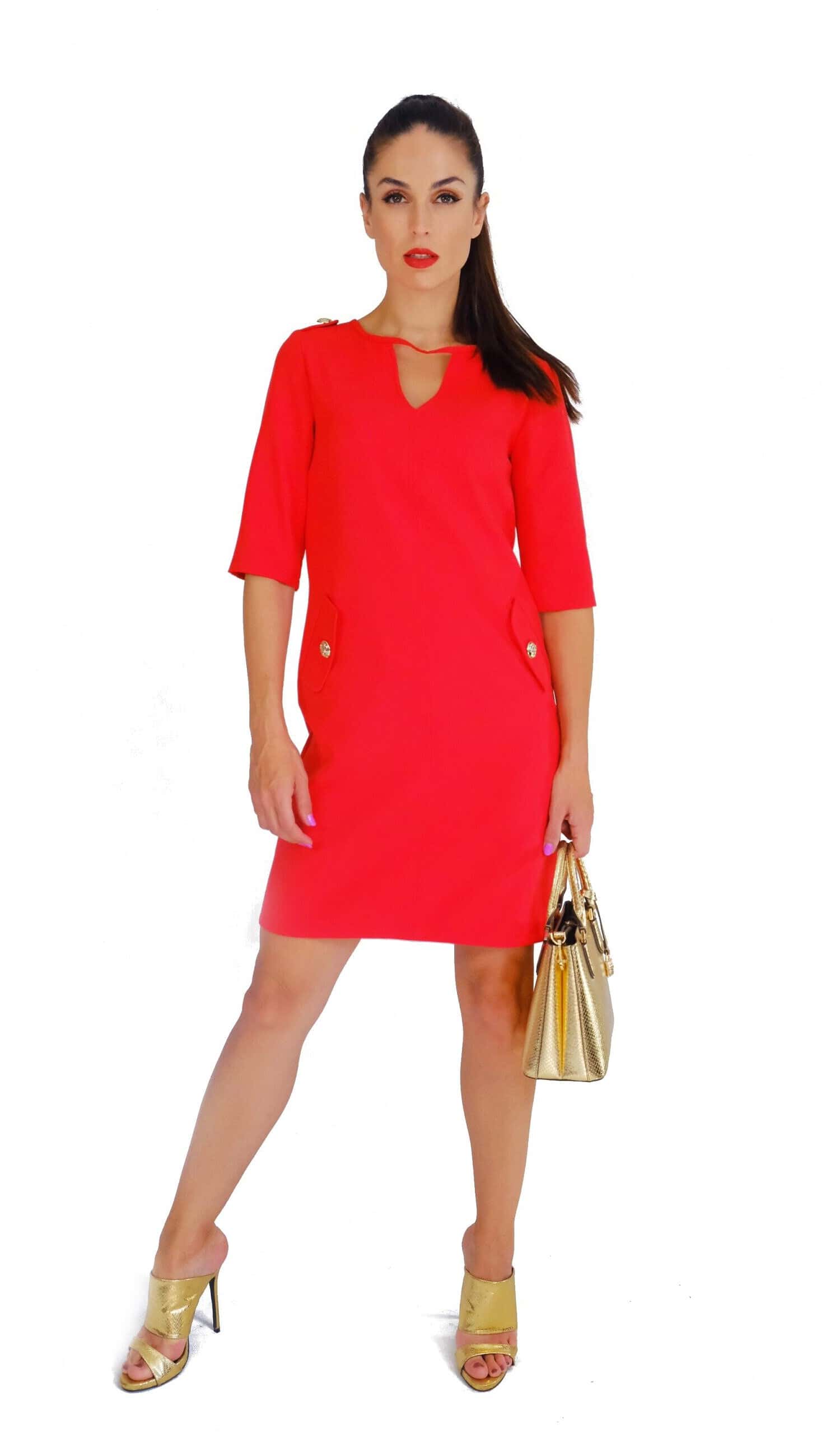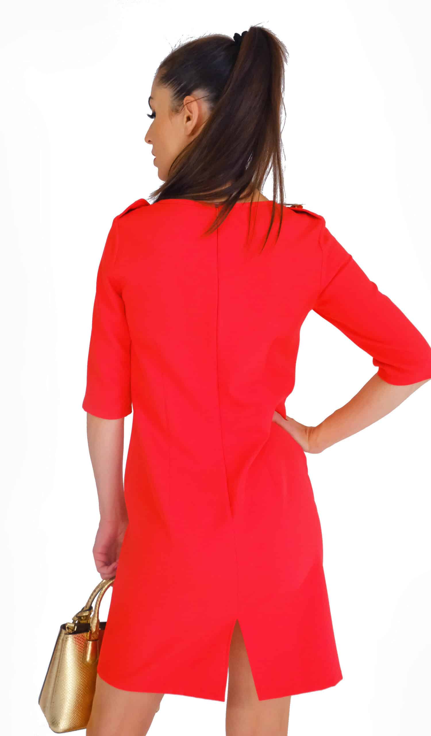 Šaty ušité v pohodlnom áčkovom strihu, ktorý výborne sadne na každú postavu. Šaty majú kratšie lakťové rukávy čím sú praktické do práce aj na oslavu. Zaujímavým detailom sú zlaté gombíky na falošných vreckách. Skombinujte so zlatými alebo čiernymi doplnkami pre wau effekt v práci aj na oslave.
