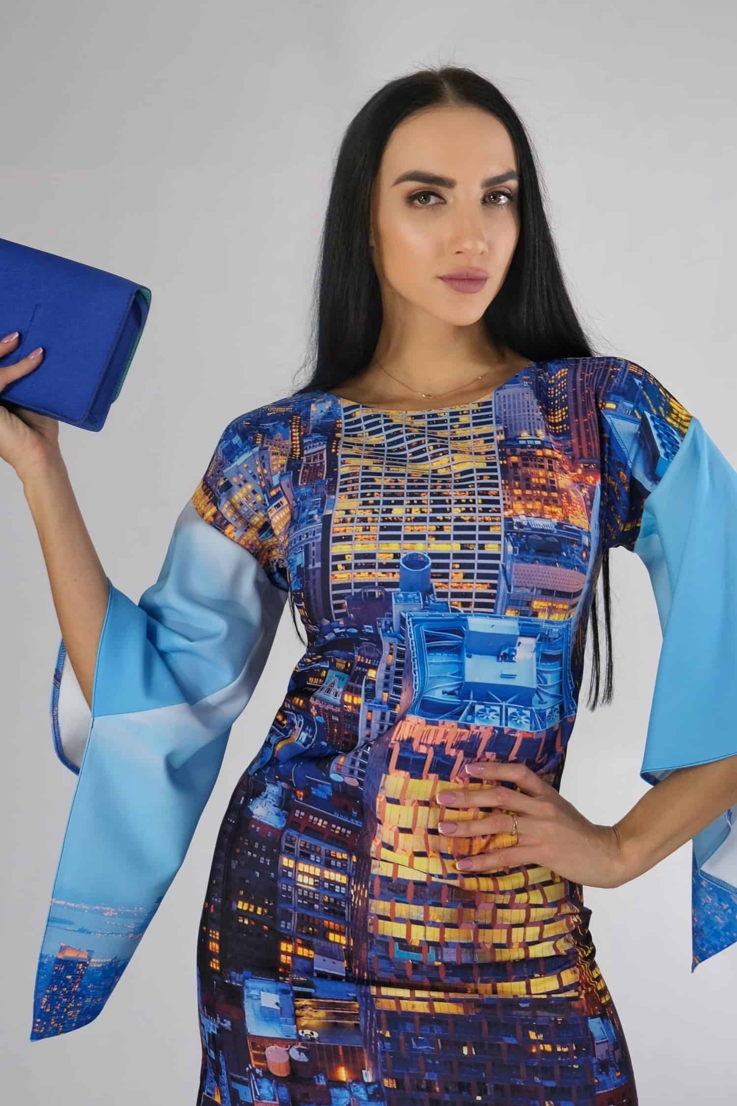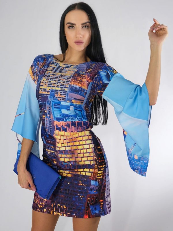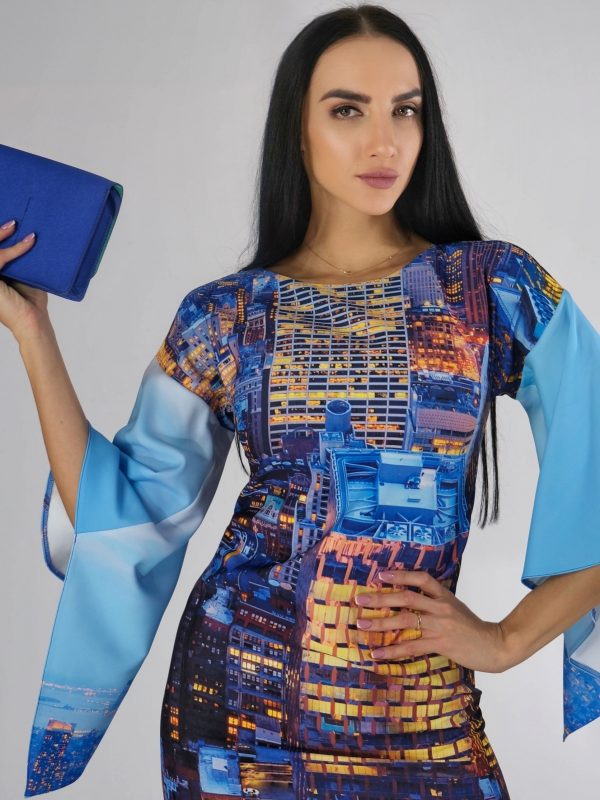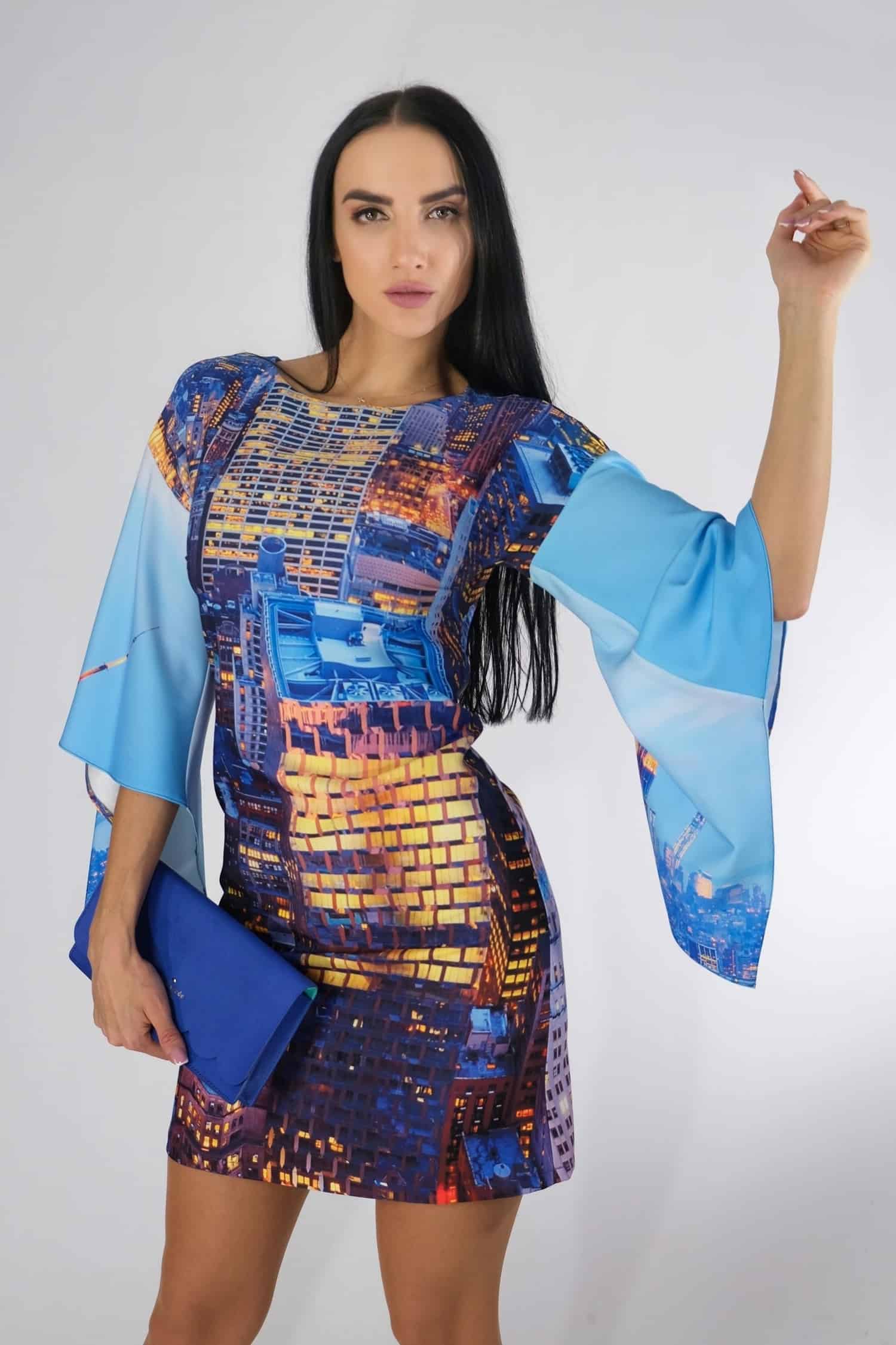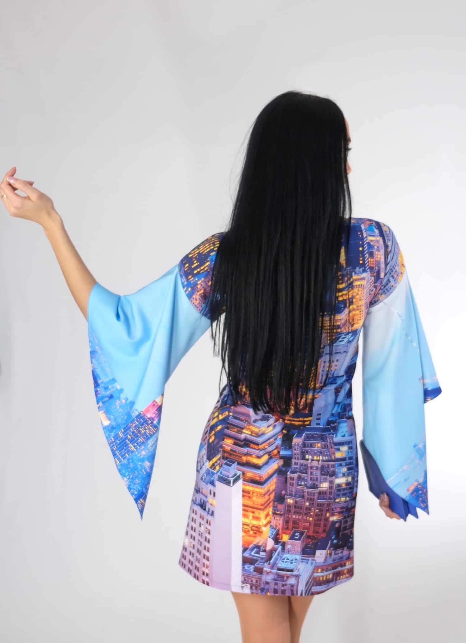 Šaty ušité v jednoduchom puzdrovom strihu s bohémskymi rukávmi. Šaty výborne kopírujú postavu a vyhladia drobné nedostatky. Bohémske rukávy dodávajú šatám šmrnc a môžete si ich zobrať do práce aj na oslavu. Jednoduchý strih šiat necháva vyniknúť nádhernému vzoru New Yorku, mesta,ktoré nikdy nespí. Preneste sa aspoň duchom do mesta, ktoré nikdy nespí a nechajte sa inšpirovať vysvieteným nočným mestom, ktoré niektorý prezývajú „ Big Apple“ .