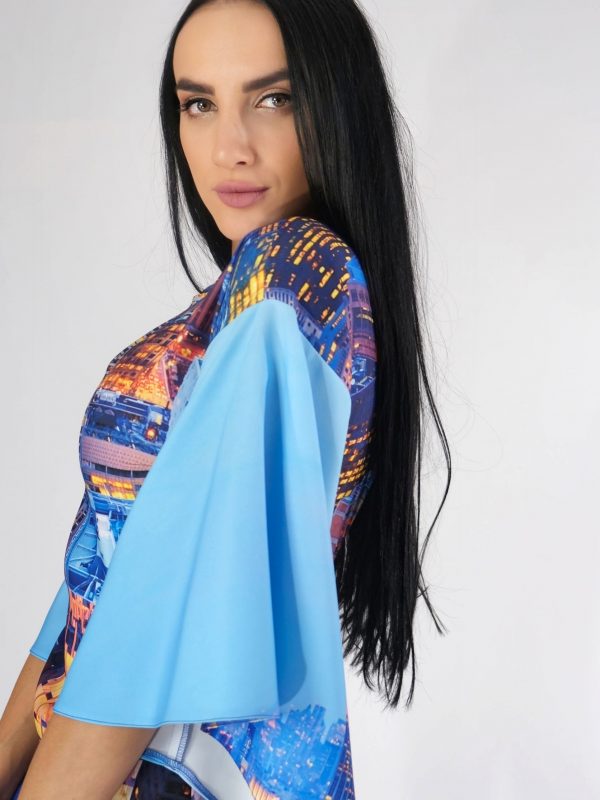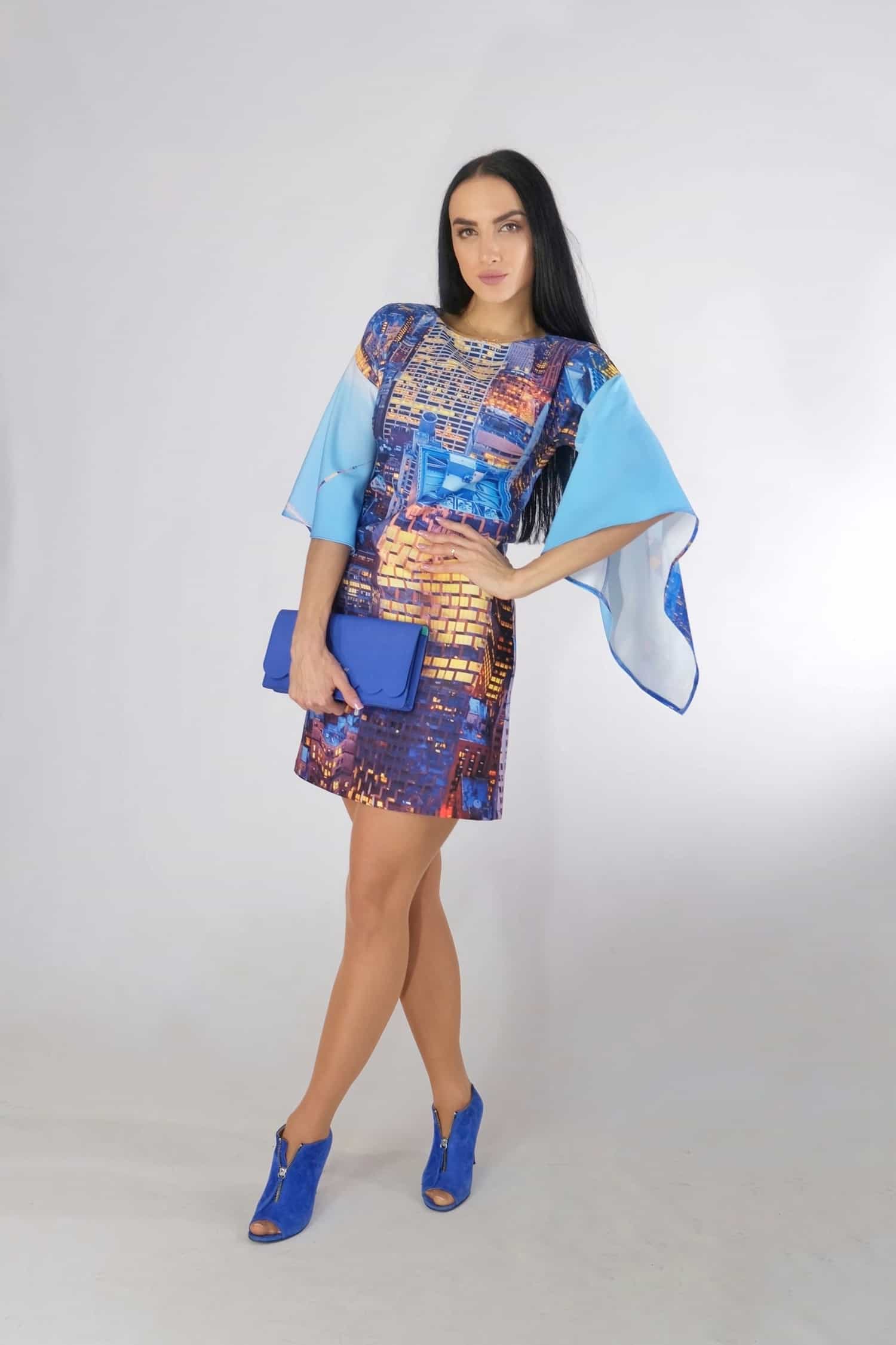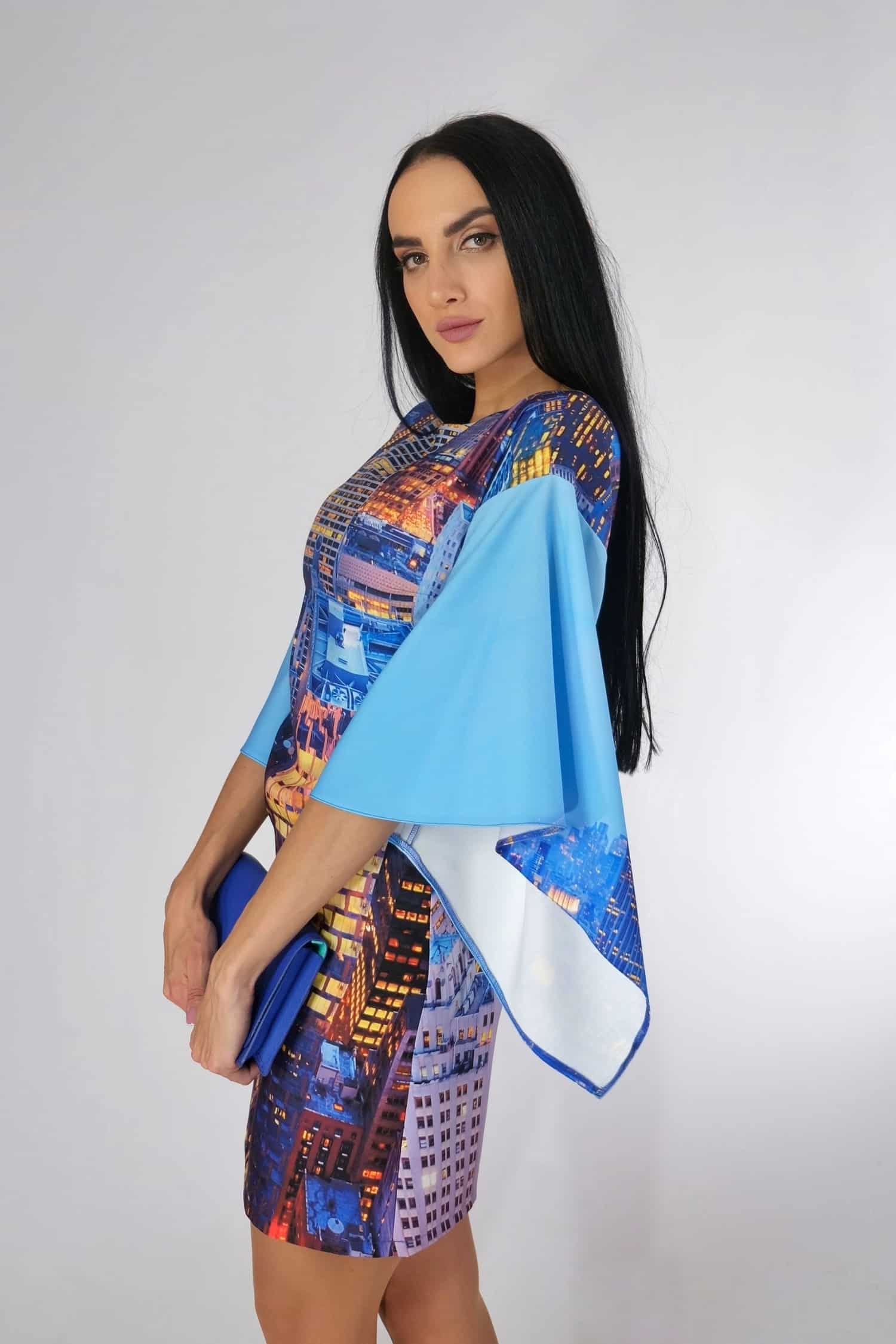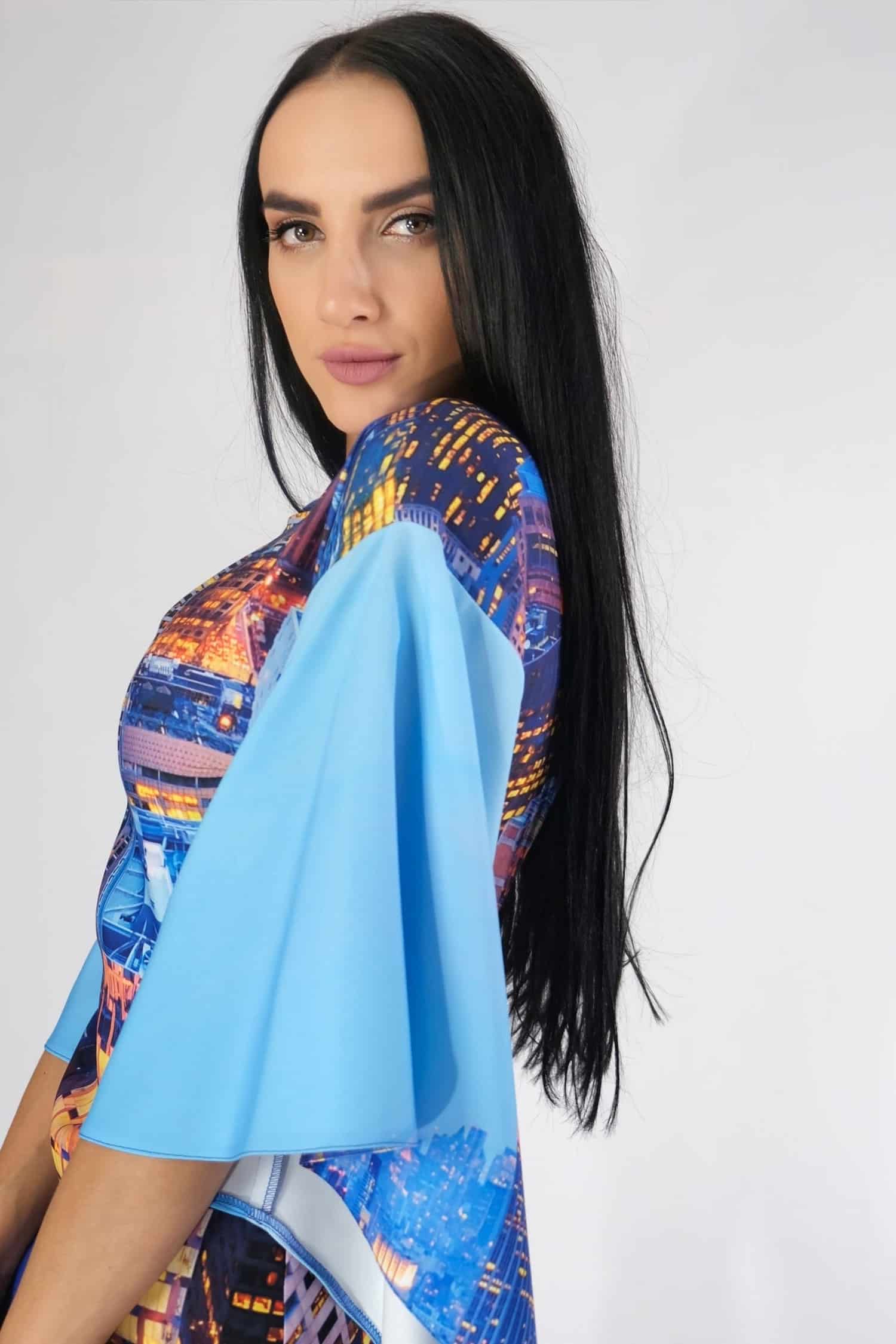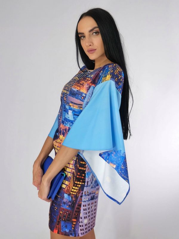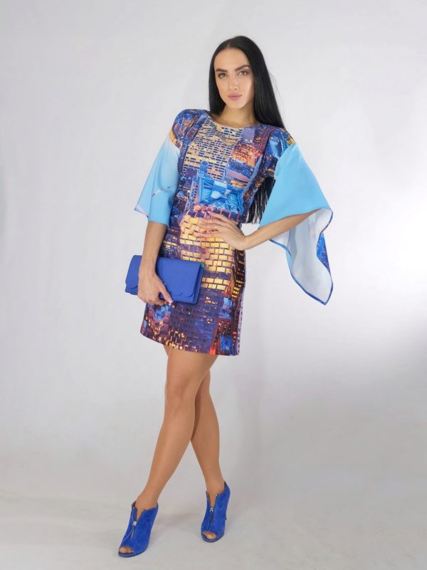 Šaty ušité v jednoduchom puzdrovom strihu s bohémskymi rukávmi. Šaty výborne kopírujú postavu a vyhladia drobné nedostatky. Bohémske rukávy dodávajú šatám šmrnc a môžete si ich zobrať do práce aj na oslavu. Jednoduchý strih šiat necháva vyniknúť nádhernému vzoru New Yorku, mesta,ktoré nikdy nespí. Preneste sa aspoň duchom do mesta, ktoré nikdy nespí a nechajte sa inšpirovať vysvieteným nočným mestom, ktoré niektorý prezývajú „ Big Apple“ .