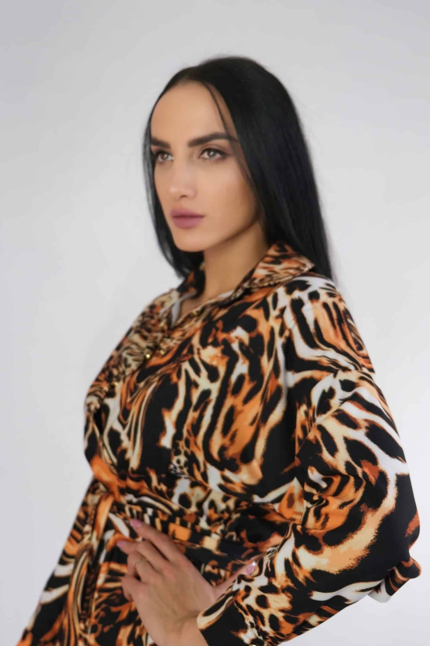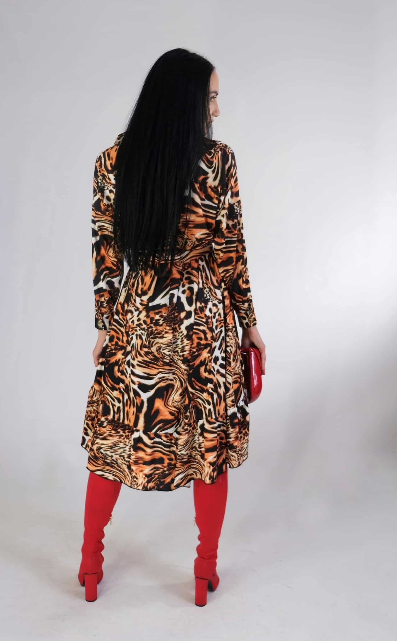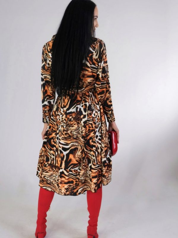 Šaty navrhnuté vo výraznom áčkovom košeľovom strihu sú stelesnenie komfortu a pohodlia. Šaty majú asymetricky strihanú suknicu a skvele sadnú na každý typ postavy. Šaty sú ušité vo výraznom zvieracom motíve, ktorý je tlmený čiernym lemovaním.