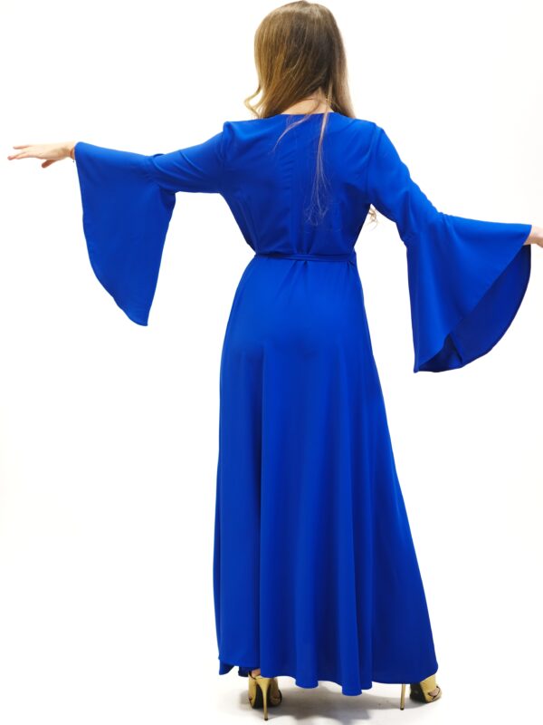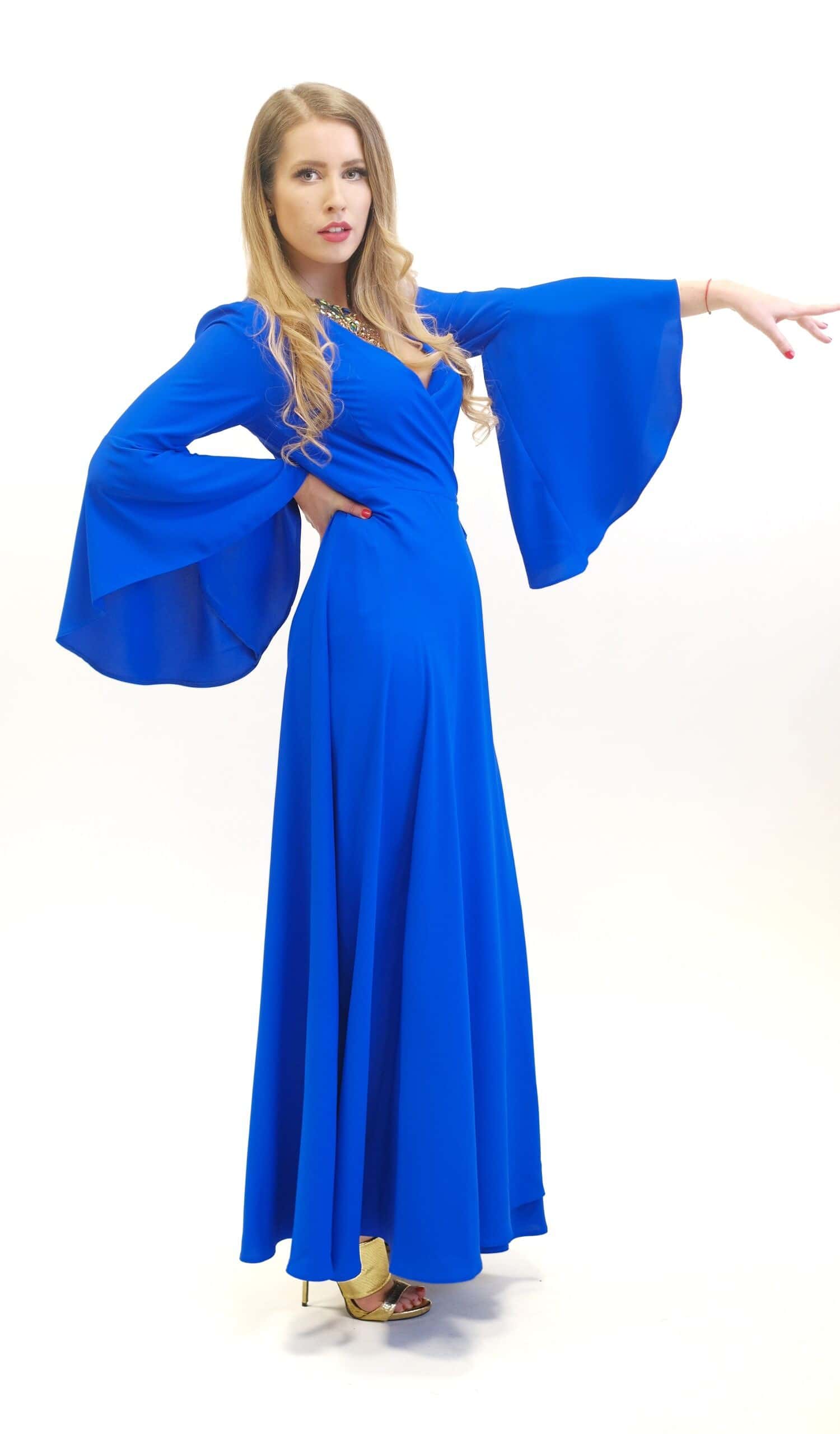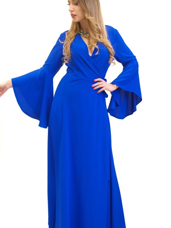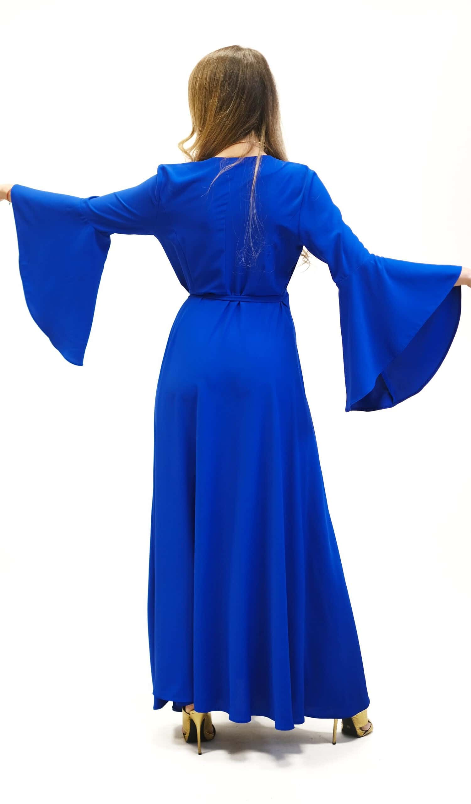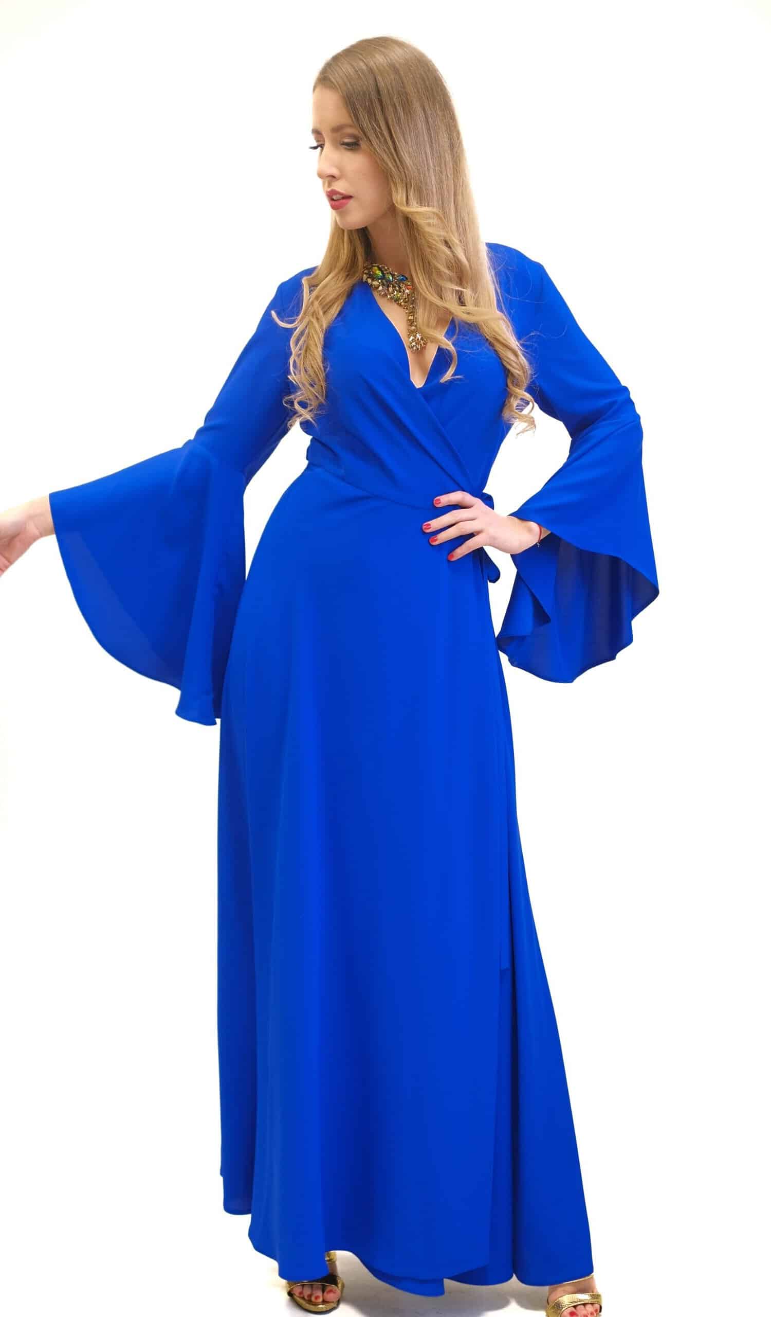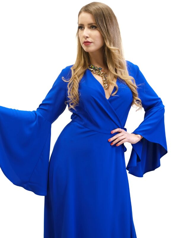 Šaty sú ušité z ľahkého materiálu príjemného na dotyk vo zvinovacom strihu. Šaty sú navrhnuté v romantickom nádychu s volánovými zakončeniami rukávov. Šaty ušité vo zvinovacom strihu výborne sadnú na každý typ postavy , ale hlavne sa hodia postavám s väčším dekoltom. Šaty sú prestrihnuté v páse a majú pripevnený opasok, ktorým si opticky zoštíhlite pás a vytvoríte súmernejšiu postavu. Šaty sa výborne hodia na každý typ oslavy alebo vďaka ich ľahkosti aj ako večerné šaty na dovolenku. Šaty sú navrhnuté v prenikavej modrej, v ktorej zažiarite na každej spoločenskej udalosti. Skombinujte so zlatými alebo striebornými doplnkami, ktoré dodajú šatám eleganciu.