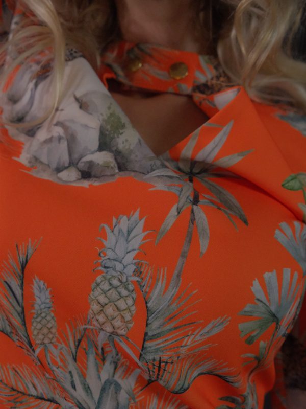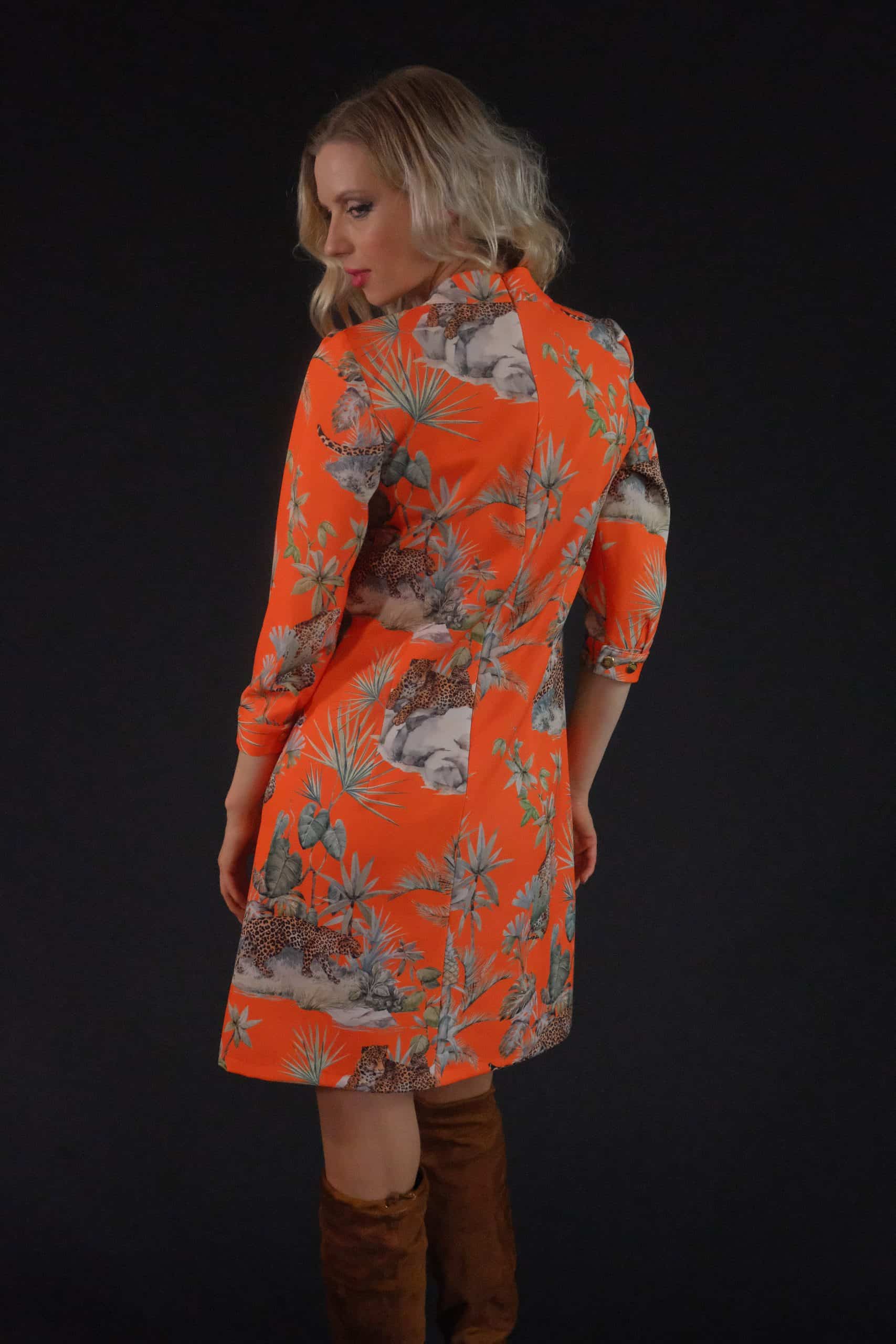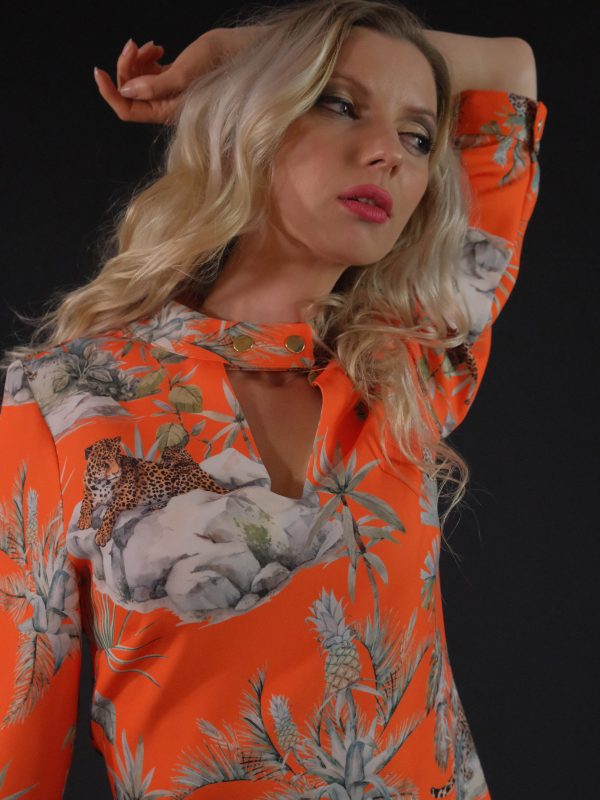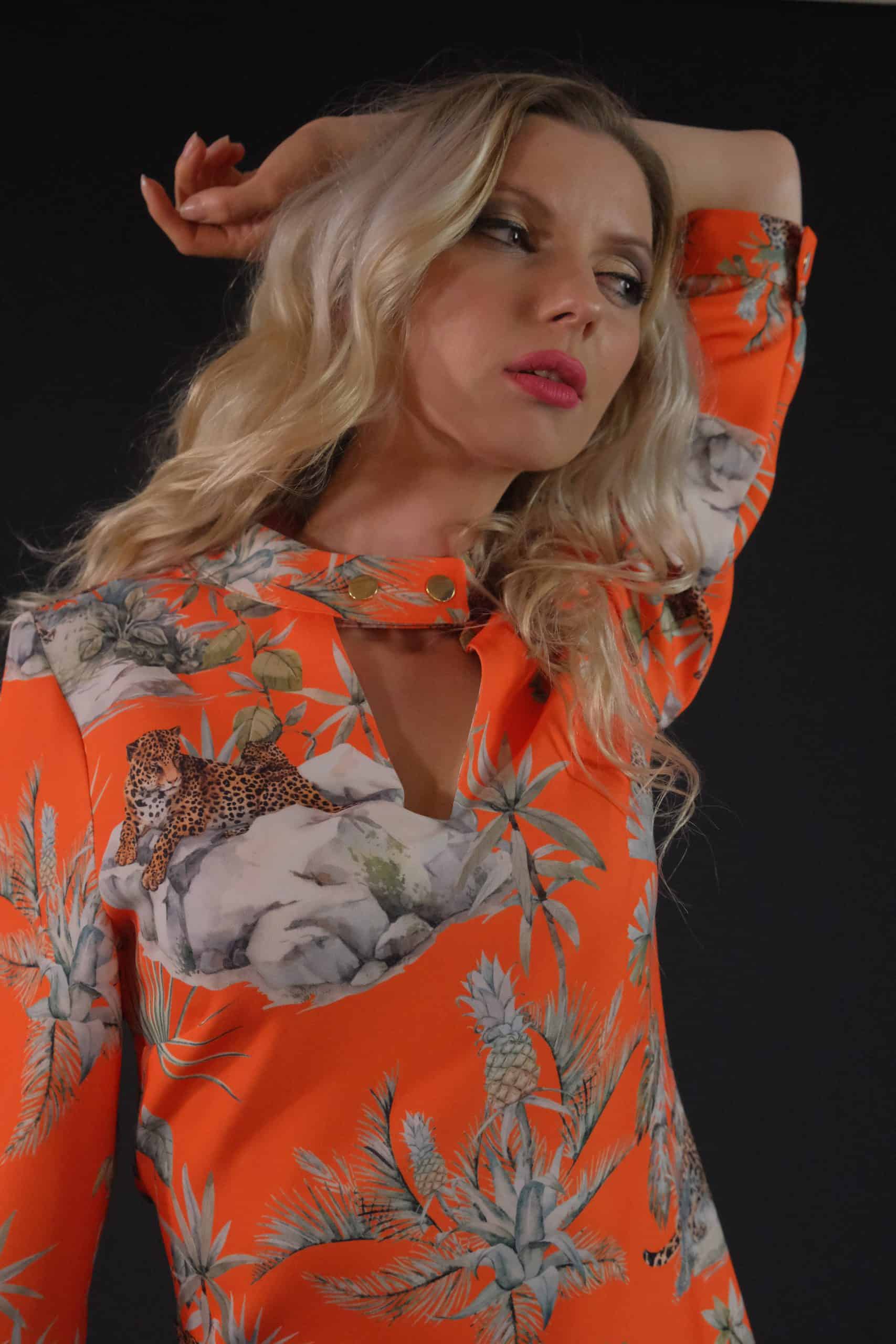 Šaty ušité z výborne padnúce materiálu. Šaty sú ušité vo výraznej oranžovej farbe, ktorá je hitom sezóny jeseň/zima. Výrazná oranžová s motívom veľkých kočkovitých šeliem sa skvele kombinuje s tmavšími farbami, ktoré dominujú v šatníku každej z Vás , v zimnom období. Zvoľte jednoduché doplnky a máte skvelý outfit do práce aj na oslavu. Šaty sú ušité v jednoduchom áčkovom strihu, ktorý skvele sadne na každú postavu.