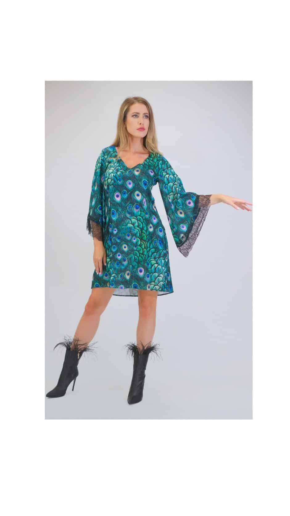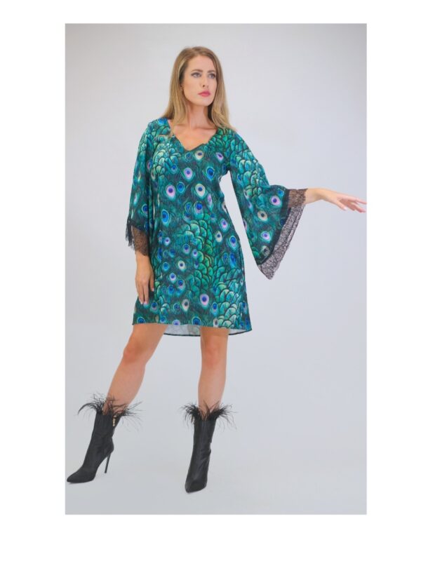 Šaty sú ušité vo voľnom strihu ktorý výborne sadne na každý typ postavy. Šaty sú navrhnuté v ľahkom letnom materiály ,v ktorom sa budete cítiť ako keby ste na sebe nič nemali. Zaujímavým detailom šiat je zakončenie bohémskych rukávov čiernou krajkou. Dodáva to šatám nádych romantiky. Šaty sú ušité vo vzore pávích pier, v ktorom dominuje zelená a jej odtiene ,nájdete tam však aj ružovú a modrú. Vďaka ľahkému a nekrčívému materiálu sú šaty ako stvorené na horúce letné dni a exotické dovolenky. Doplnky zvoľte v menej dominantných farbách ako ružová alebo modrá.