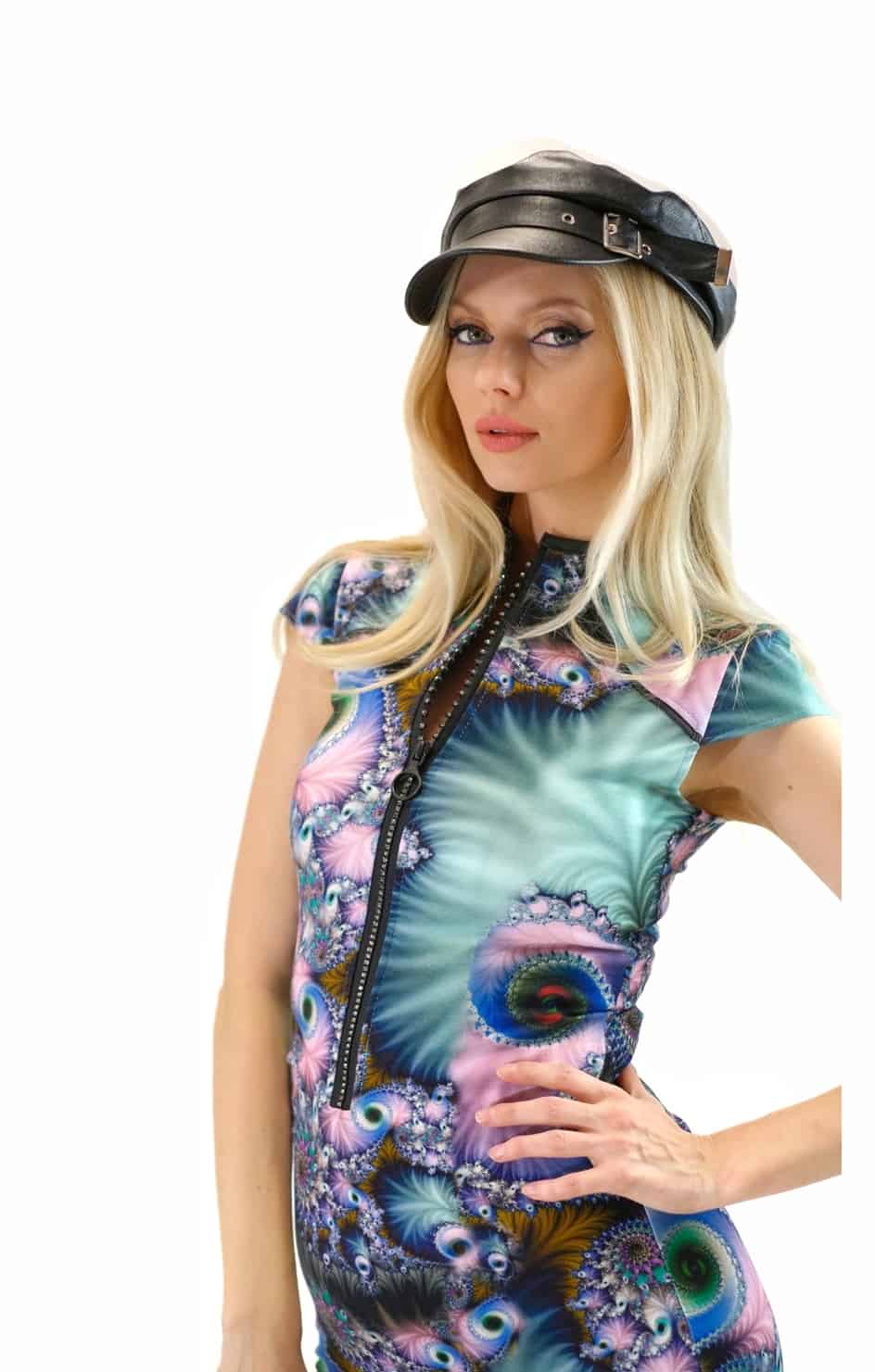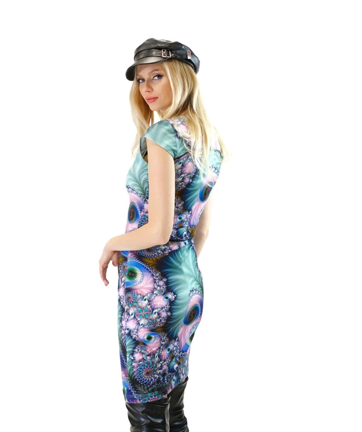 Šaty sú navrhnuté z pohodlného úpletu, ktorý sa výborne prispôsobí Vašej postave. Zaujímavým detailom je výrazný ozdobný zips, ktorý šatám dodáva šmrnc. Šaty môžete nosiť taktiež s kontrastným čiernym rolákom alebo tenkým úpletovým tričkom s dlhými rukávmi počas chladných mesiacoch. Šaty majú výrazný vzor pávích očí v kombinácii tyrkysovej a fialovej.