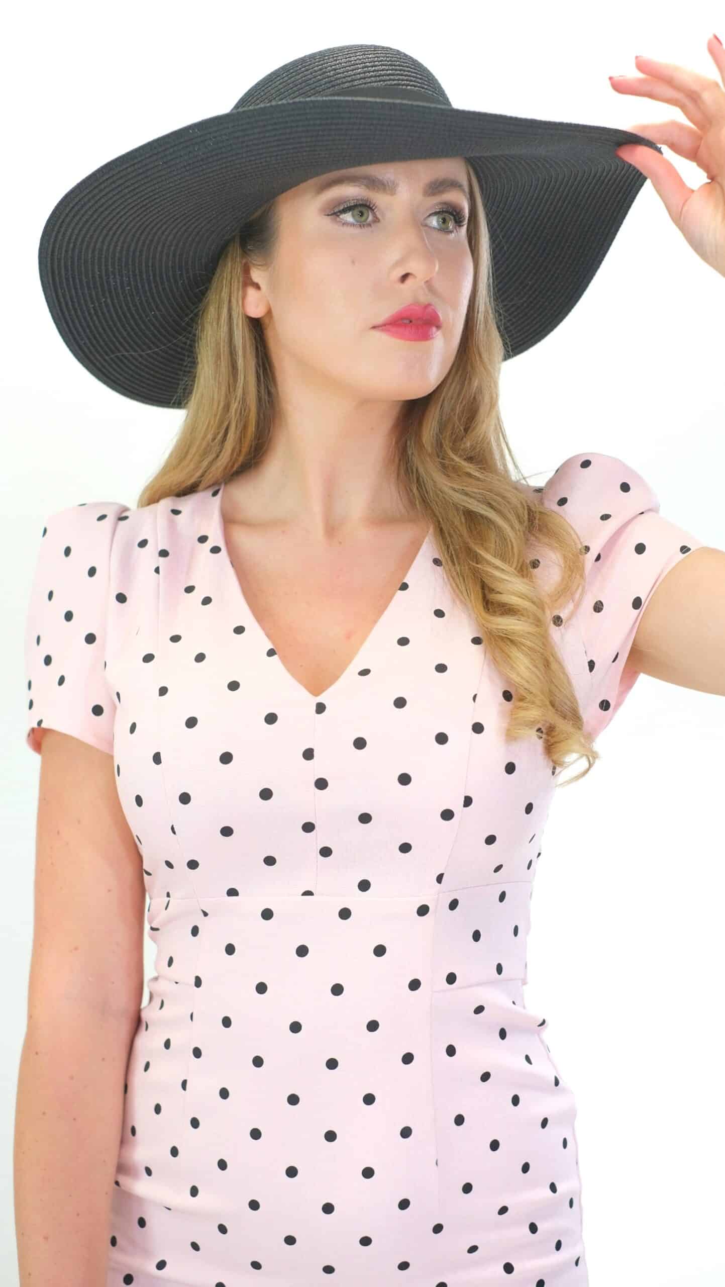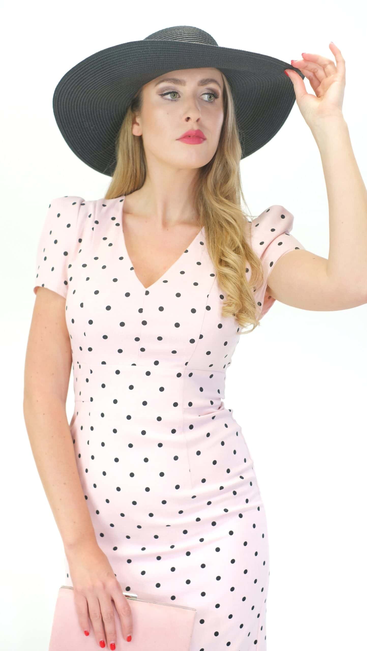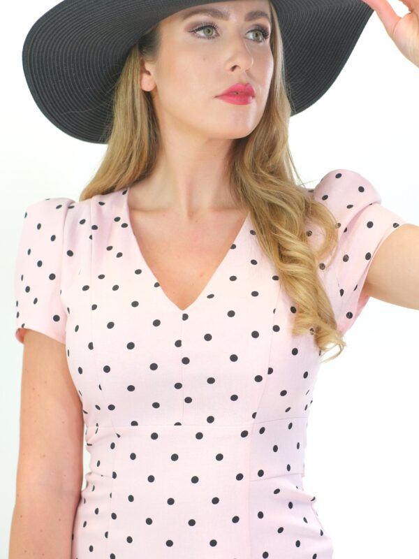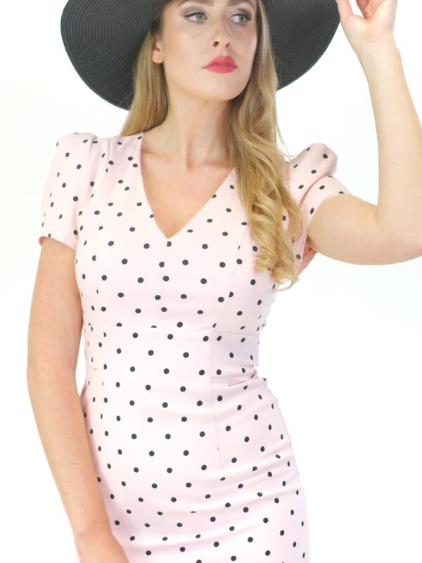 Šaty sú navrhnuté v úzkom puzdrovom strihu, ktorý sa výborne prispôsobí Vašej postave. Šaty sú ušité s vloženým opaskom, ktorý Vám opticky zúži a vytvaruje pás. Šaty majú výstrih v tvare v, ktorý skvele dopĺňa prepracovaný strih. Šaty majú na rukávoch proti-záhyby, čím ramenám dodávajú objem a šatám eleganciu. Zároveň pôsobia ako efektný kontrast zúženému pásu. Šaty sú navrhnuté v jemnom bodkovom vzore, ktorý dominuje letným sezónam už dlhé desaťročia. Skombinujte čiernou bodku s pastelovo ružovým podkladom s čiernymi doplnkami a dodajte šatám gráciu a eleganciu.
