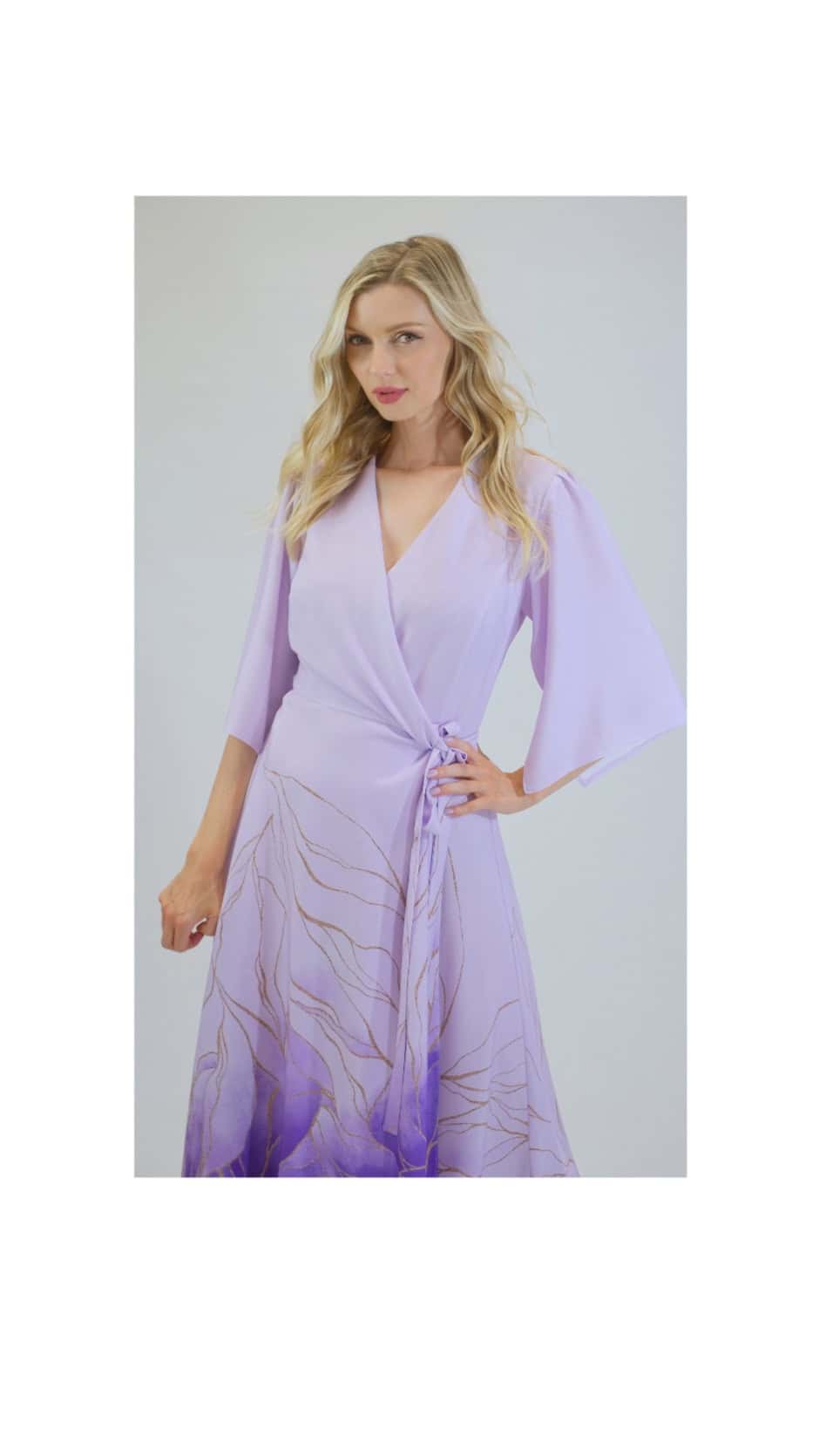 Šaty sú navrhnuté vo výraznom fialovom motíve, ktorý necháva vyniknúť postavu, a zároveň zakryje drobné nedostatky v oblasti bokov. Šaty majú výraznú fialovú bordúru, ktorá sa postupne zjemňuje do pastelového odtieňa. Šaty sú ušité v zvinovaciom strihu, ktorý výborne sedí postavám ktoré majú výrazný dekolt a boky. Šaty majú voľné bohémske rukávy, ktoré im dodávajú na pohodlnosti. Šaty sa skvele hodia na letnú oslavu alebo svadbu pre svadobné mami, ale aj pre hostí. Šaty kombinujte so zlatými doplnkami a sami uvidíte ako v nich vyniknete.