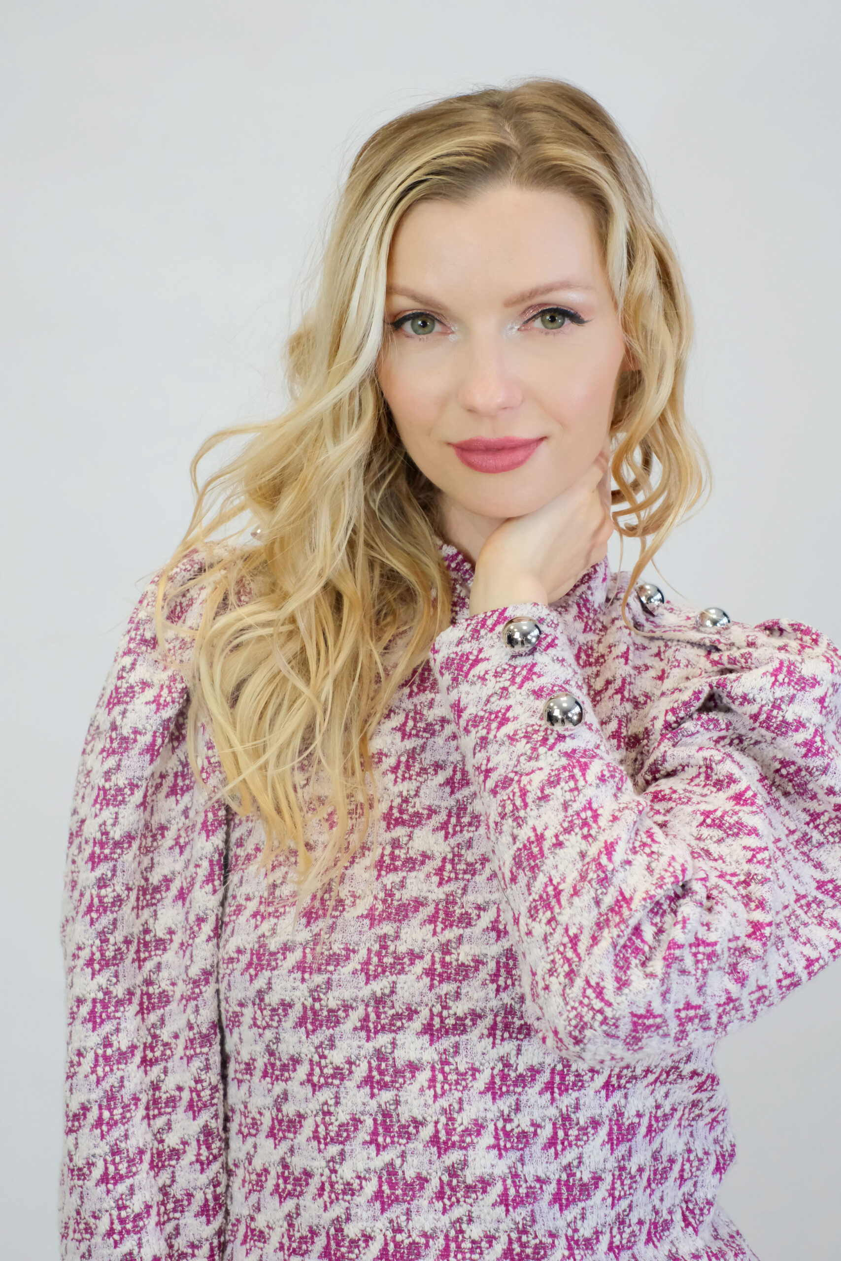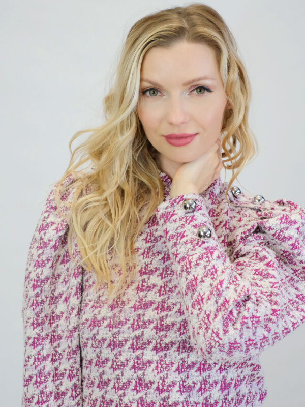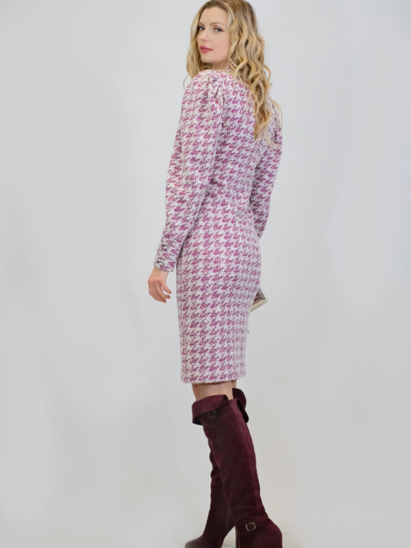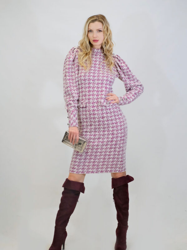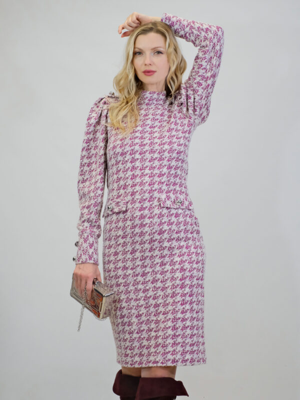 Šaty sú ušité z príjemného, elastického a teplého materiálu, ktorý sa vám prispôsobí. Šaty sú navrhnuté v jednom z najznámejších vzorov takzvanej kohútiej stopy, ktorý sa na módnych mólach pohybuje už dlhé desaťročia. Výrazný materiál, ktorý kombinuje ružovú a bielu najlepšie vynikne na jednoduchom strihu. Najvýraznejším detailom na strihu sú riasené rukávy v oblasti ramien. Šaty majú ozdobné gombíky na rukávových manžetách a vreckách.
