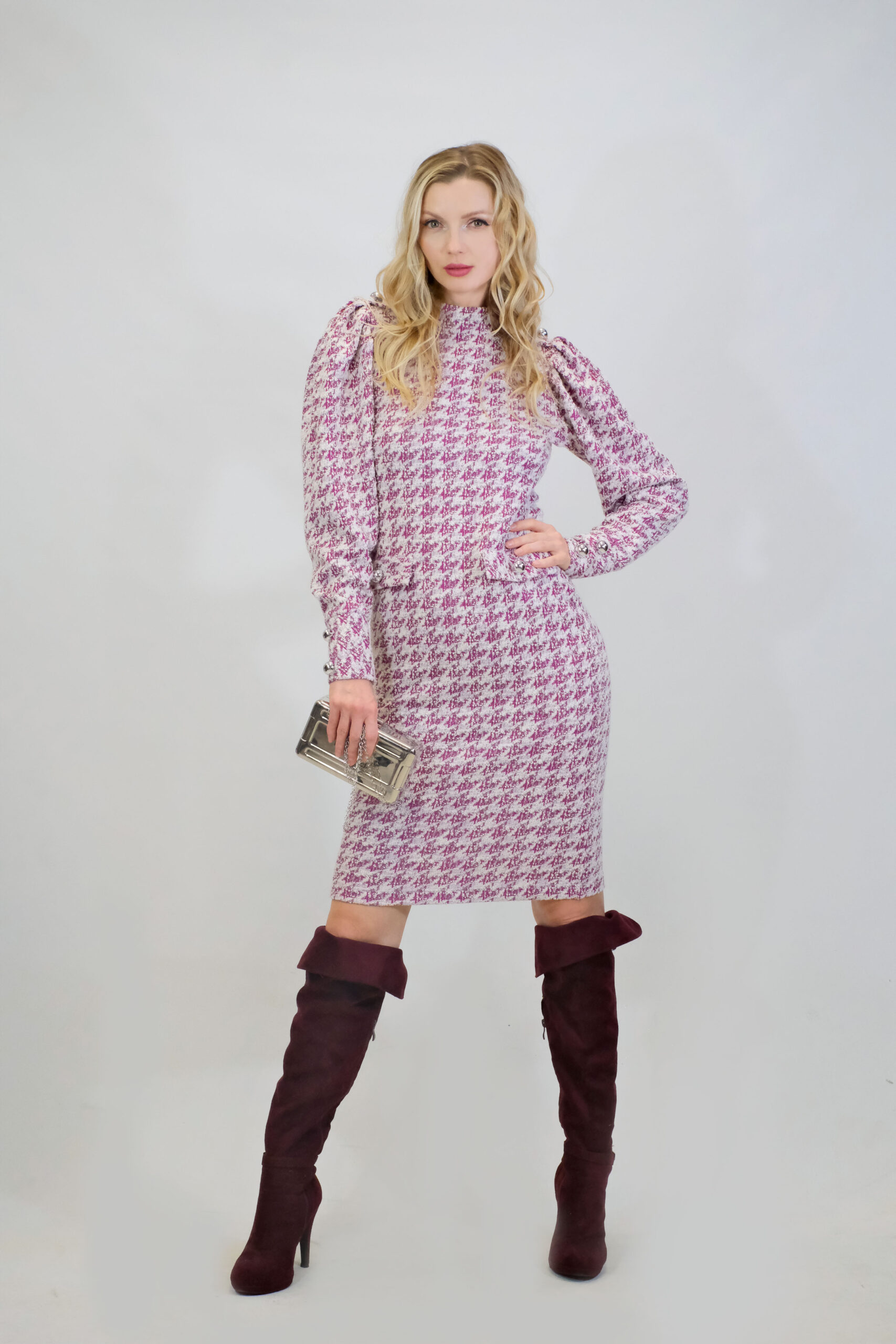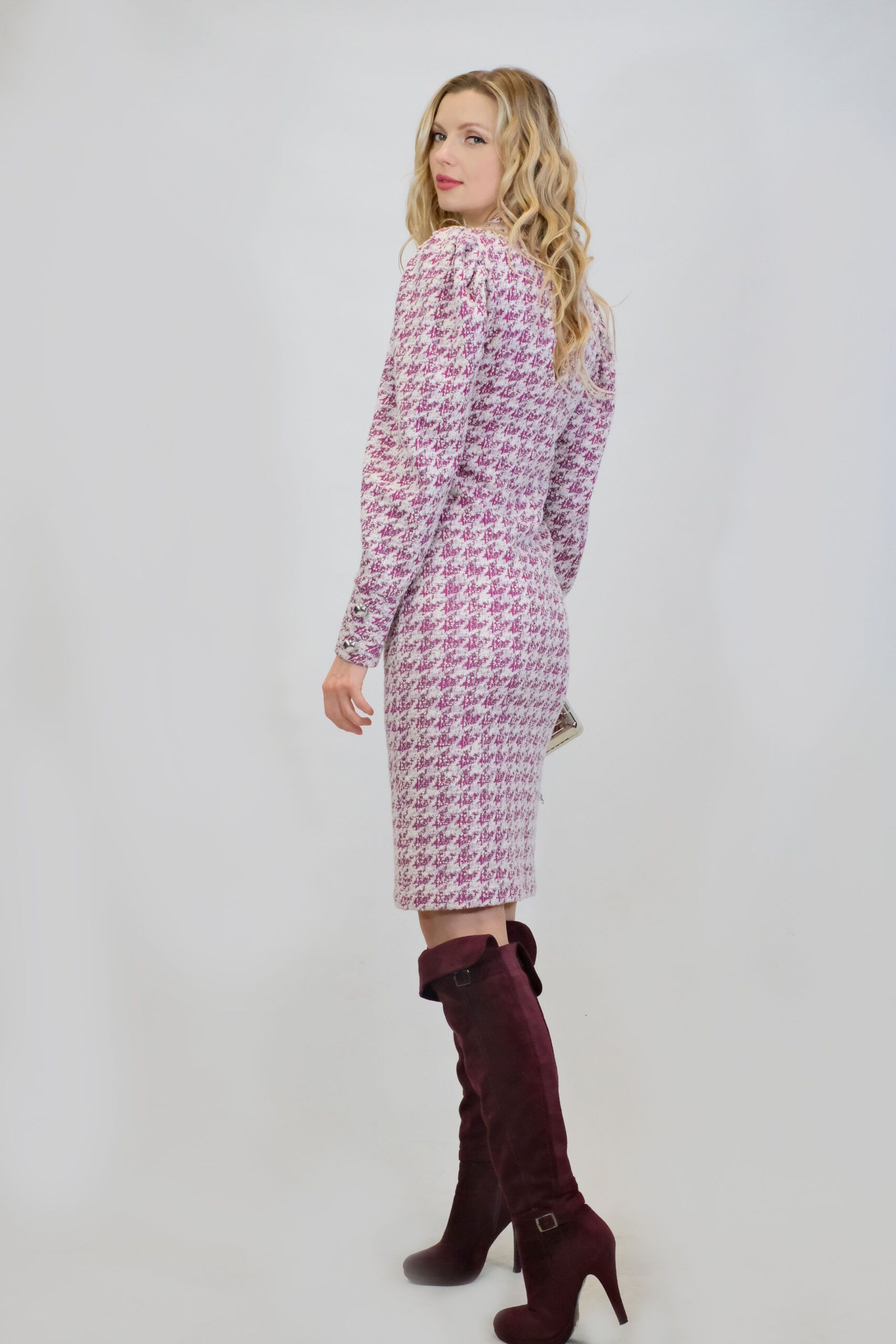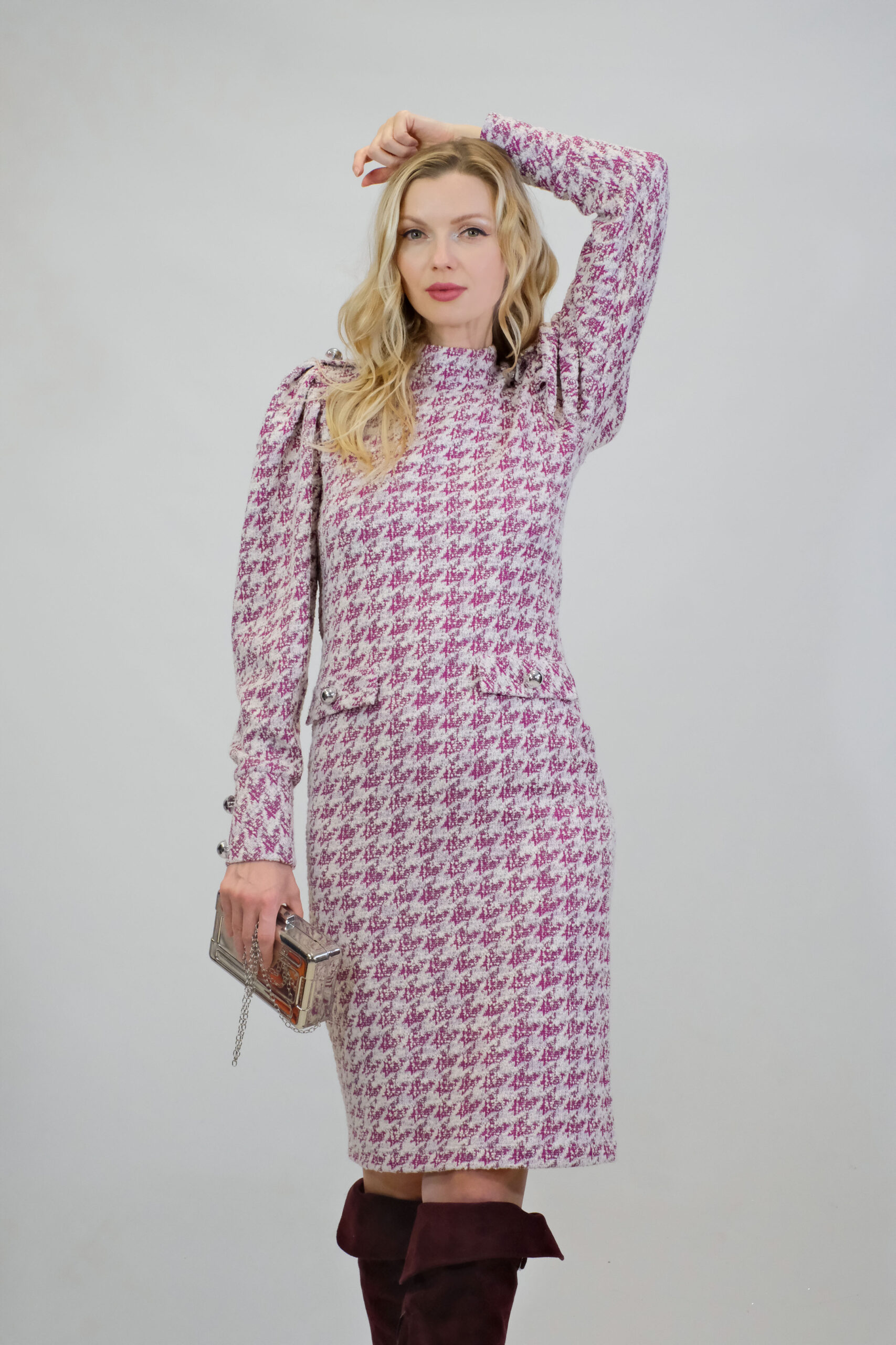 Šaty sú ušité z príjemného, elastického a teplého materiálu, ktorý sa vám prispôsobí. Šaty sú navrhnuté v jednom z najznámejších vzorov takzvanej kohútiej stopy, ktorý sa na módnych mólach pohybuje už dlhé desaťročia. Výrazný materiál, ktorý kombinuje ružovú a bielu najlepšie vynikne na jednoduchom strihu. Najvýraznejším detailom na strihu sú riasené rukávy v oblasti ramien. Šaty majú ozdobné gombíky na rukávových manžetách a vreckách.
