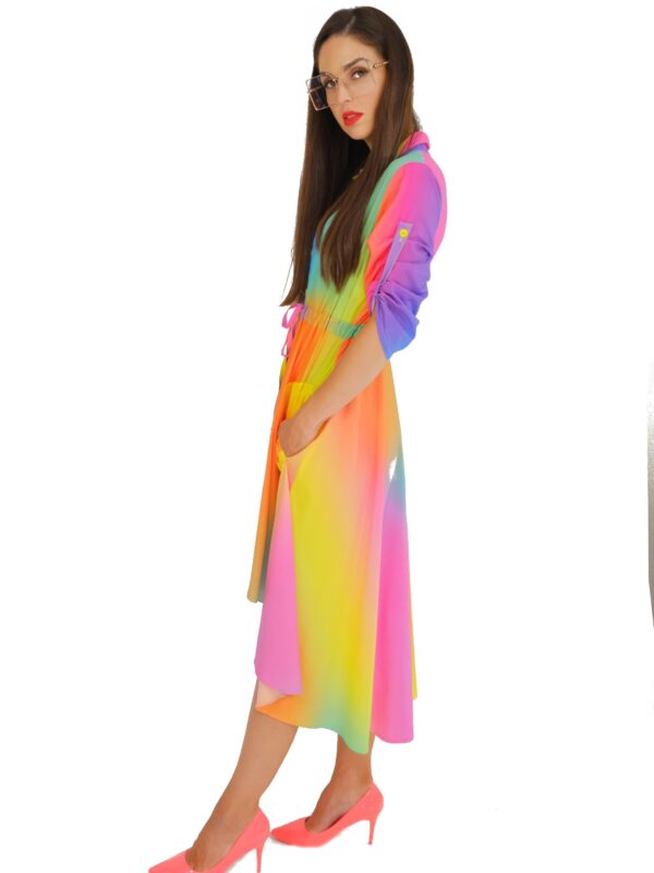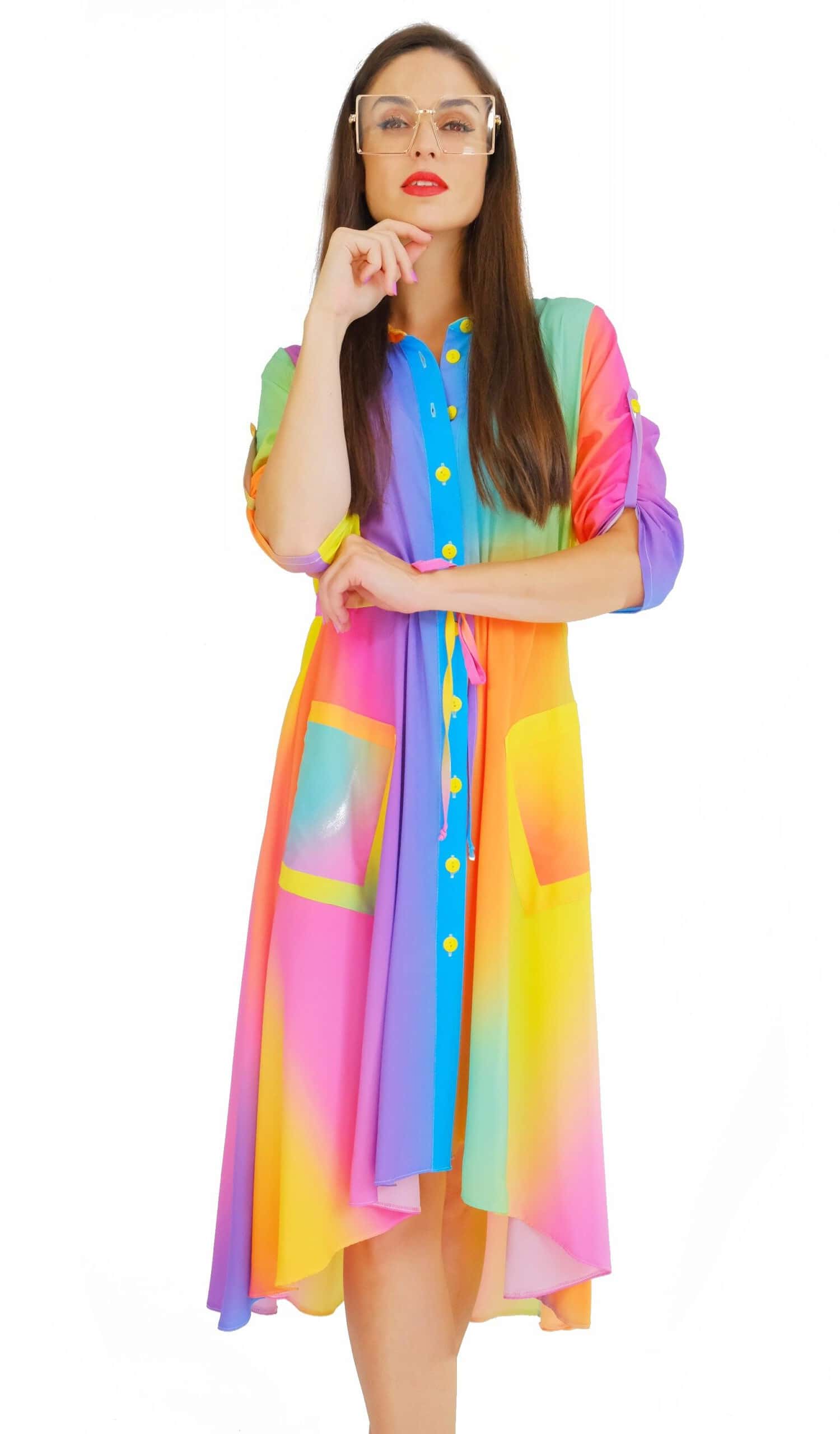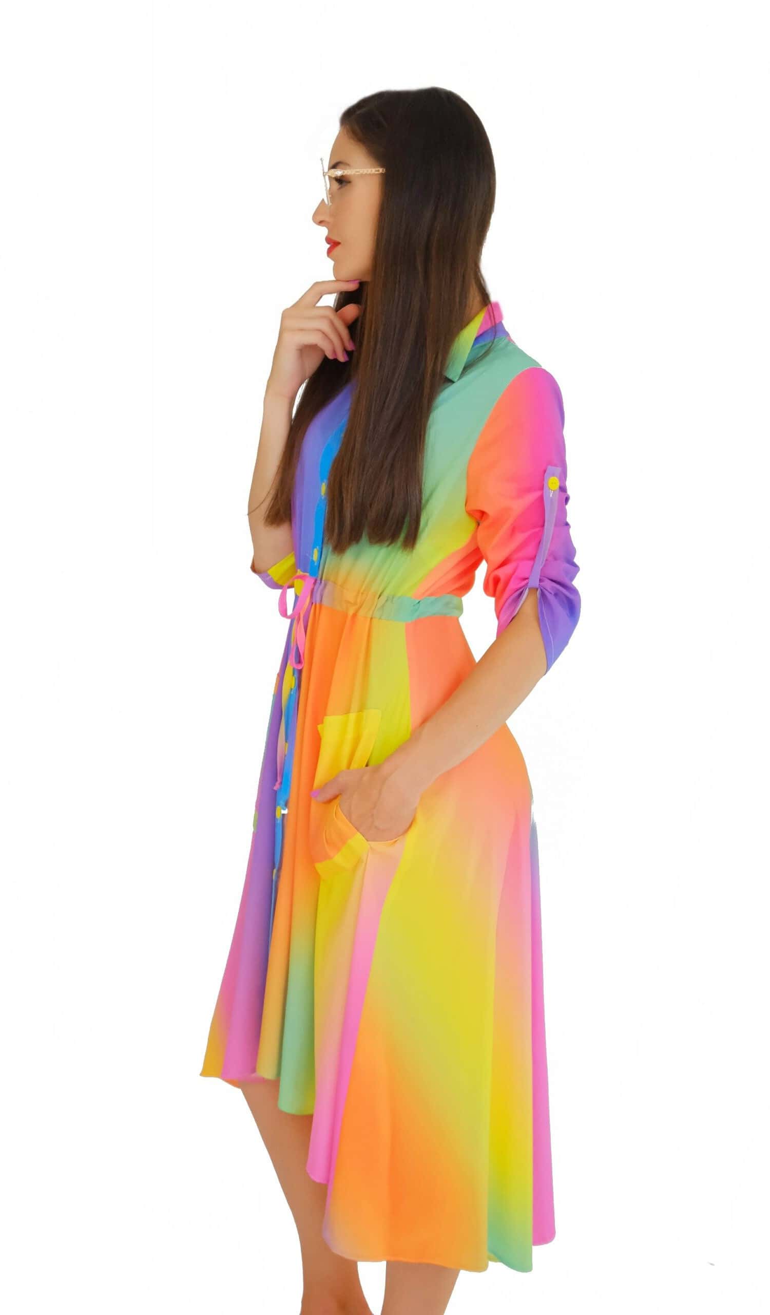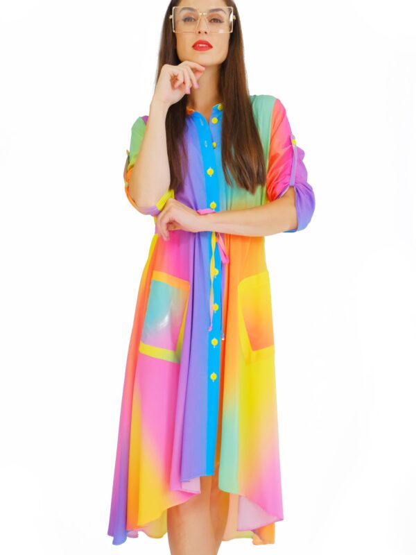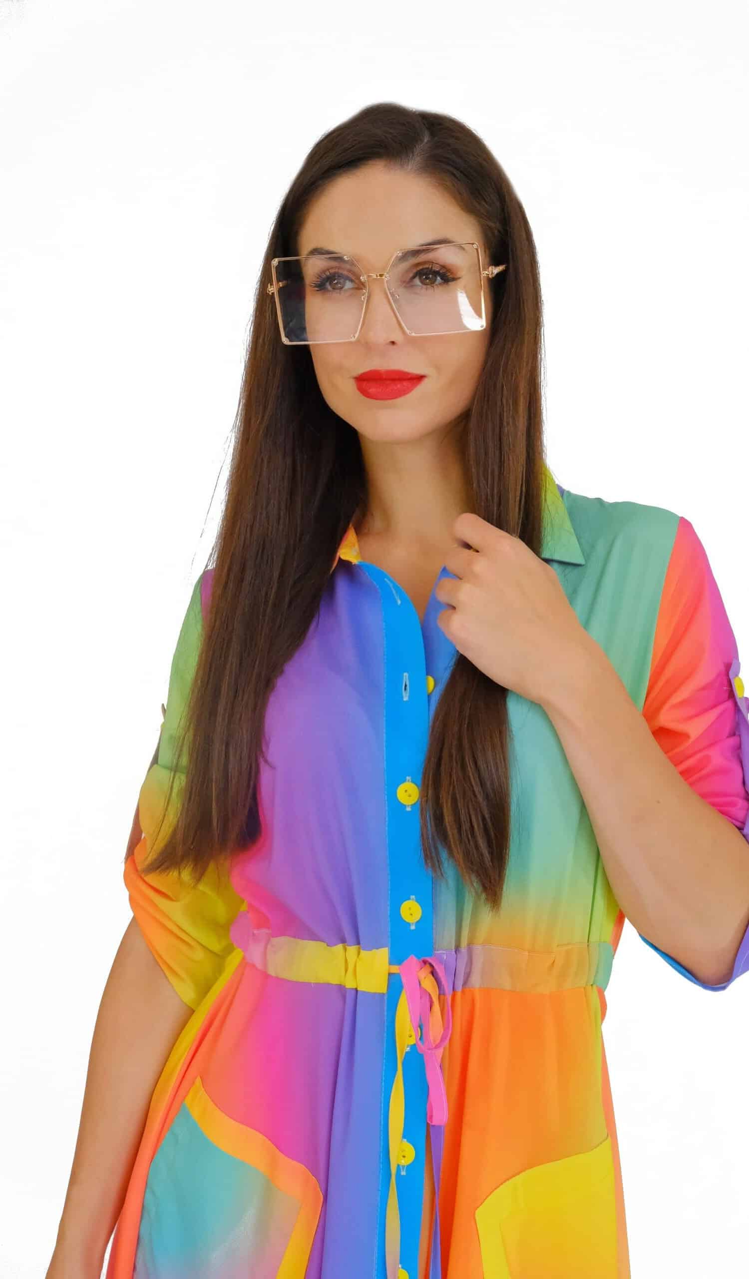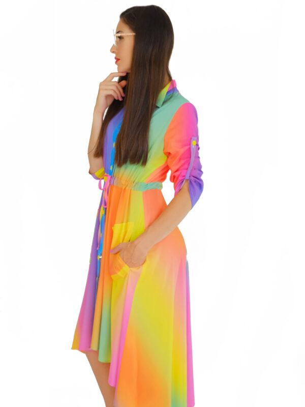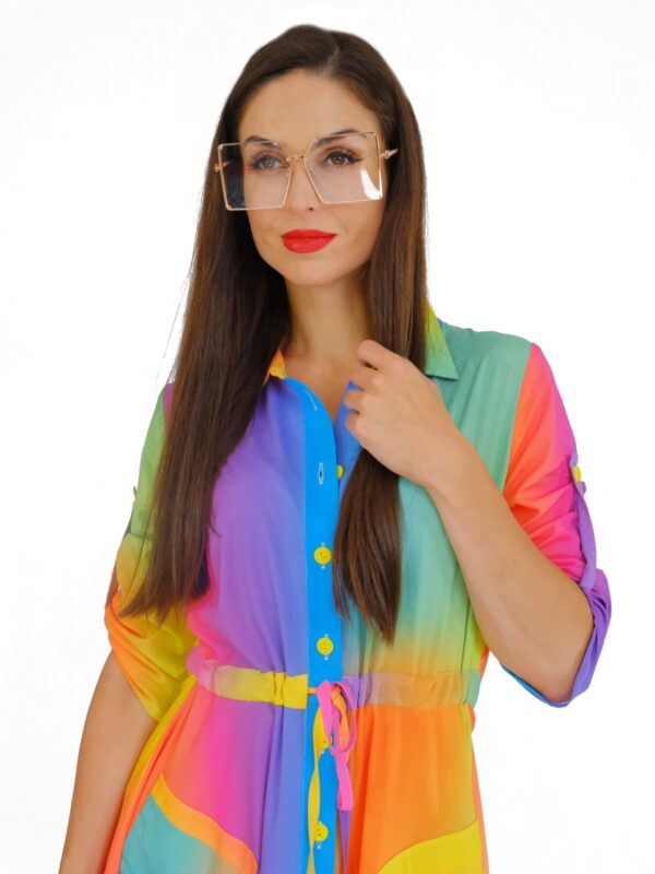 Šaty sú navrhnuté v rovnom košeľovom strihu, ktorý sa dá stiahnuť v páse všitým opaskom. Košeľové strihy šiat sú veľmi pohodlné, ležérne a sedia na všetky typy postáv. Šaty su ušité s funkčnými vreckami a v asymetrickom strihu, kedy je predný diel suknice kratší ako zadný. Rukávy na šatách sa dajú vyhrnúť. Šaty žiaria všetkými farbami leta a ľahko ich skombinujete so širokou škálou farieb.