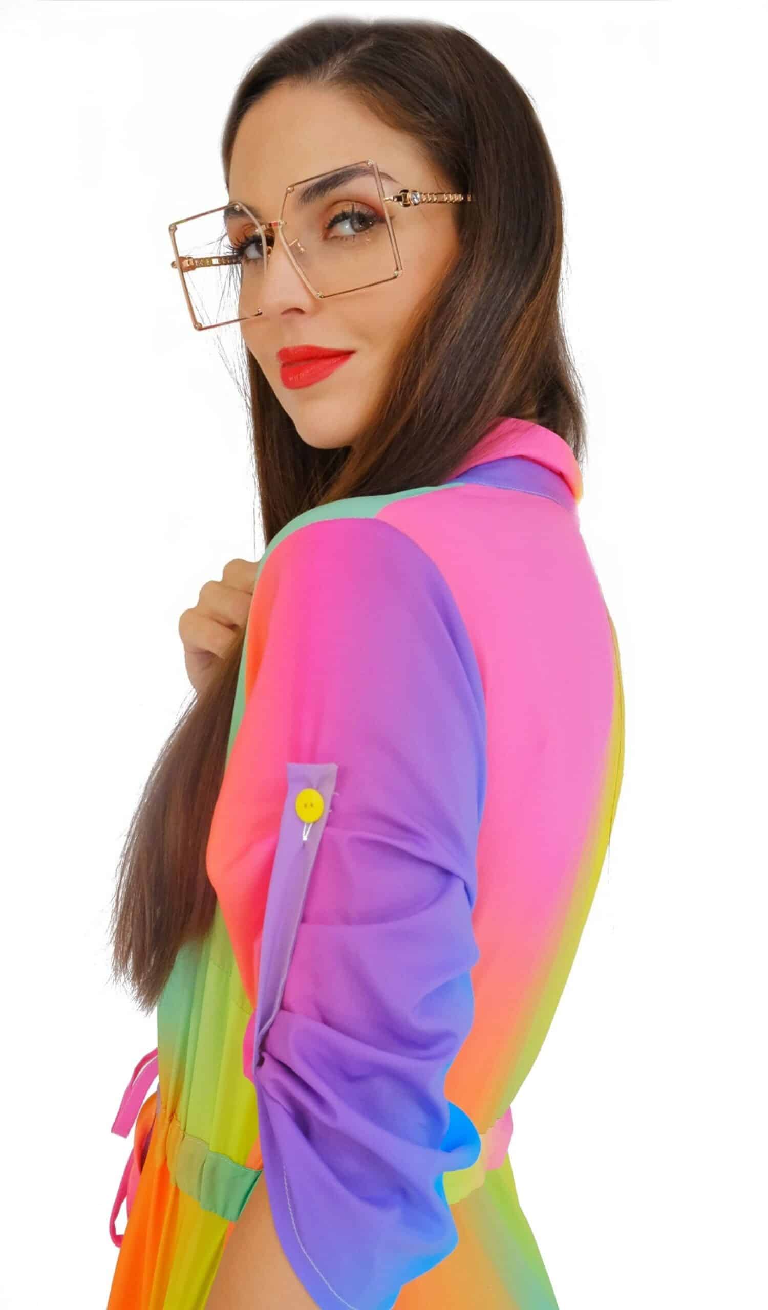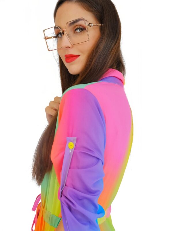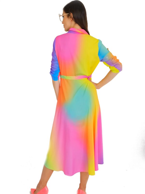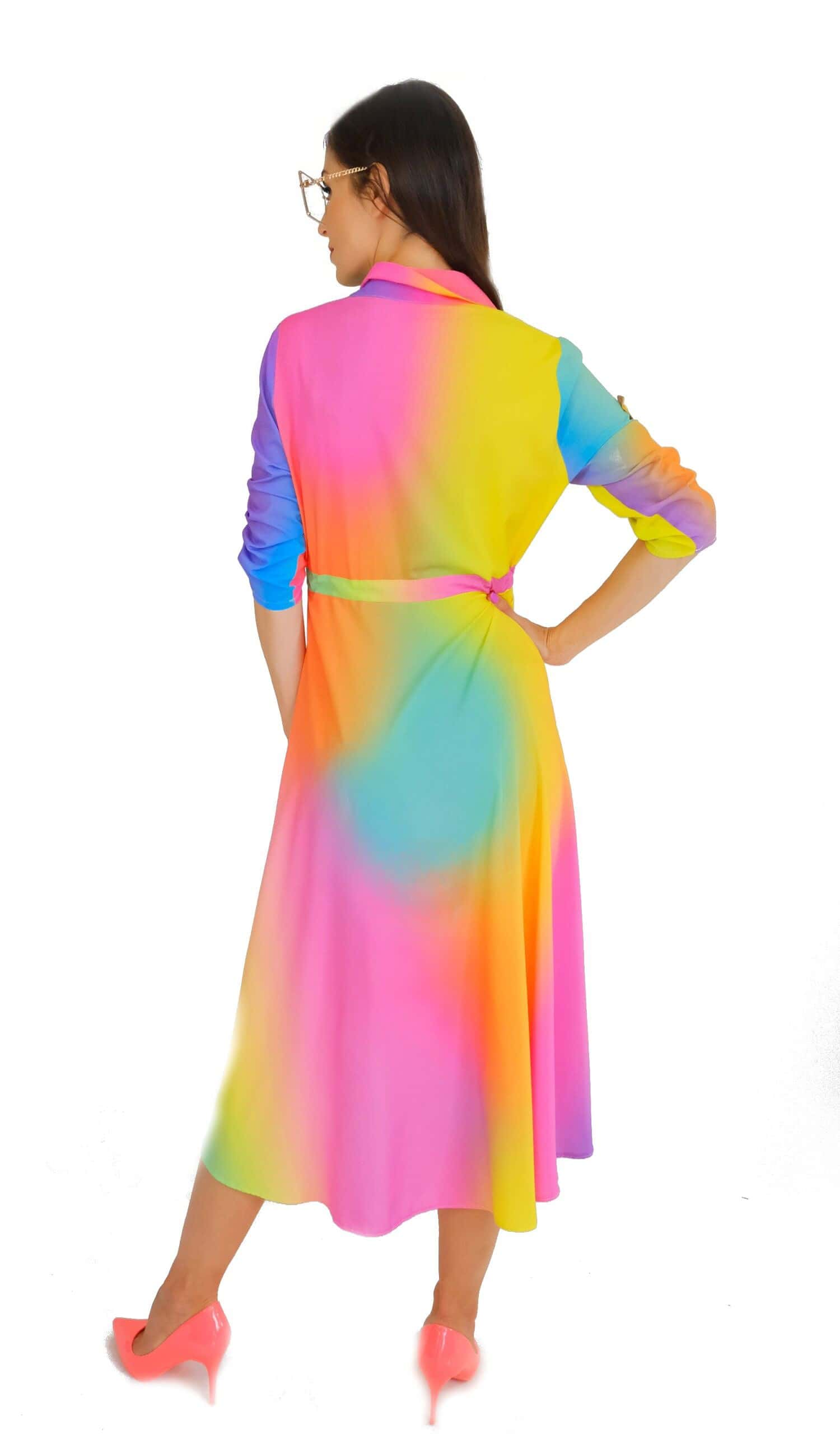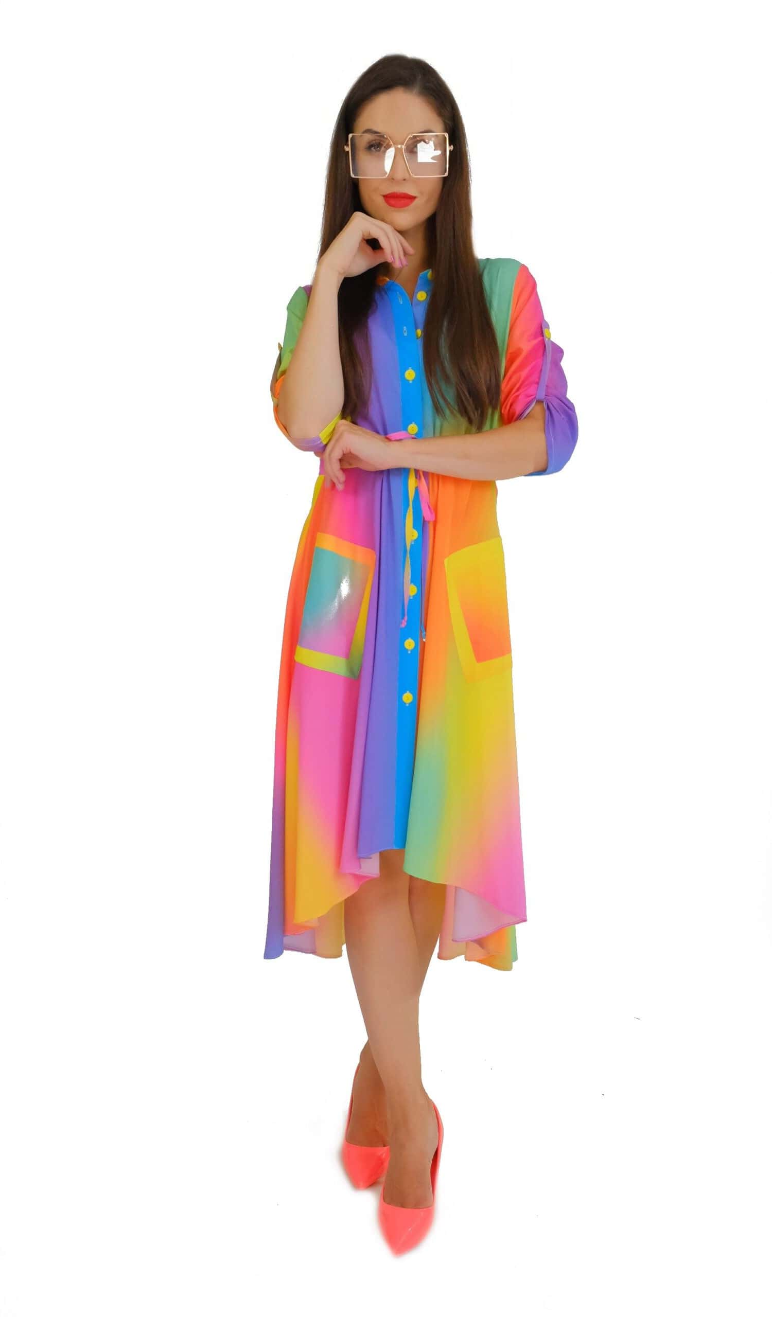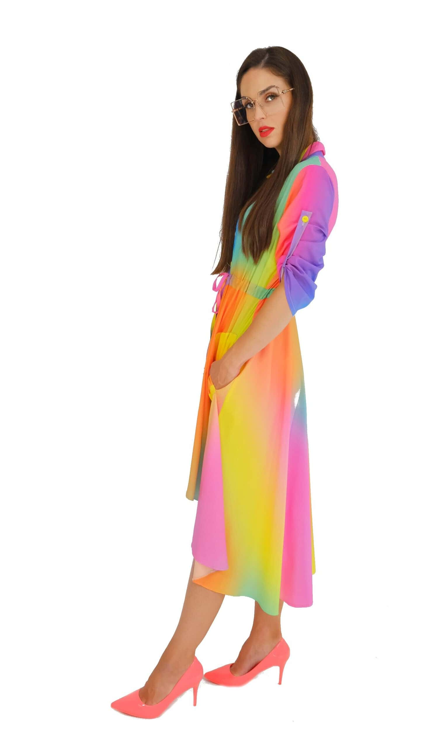Šaty sú navrhnuté v rovnom košeľovom strihu, ktorý sa dá stiahnuť v páse všitým opaskom. Košeľové strihy šiat sú veľmi pohodlné, ležérne a sedia na všetky typy postáv. Šaty su ušité s funkčnými vreckami a v asymetrickom strihu, kedy je predný diel suknice kratší ako zadný. Rukávy na šatách sa dajú vyhrnúť. Šaty žiaria všetkými farbami leta a ľahko ich skombinujete so širokou škálou farieb.