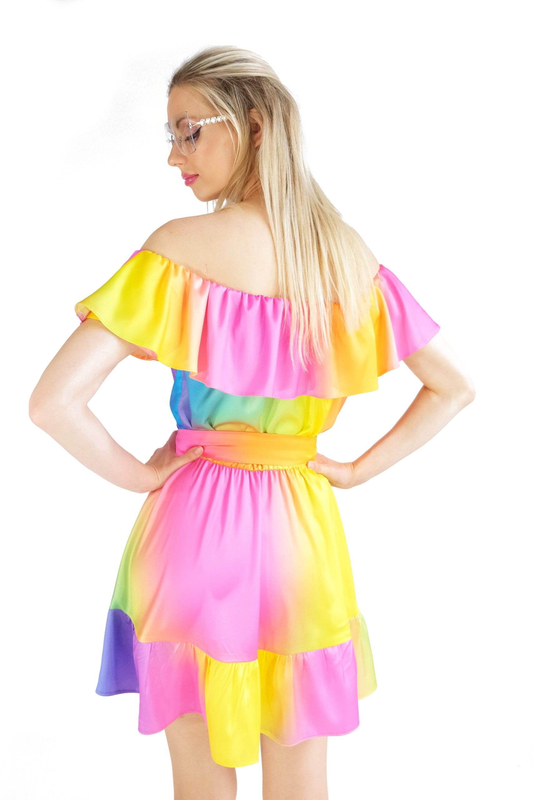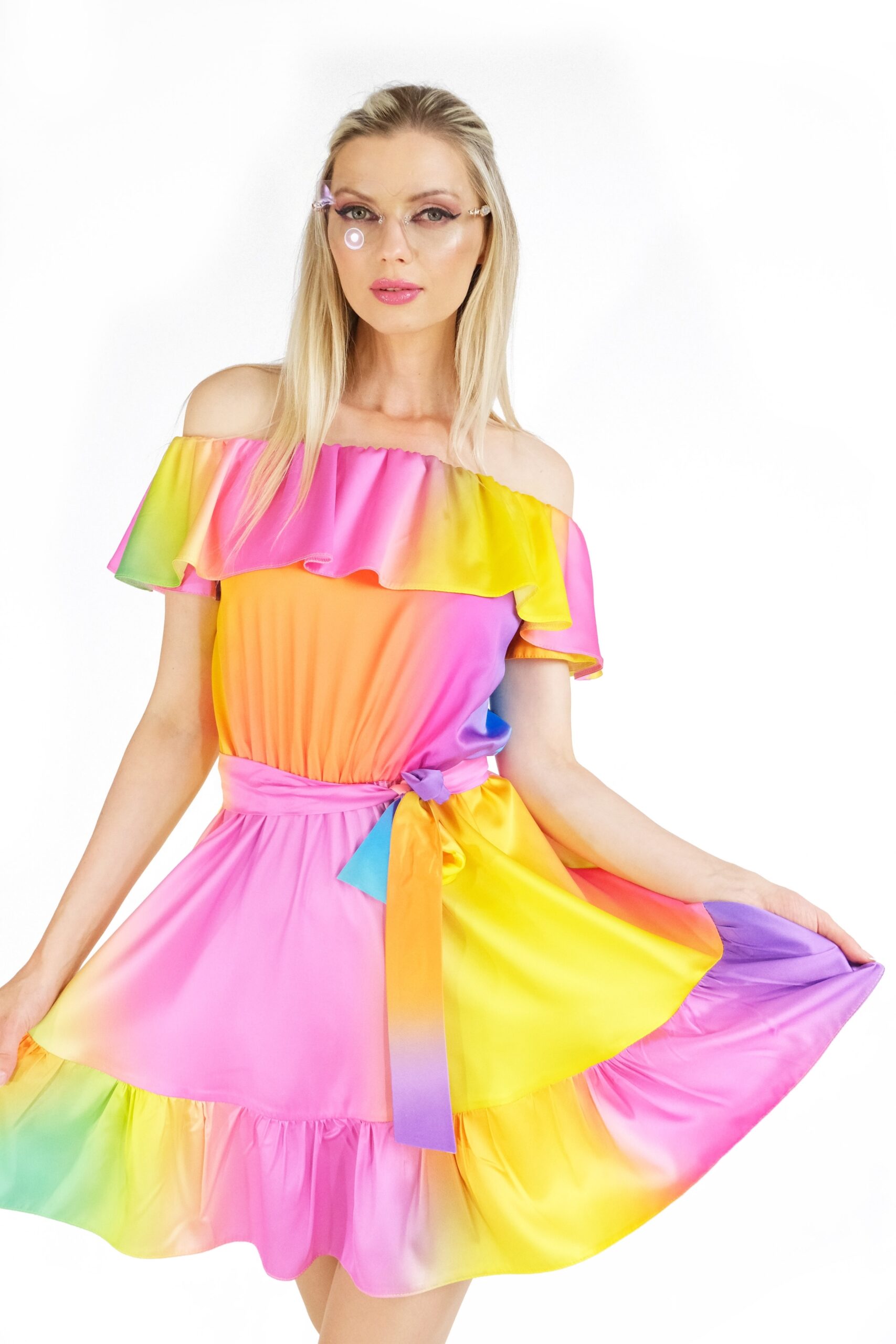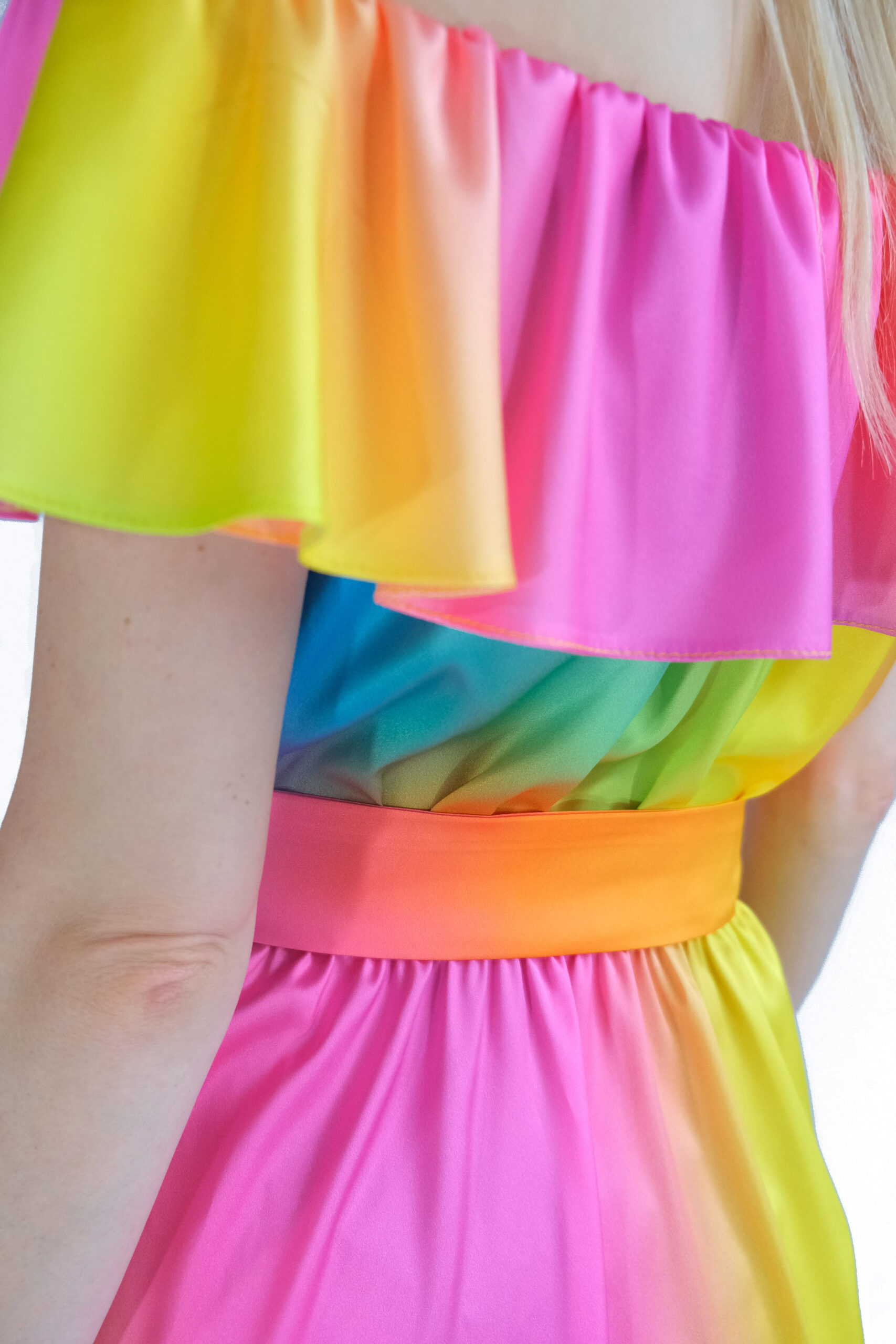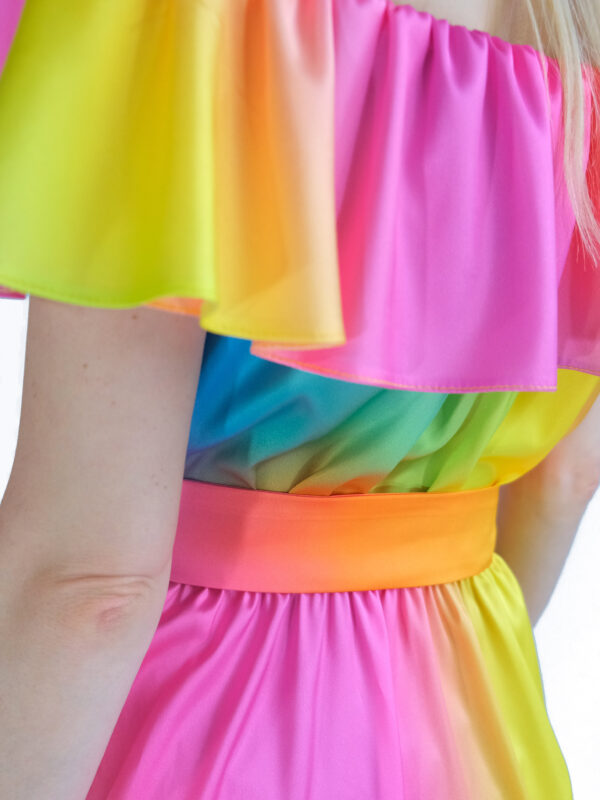 Šaty sú navrhnuté v jednoduchom strihu zúženom v páse gumičkou. Šaty majú áčkovú suknicu, ktorá im dodá na komforte aj počas horúcich letných dní. V kombinácii s kĺzavým a chladivým materiálom sú pestrofarebné šaty ako stvorené na leto. Šaty doslova hrajú všetkými farbami dúhy, ktorú aj pripomínajú, tak ak ste niekdy rozmýšľali , čo je na konci dúhy, tak sú to práve tieto šaty. Skombinujte s veselými letnými doplnkami.