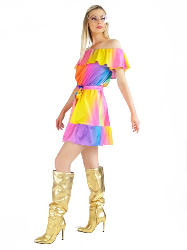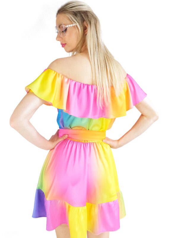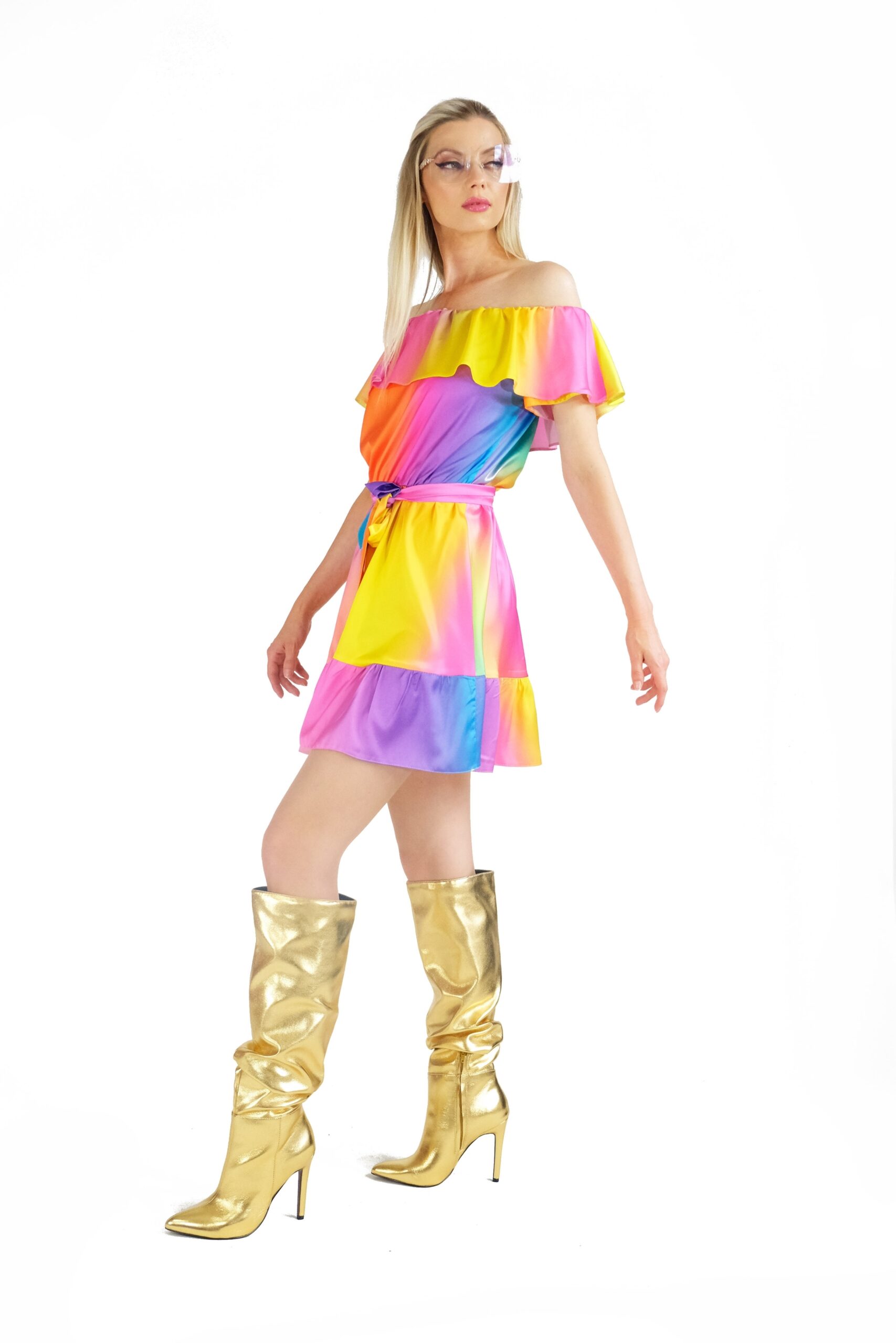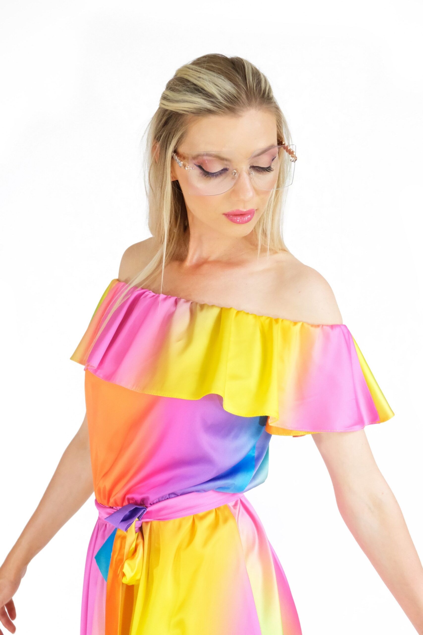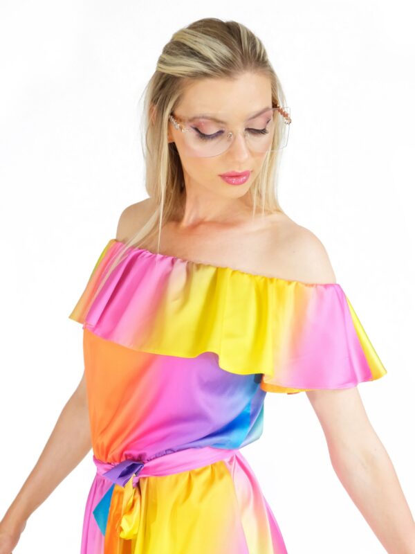Šaty sú navrhnuté v jednoduchom strihu zúženom v páse gumičkou. Šaty majú áčkovú suknicu, ktorá im dodá na komforte aj počas horúcich letných dní. V kombinácii s kĺzavým a chladivým materiálom sú pestrofarebné šaty ako stvorené na leto. Šaty doslova hrajú všetkými farbami dúhy, ktorú aj pripomínajú, tak ak ste niekdy rozmýšľali , čo je na konci dúhy, tak sú to práve tieto šaty. Skombinujte s veselými letnými doplnkami.
