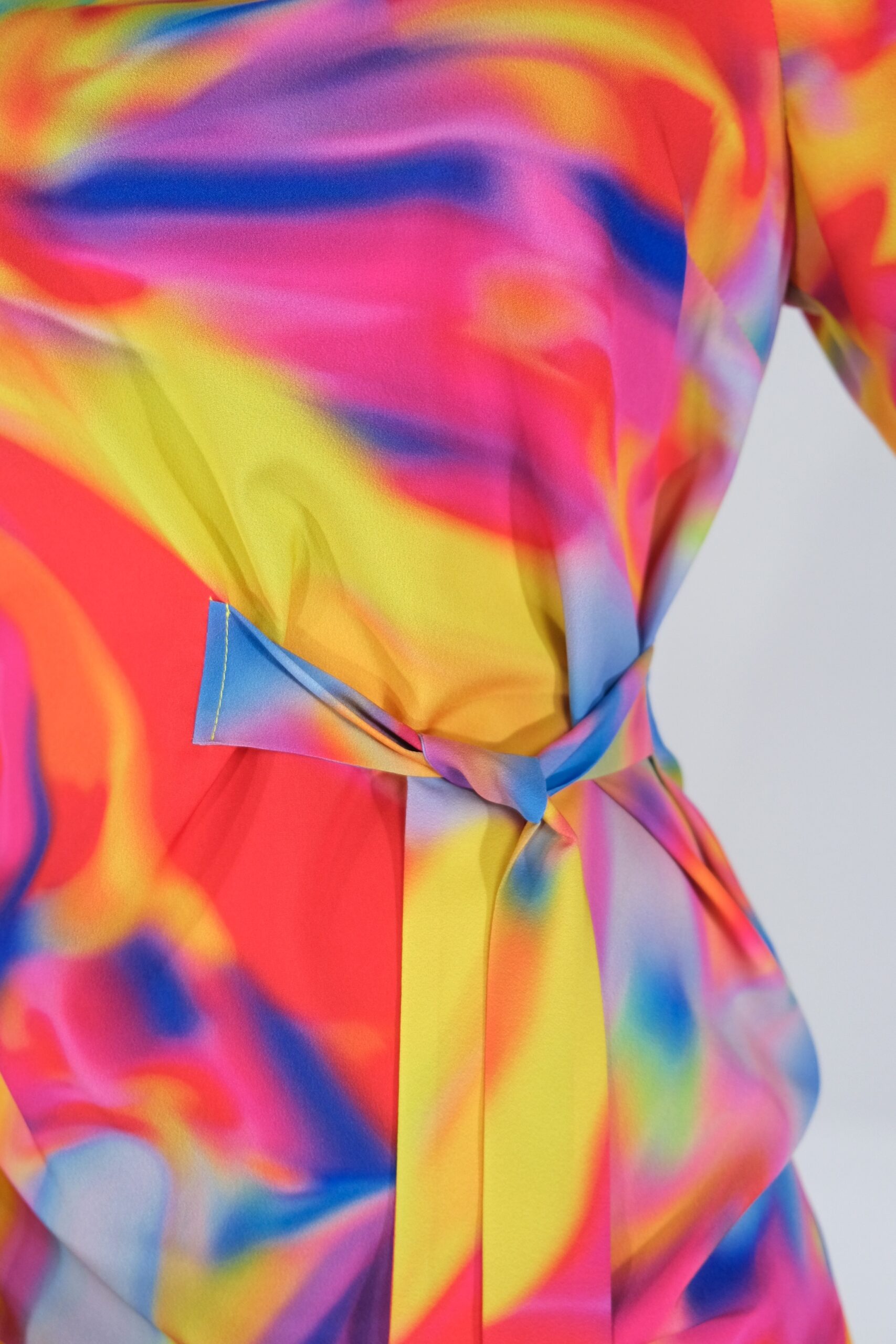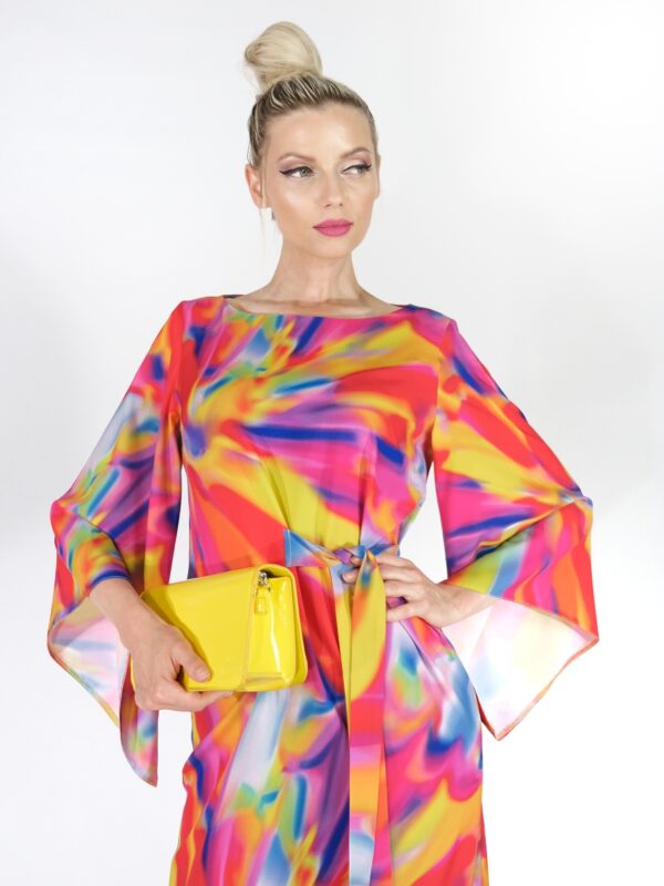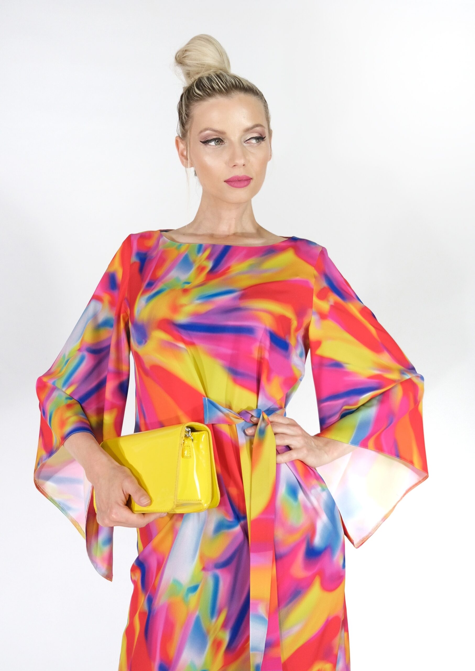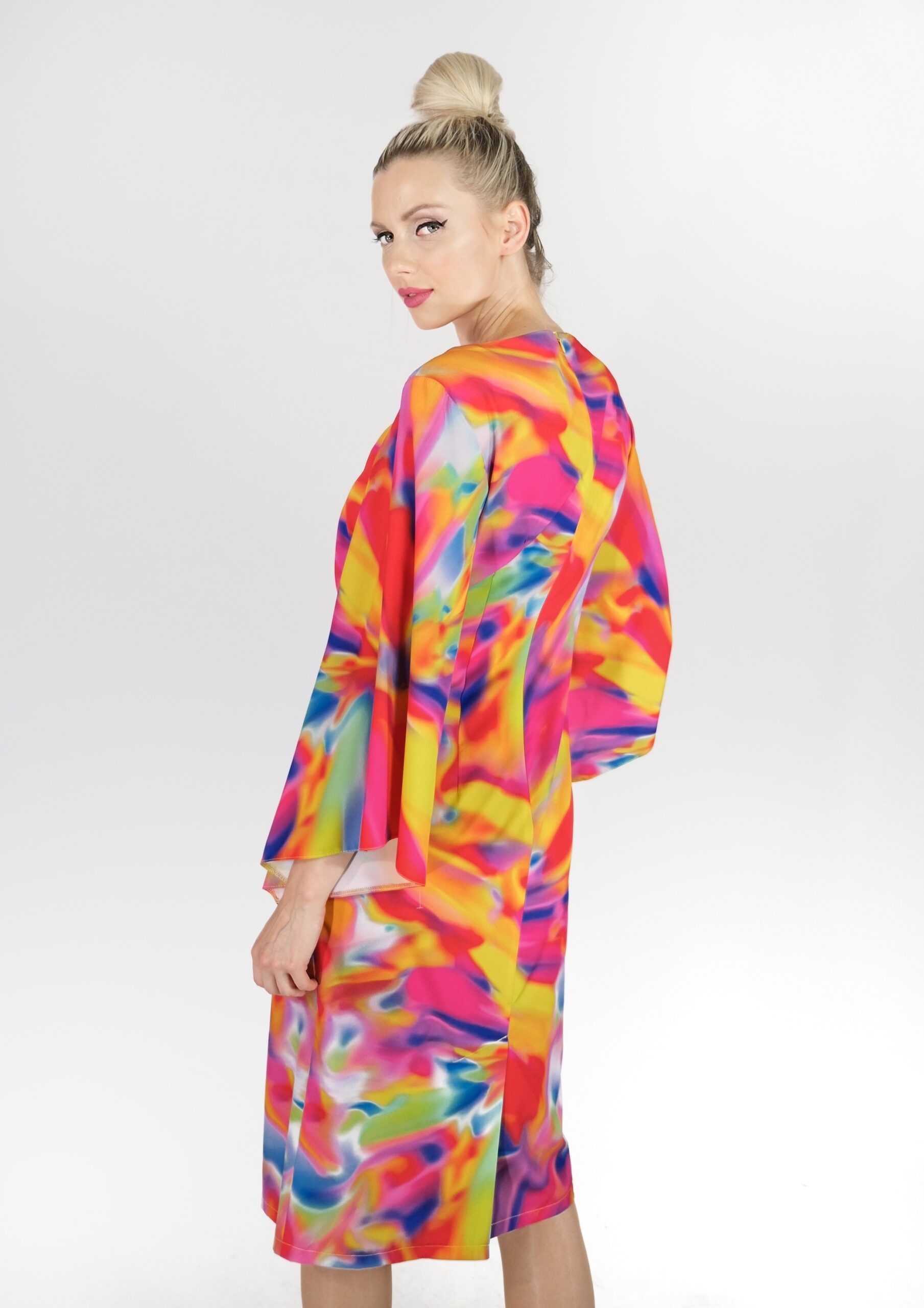 Šaty sú ušité v krásnom farebnom prevedení , ktoré žiari všetkými farbami dúhy. Šaty sú navrhnuté v rovnom strihu , ktorý sa sťahuje do boku a vytvára dojem zvinovacích šiat, ktoré výborne kryjú problematické partie. Šaty majú bohémske rukávy, ktoré Vám spolu s ľahkým letným materiálom zaručia komfort počas celého dňa.