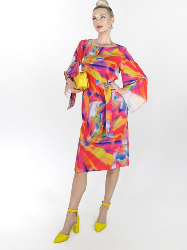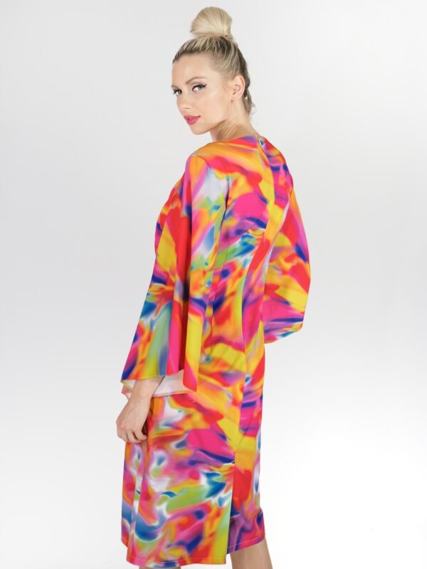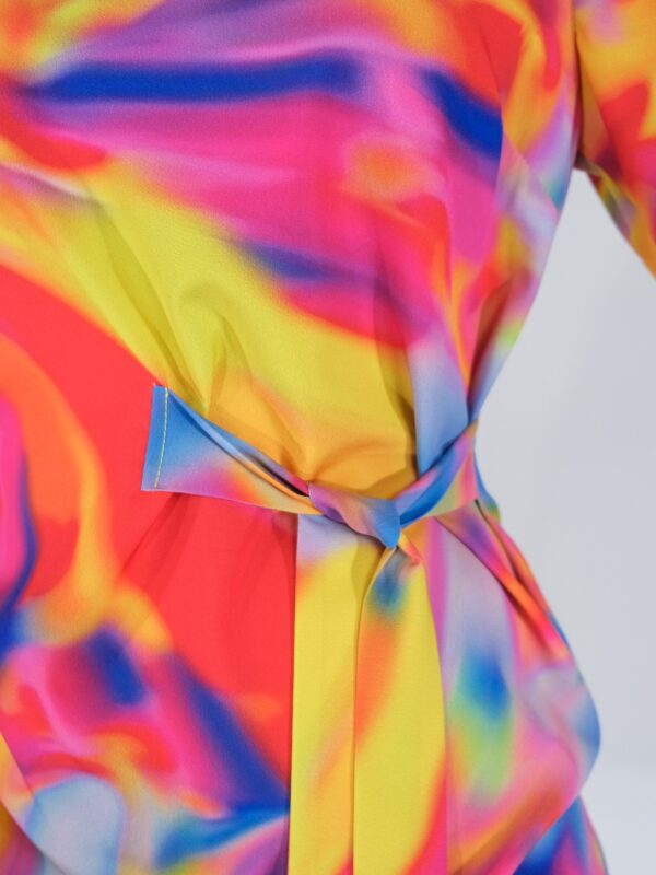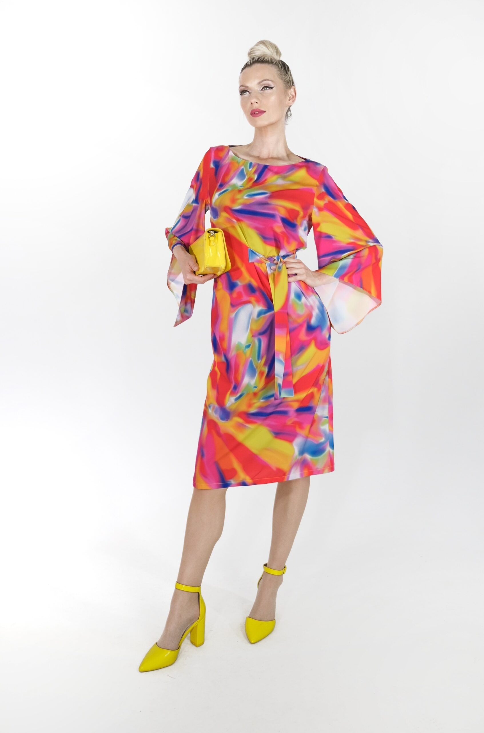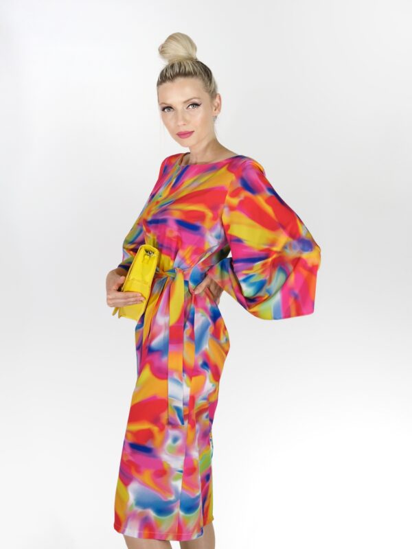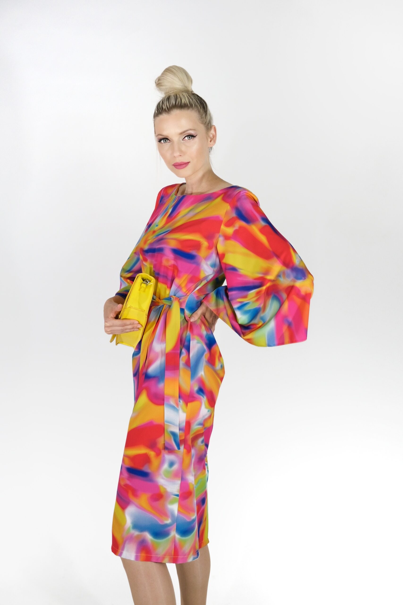 Šaty sú ušité v krásnom farebnom prevedení , ktoré žiari všetkými farbami dúhy. Šaty sú navrhnuté v rovnom strihu , ktorý sa sťahuje do boku a vytvára dojem zvinovacích šiat, ktoré výborne kryjú problematické partie. Šaty majú bohémske rukávy, ktoré Vám spolu s ľahkým letným materiálom zaručia komfort počas celého dňa.