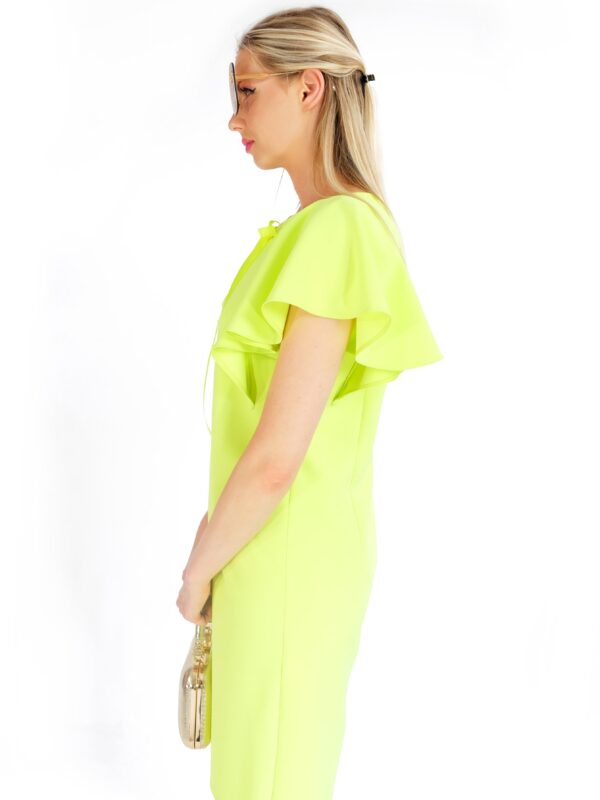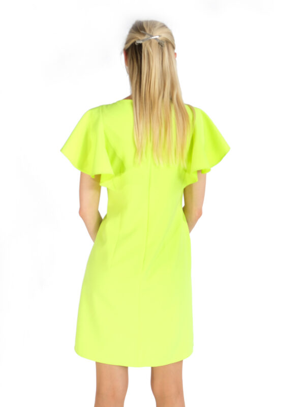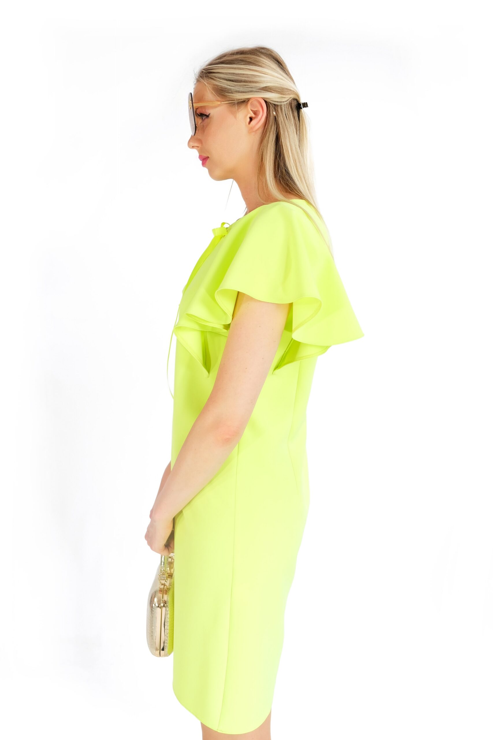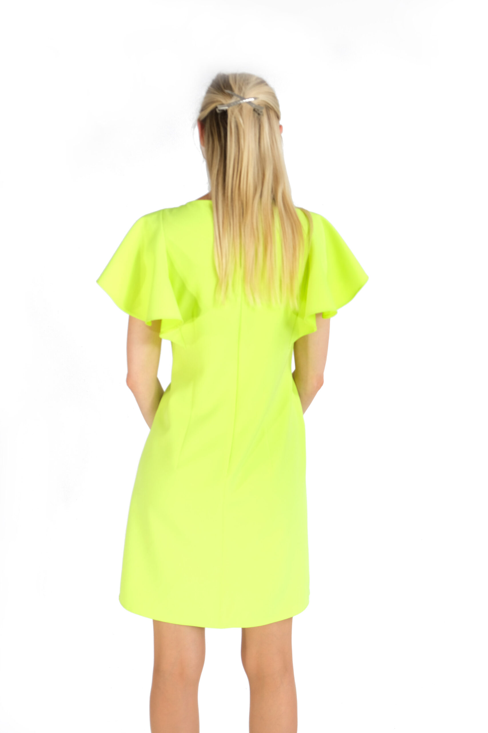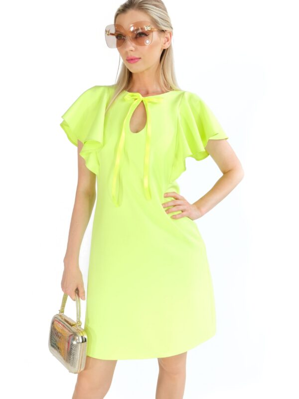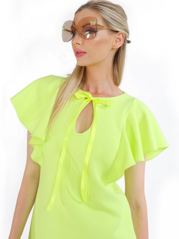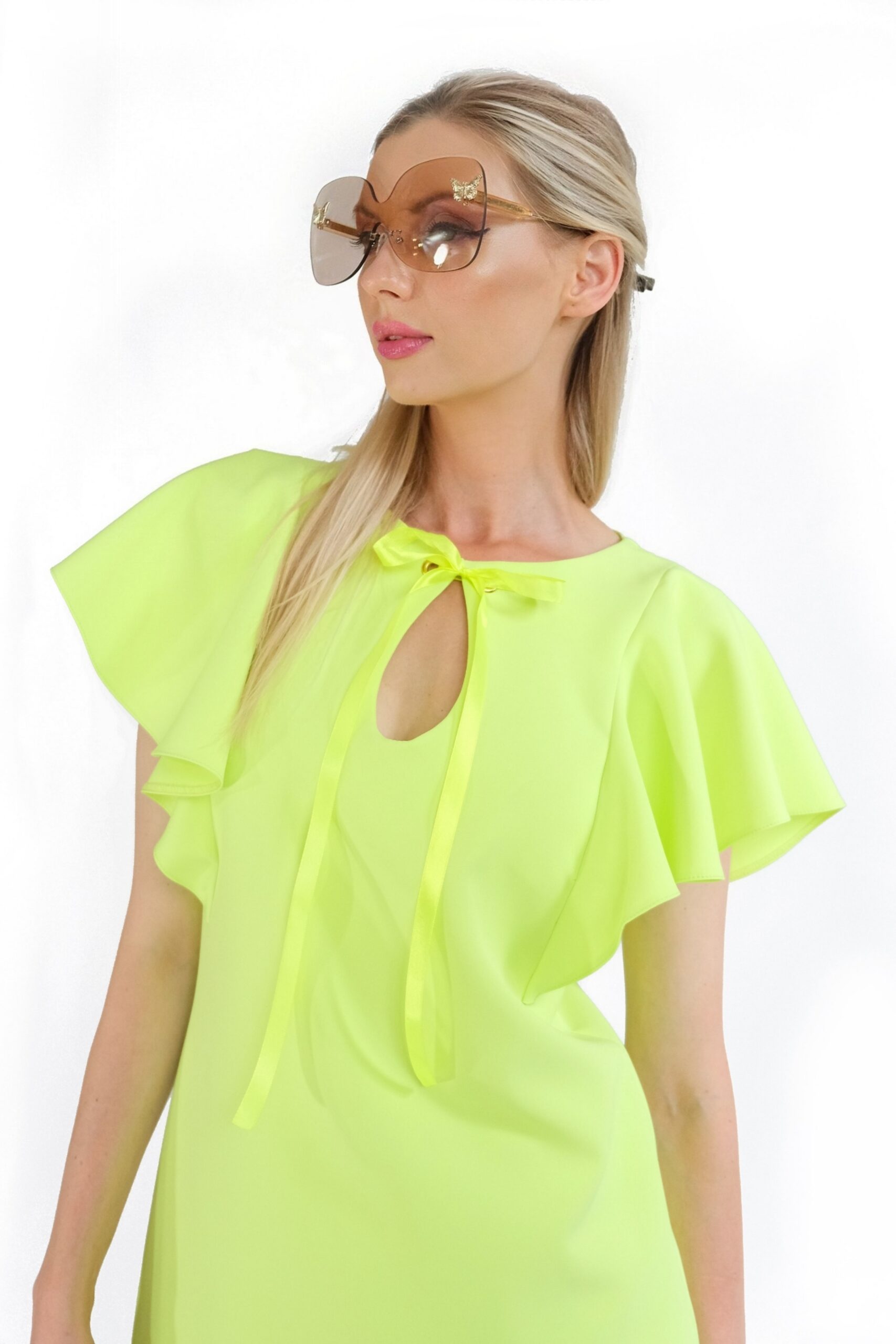 Šaty sú navrhnuté v jednoduchom áčkovom strihu , ktorý výborne sadne na každý typ postavy. Šaty sú ušité v žiarivej slniečkovo-žltej farbe, ktorá rozžiari každý Váš outfit. Zaujímavým detailom sú volánové rukávy, ktoré dodávajú šatám punc elegancie. Šaty si môžete obliecť na letnú slávnosť aj do práce. Skombinujte ich s kontrastnými modrými alebo cyklámenovými doplnkami pre wau effekt.
