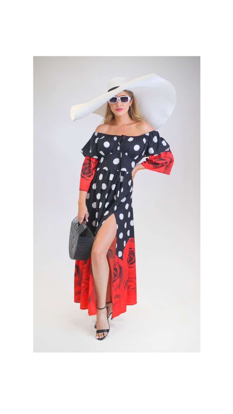 Šaty ako stvorené pre krásny letný večer alebo na vašu dovolenku. Šaty sú ušité v krásnom áčkovom strihu sa zdôrazneným pásom ktorý naplno nechá vyniknúť vašej postave. Šaty sú navrhnuté v nesmrteľnej kombinácii bodiek a krásnych 3-D ruží ktoré nechajú naplno vyniknúť tomuto nádhernému letnému vzoru. Zaujímavým detailom na šatách je riešenie výstrihu ktorý naplno necháva vyniknúť voľnosti tohto strihu. Šaty sú ušité aby sa prispôsobili každej postave a dodali jej na komforte a voľnosti preto som vašim ideálnym spoločníkom na toto leto. Ako nesmrteľný vzor ktorý sa objavuje na mólach módnych návrhárov už niekoľko desaťročí nikdy nevyjdú z módy a ostanú vo vašom šatníku ešte veľmi dlho. Šaty s kombinujte s jednoduchými doplnkami buď čiernej alebo bielej farby, ako naša stylistka.