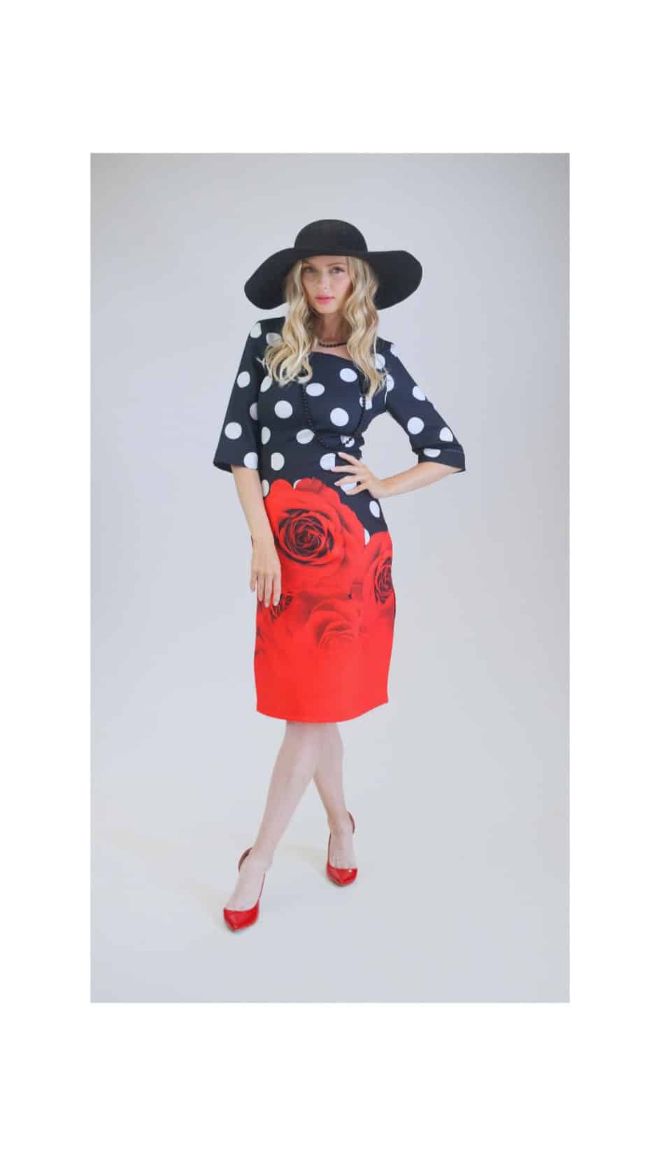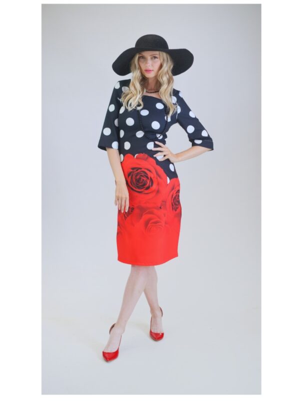 Šaty sú ušité v pozdravom strihu ktorý sa výborne prispôsobí postave. Šaty majú jednoduchý vzor nesmrteľných bodiek a krásnych 3-D autentických ruží. Šaty majú lakťovej rukávy a nechávajú naplno vyniknúť vašej postave. S kombinujte šaty s výraznými červeným doplnkami alebo s čiernobielymi doplnkami a vytvoríte nesmrteľnú klasiku v ktorej zažiarite na každom večierku alebo párty.