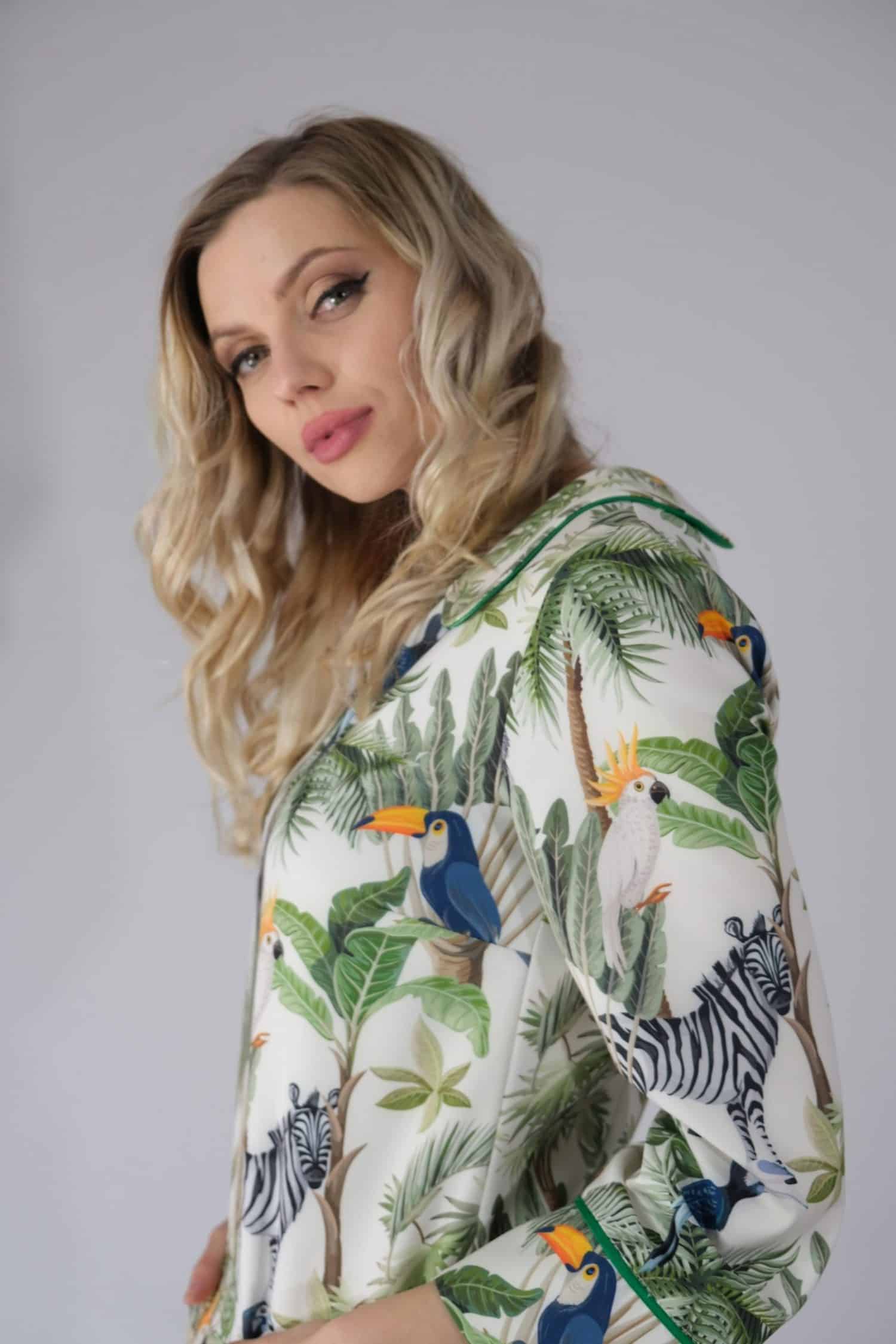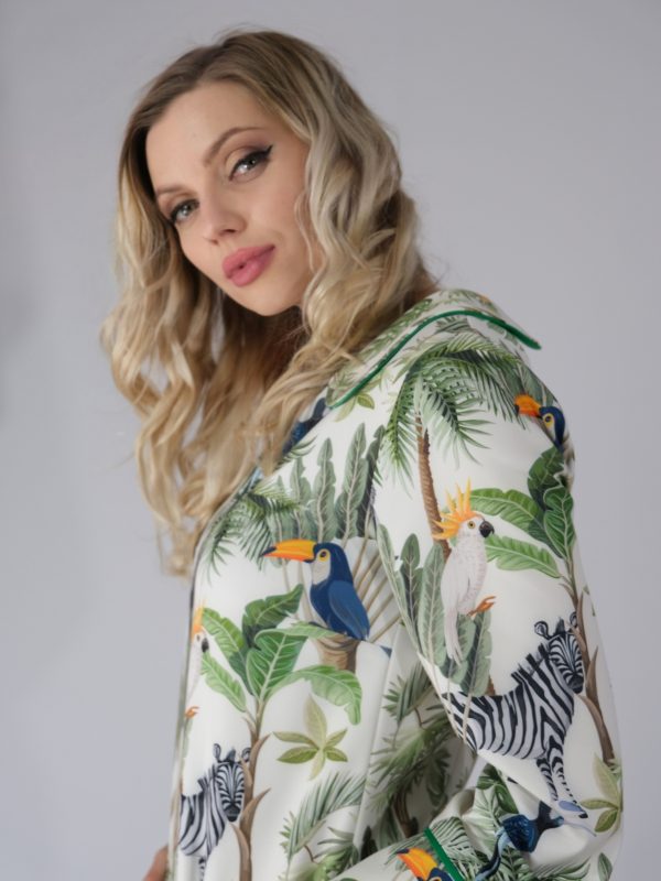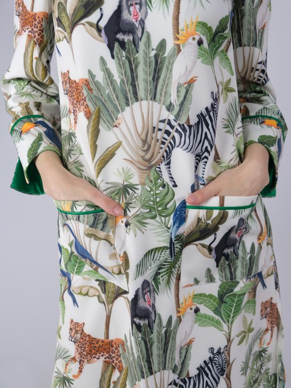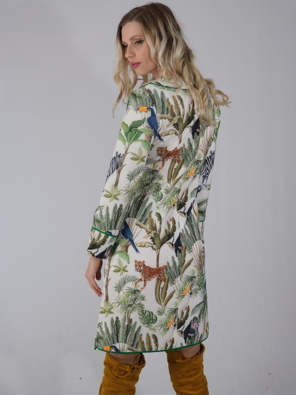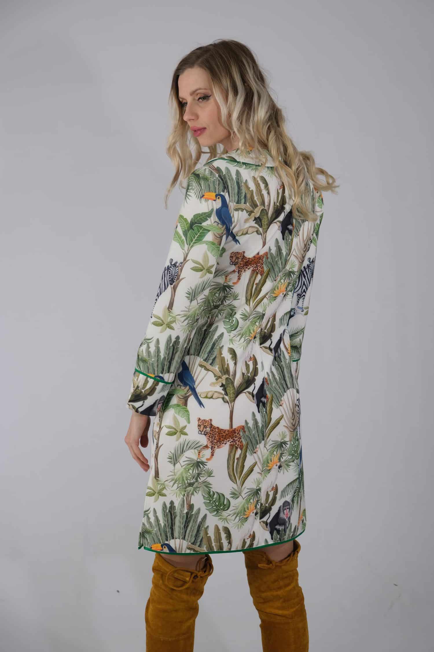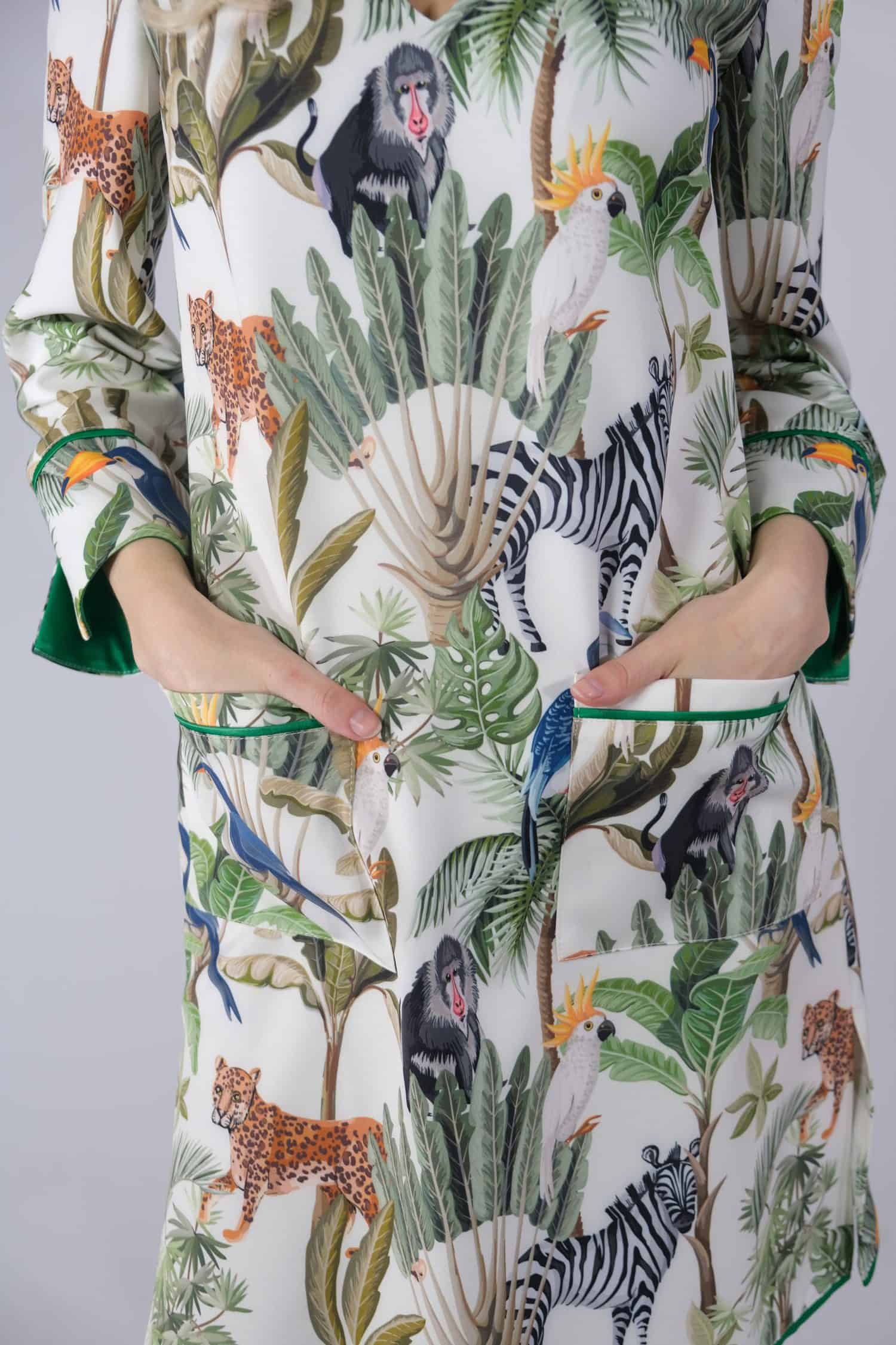Šaty so zvieracím motívom ako vystrihnutým z džungle. Šaty sú ušité v áčkovom strihu, ktorý pristane skvele na každej postave. Šaty majú funkčné vrecká, ktoré im dodávajú nádych ležérnosti. Zaujímavo je riešený golier šiat.