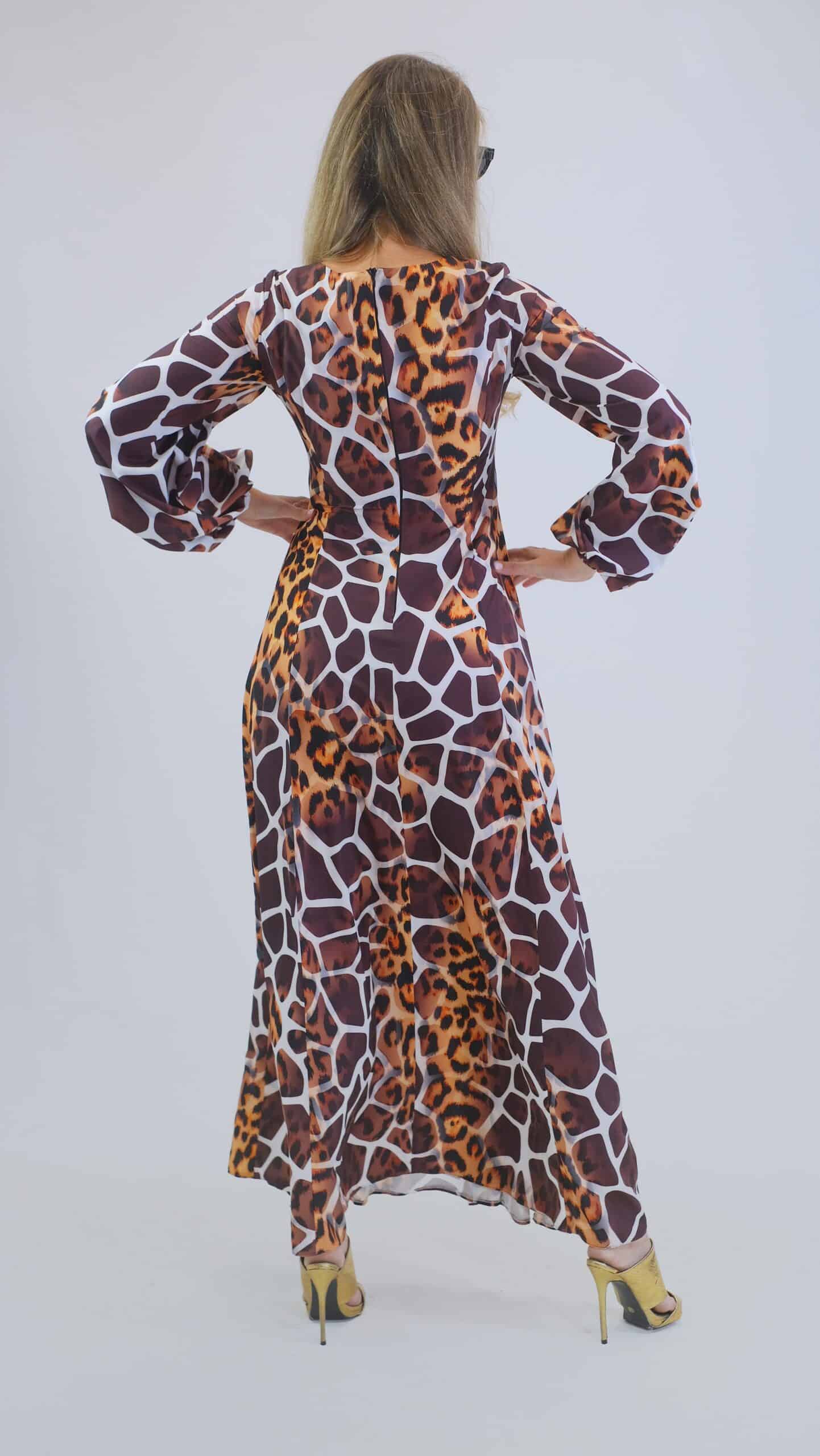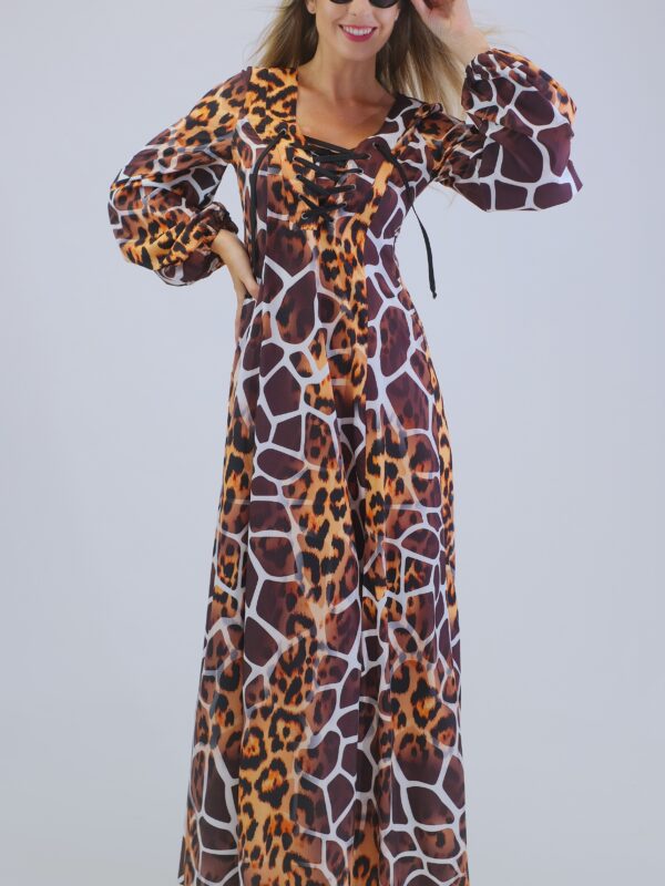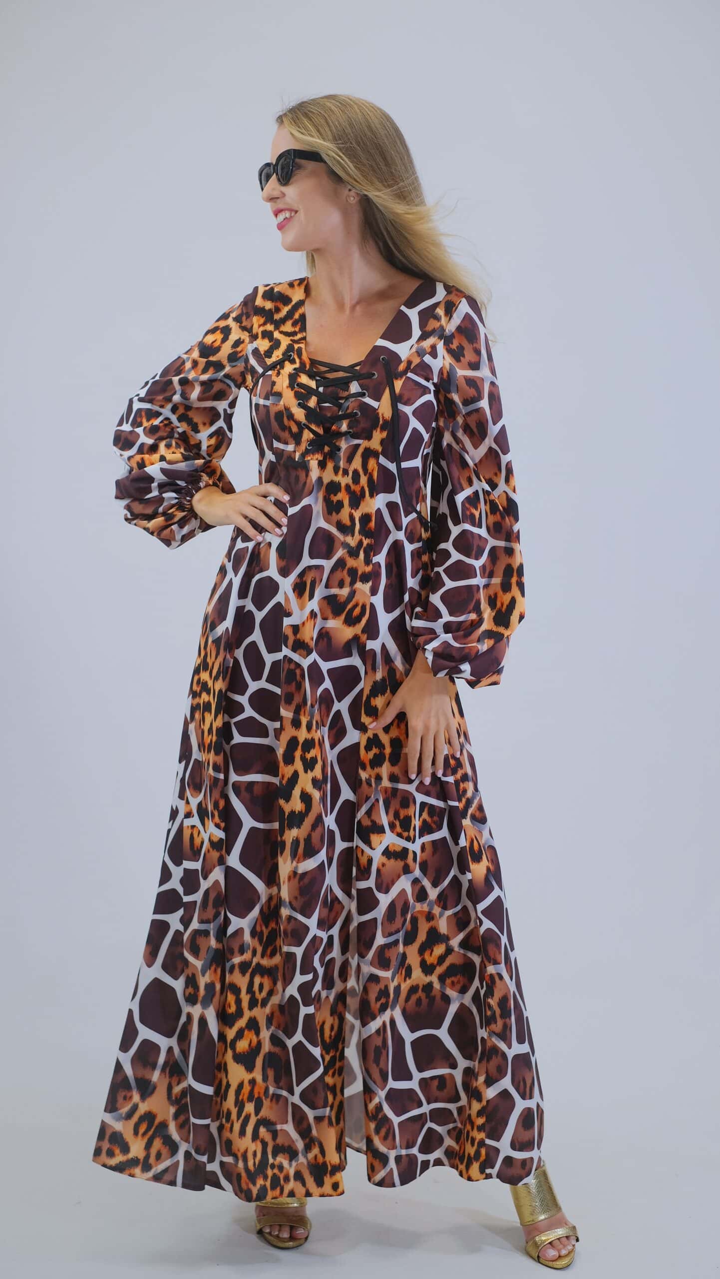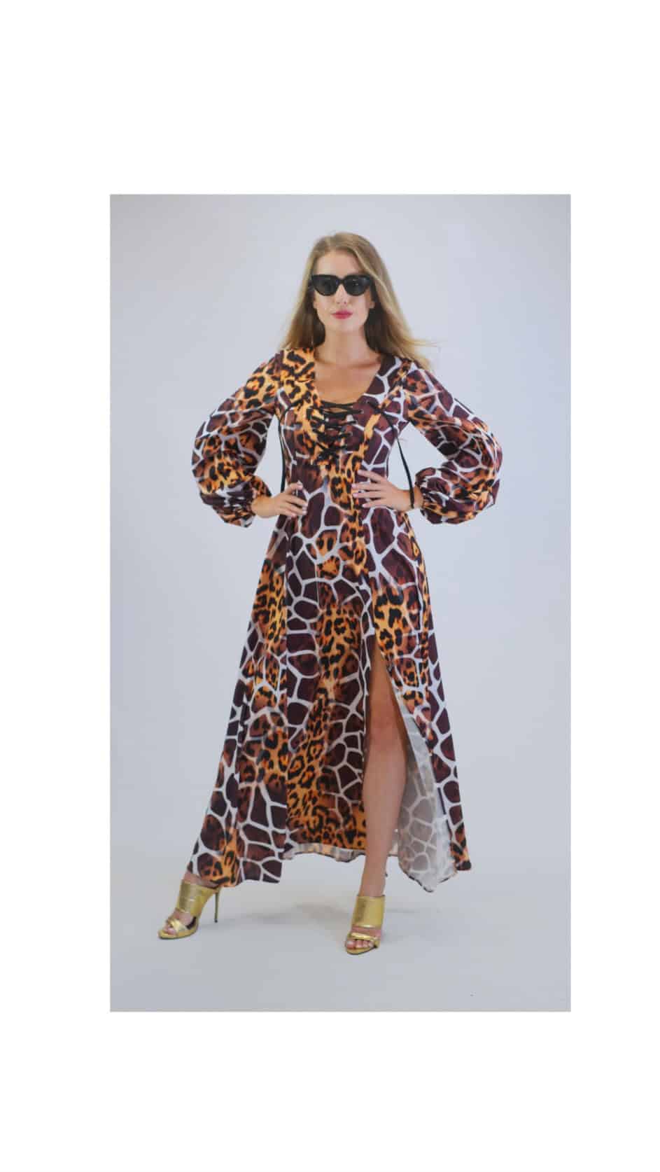 Šaty sú navrhnuté v prepracovanom strihu až po zem, v ktorom sa budete cítiť výnimočná. Šaty kombinujú voľné bohémske rukávy, so zúženým pásom a voľnou suknicou. Šaty majú rafinovaný prestrih na prednej časti, ktorý im dodáva sex-appeal. Šaty krásne tvarujú postavu a prispôsobia sa vám ako druhá koža. Šaty sú ušité vo zvieracom motívmi, kde sa návrhárka dala inšpirovať životom na Safari. Šaty kombinujú zemité odtiene s neutrálnou bielou farbou. Šaty si môžete zobrať rovnako na exotickú dovolenku ako aj na letnú oslavu.
