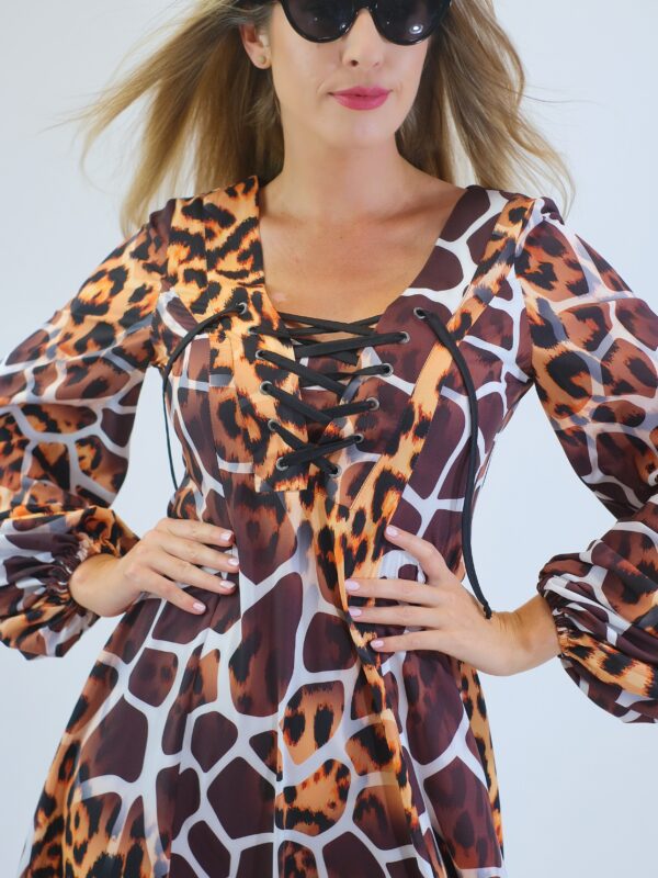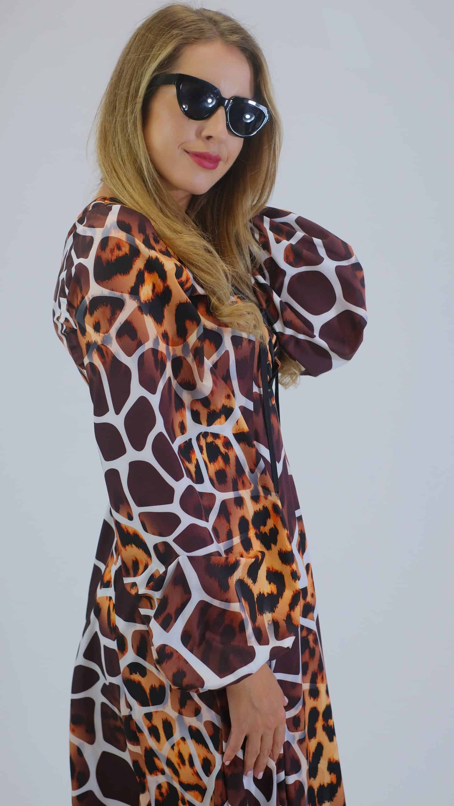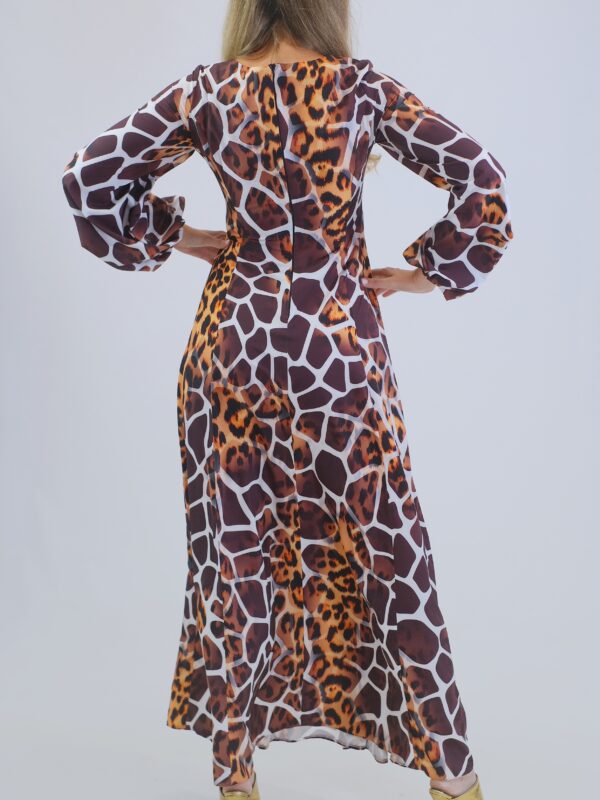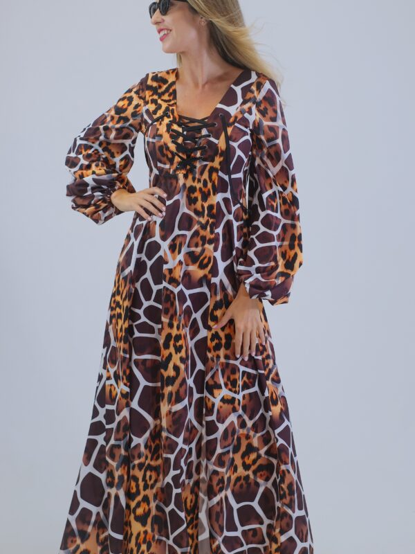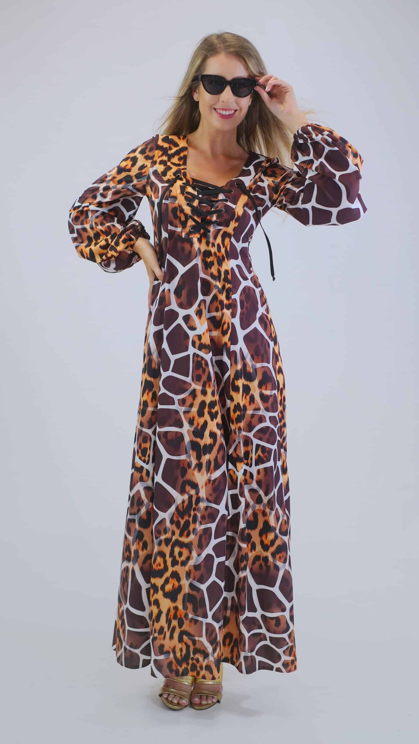 Šaty sú navrhnuté v prepracovanom strihu až po zem, v ktorom sa budete cítiť výnimočná. Šaty kombinujú voľné bohémske rukávy, so zúženým pásom a voľnou suknicou. Šaty majú rafinovaný prestrih na prednej časti, ktorý im dodáva sex-appeal. Šaty krásne tvarujú postavu a prispôsobia sa vám ako druhá koža. Šaty sú ušité vo zvieracom motívmi, kde sa návrhárka dala inšpirovať životom na Safari. Šaty kombinujú zemité odtiene s neutrálnou bielou farbou. Šaty si môžete zobrať rovnako na exotickú dovolenku ako aj na letnú oslavu.