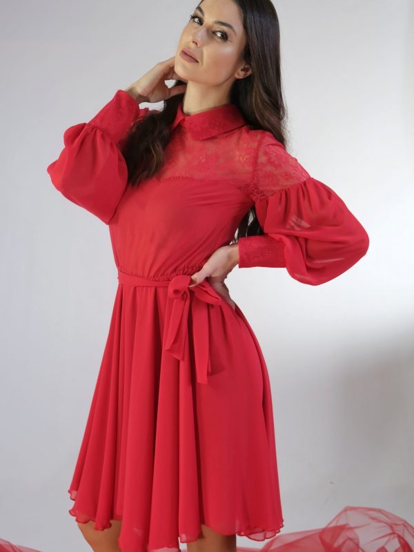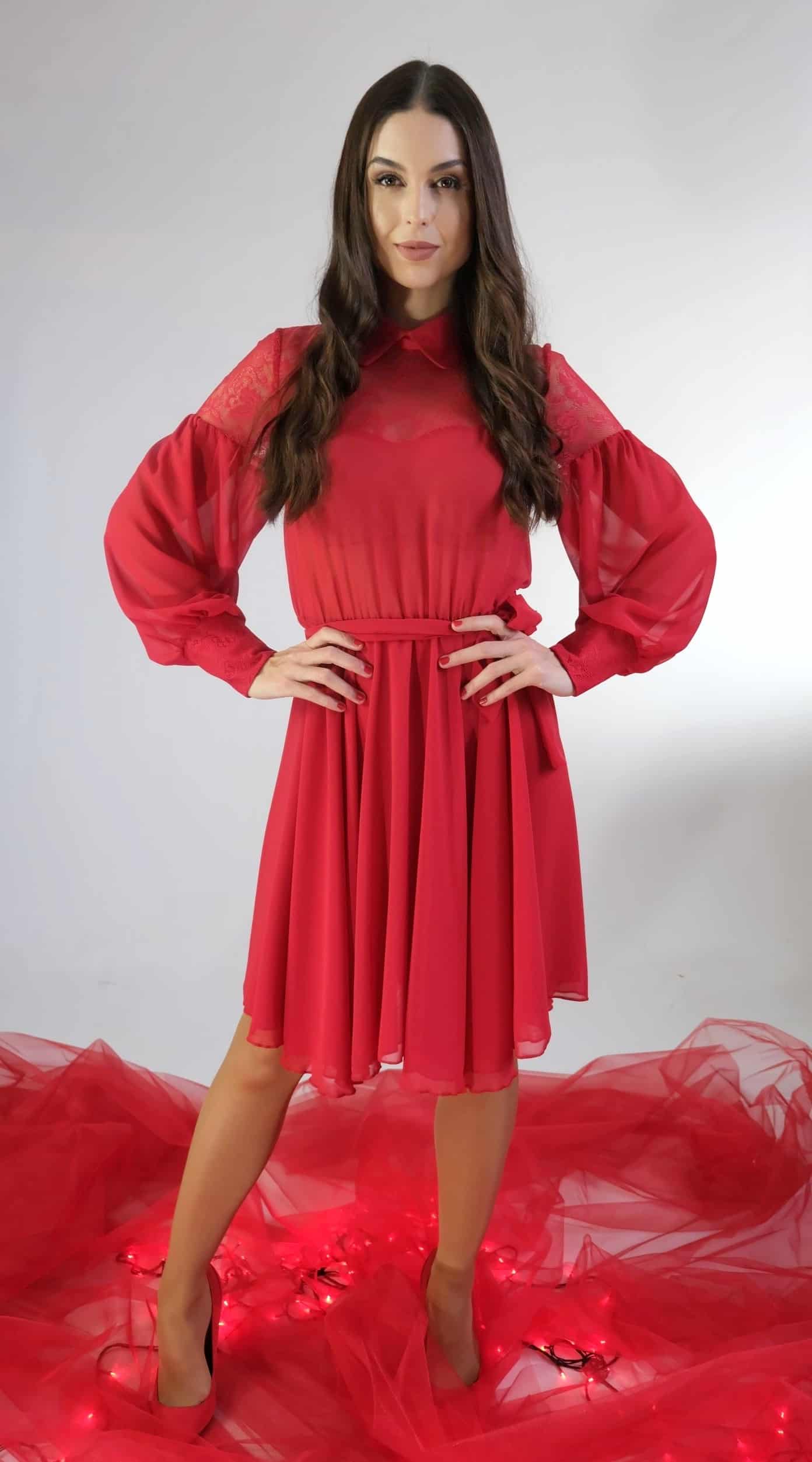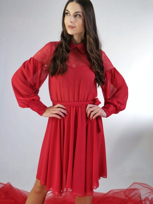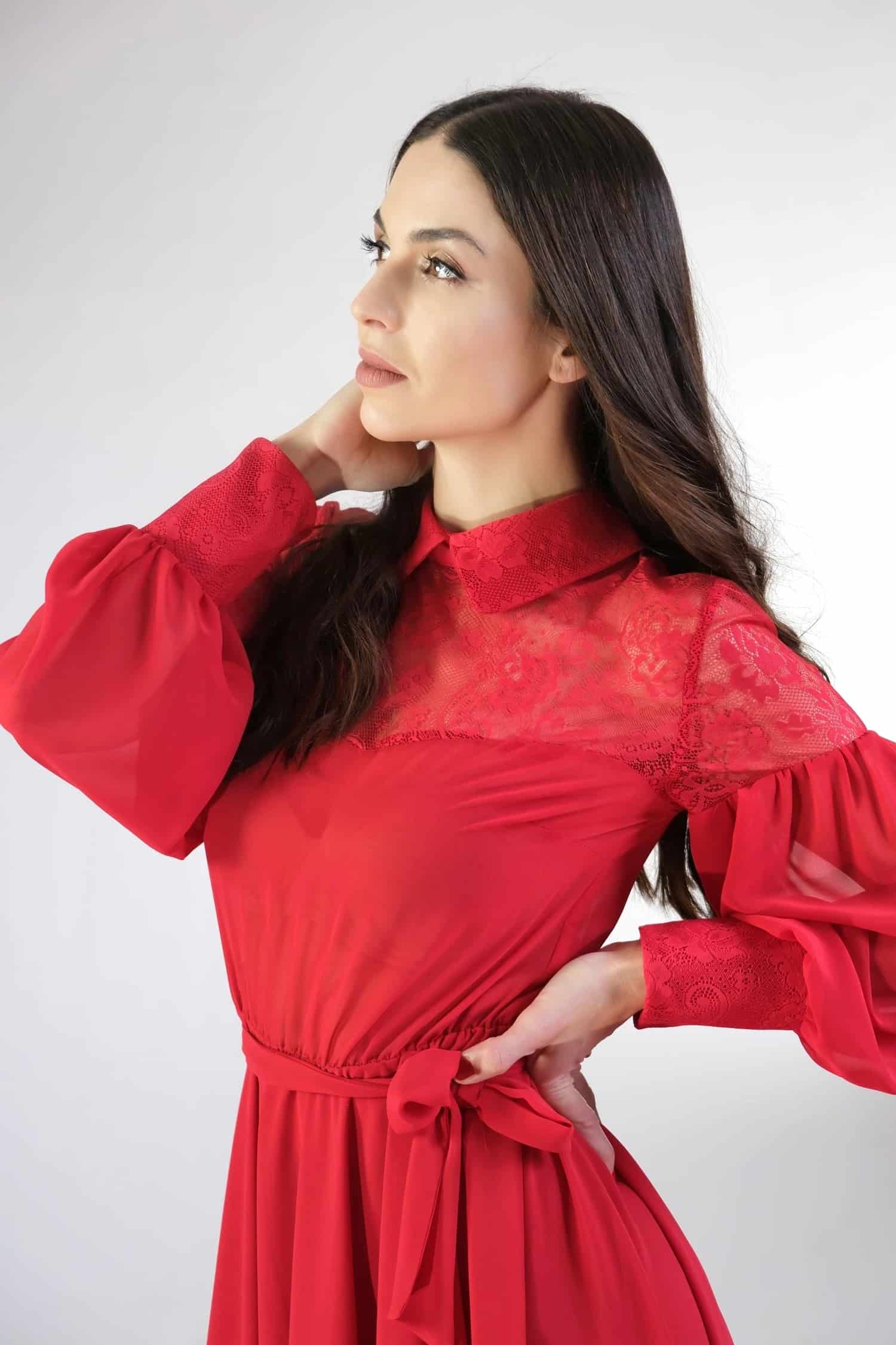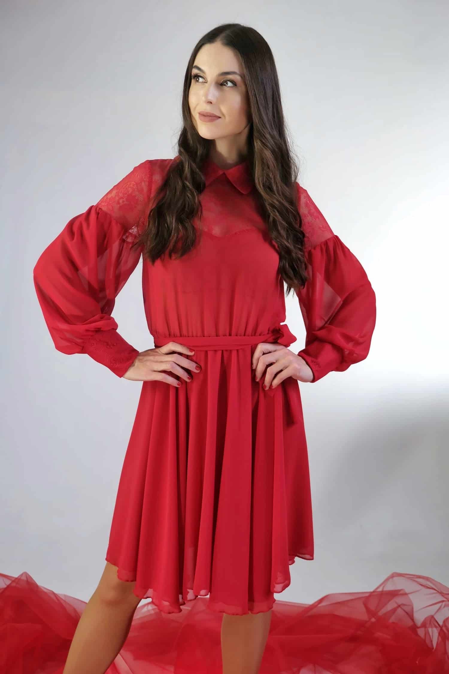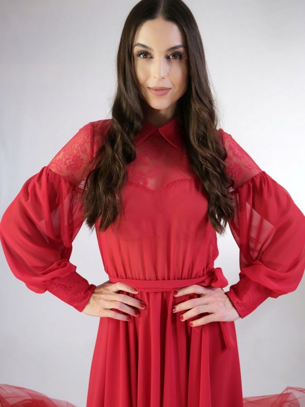 Šaty ušité v prenikavej červenej farbe z jemného šifónu v kombinácii s krajkou. Šaty pôsobia slávnostne a skvele vyniknú aj pri štedrej večeri. Strih šiat je do pohodlného áčka a sadne na každú postavu. Pás si môžete vytvoriť na šatách z priloženého opasku. Výraznú červenú môžete skombinovať napríklad s nevinnou bielou, výraznou smaragdovo zelenou alebo slávnostnou zlatou.