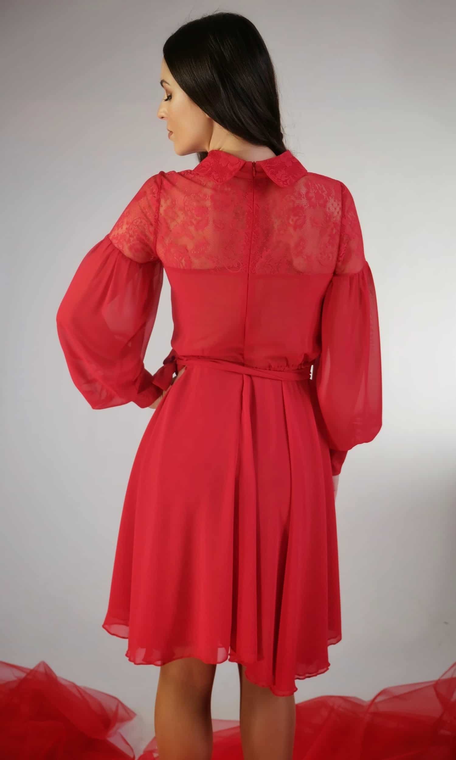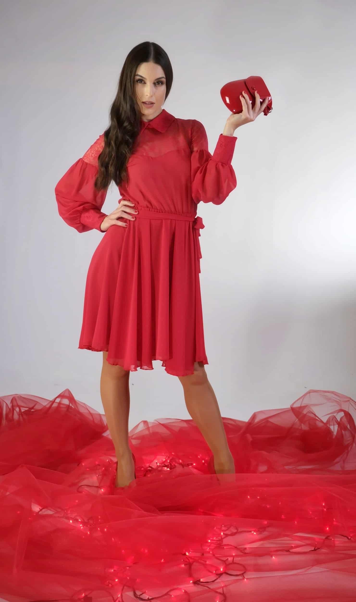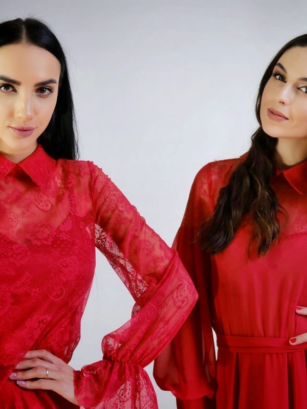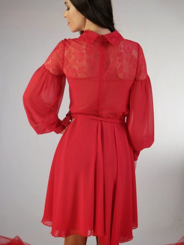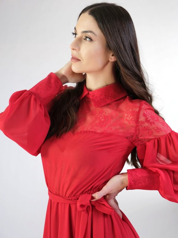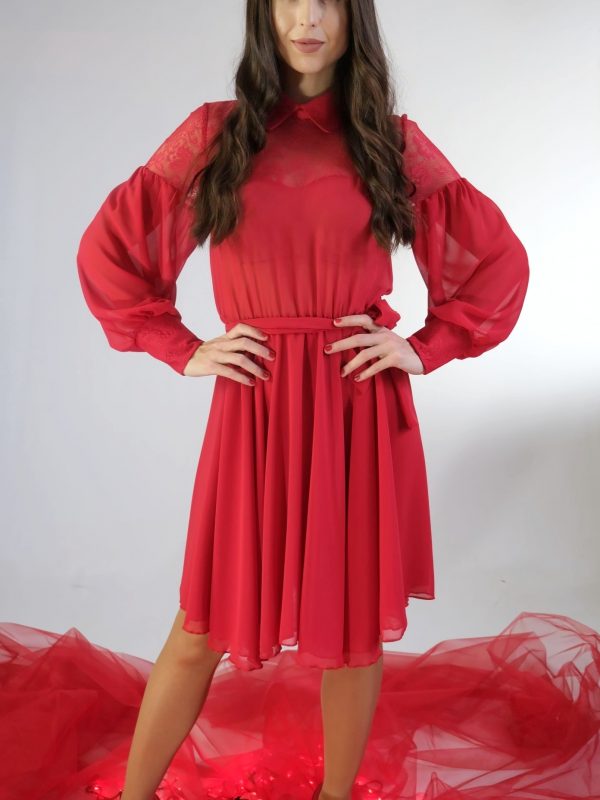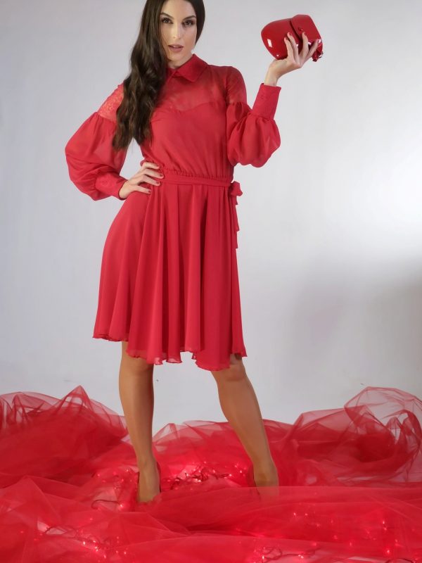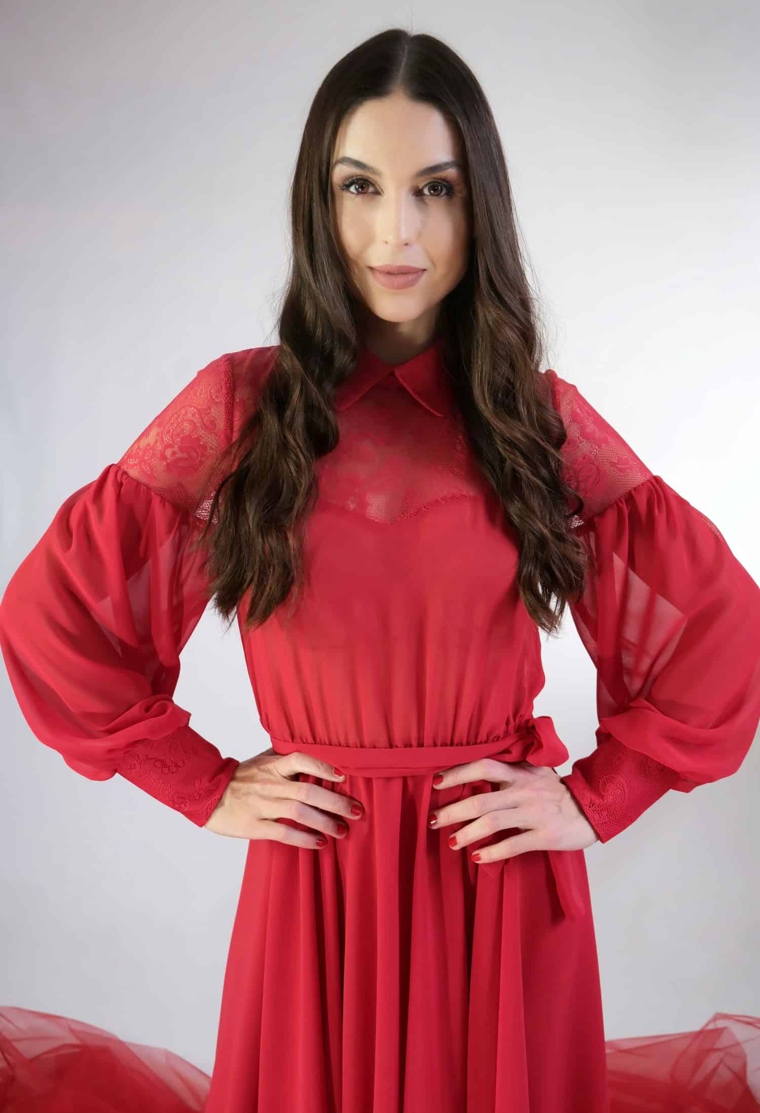 Šaty ušité v prenikavej červenej farbe z jemného šifónu v kombinácii s krajkou. Šaty pôsobia slávnostne a skvele vyniknú aj pri štedrej večeri. Strih šiat je do pohodlného áčka a sadne na každú postavu. Pás si môžete vytvoriť na šatách z priloženého opasku. Výraznú červenú môžete skombinovať napríklad s nevinnou bielou, výraznou smaragdovo zelenou alebo slávnostnou zlatou.