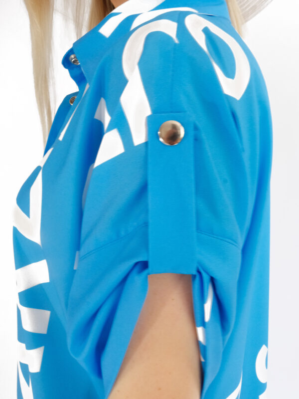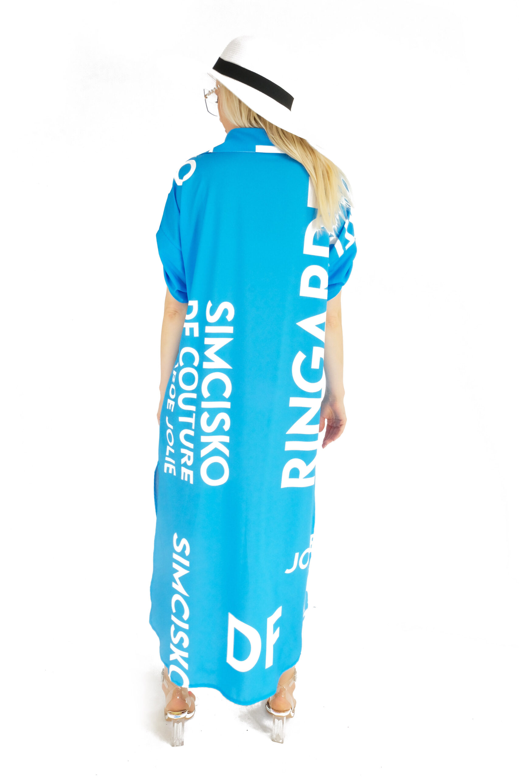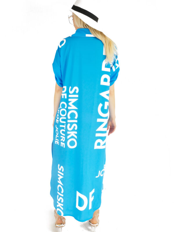 Šaty sú ušité v jednoduchom áčkovom strihu. Vrchný diel šiat je inšpirovaný košeľovým strihom a dodáva šatám ležérnosť. Zaujímavým detailom sú rozstrihy na bokoch, ktoré v kombinácii s ľahučkým letným materiálom Vám zaručia komfort aj v horúcich letných dňoch. Najvýraznejším prvkom šiat je ako inak vzor v tomto prípade nebesky modrý podklad s našou autorskou potlačou. Horúci typ skombinujte šaty so širokým bielym opaskom na vytvorenie pásu a bielymi teniskami a máte skvelý letný outfit.
