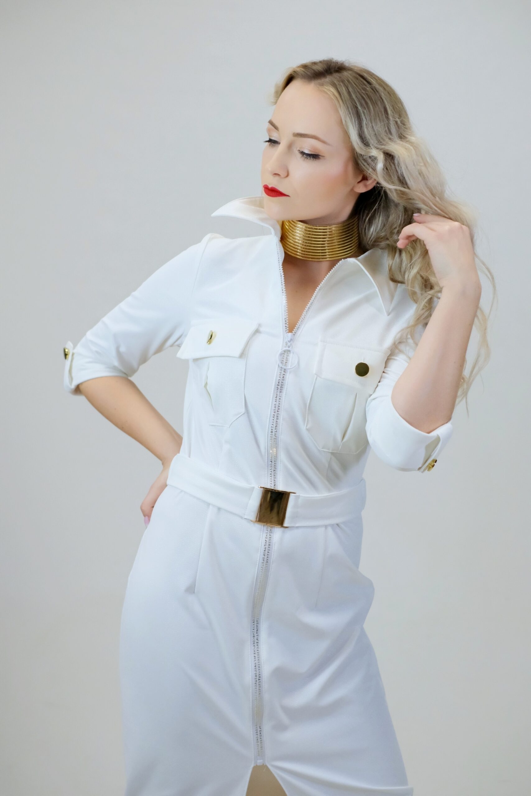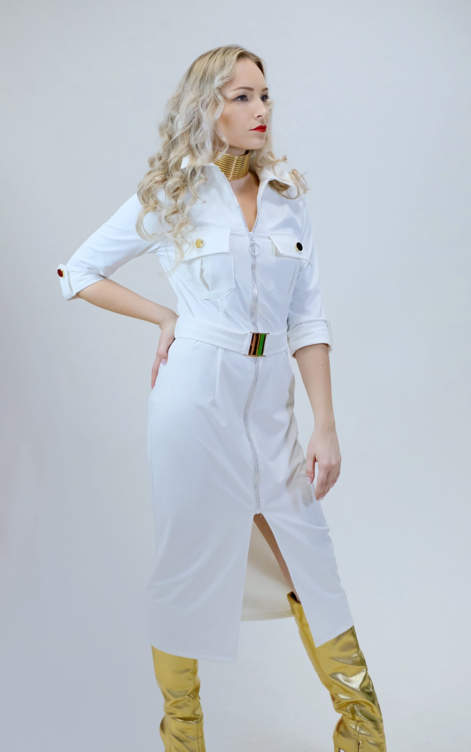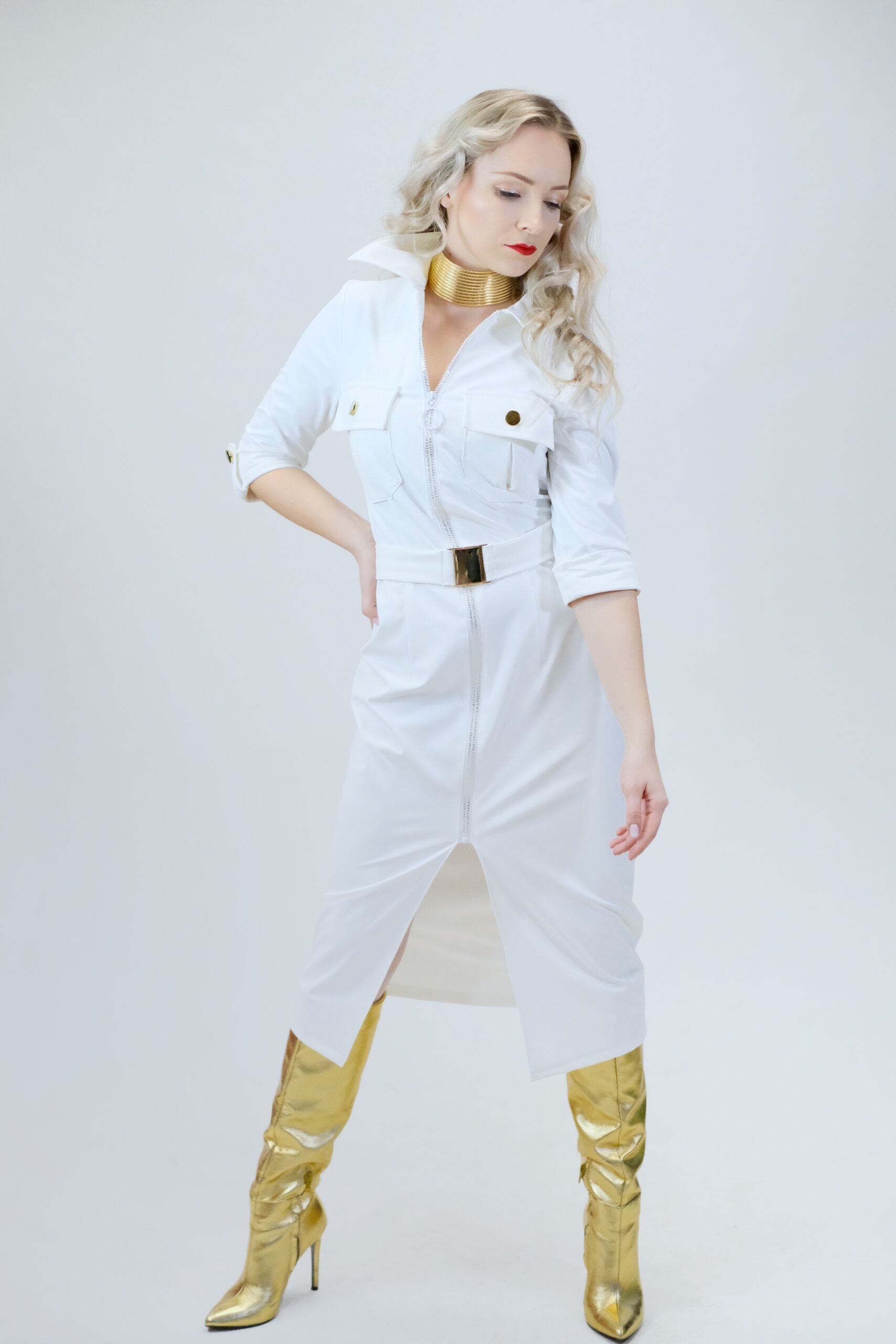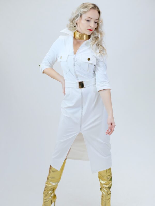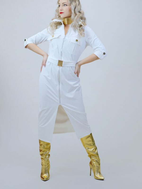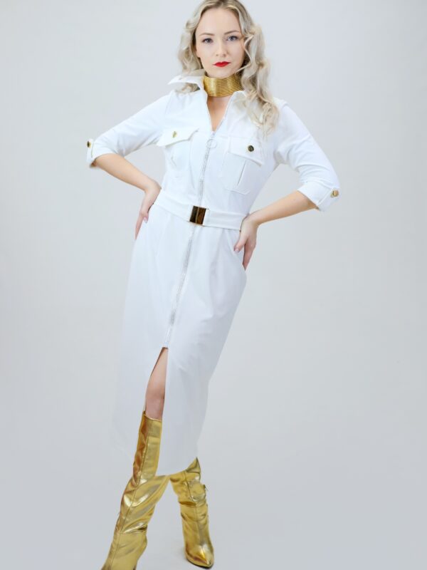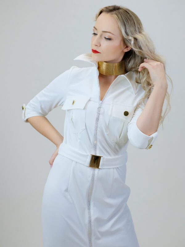 Šaty sú navrhnuté v jednoduchom rovnom strihu, ktorý sa vďaka veľmi elastickému materiálu dokonale prispôsobí vašej postave. Šaty sú inšpirované pánskym šatníkom, čo vidieť na spracovaní goliera, ktorý vychádza z pánske košele a vreciek. Šaty sú ušité v nádhernej snehobielej látke, ktorá sa na svetle miernel leskne. Šaty majú priložený opasok z rovnakého materiálu. Šaty kombinujte so zlatými doplnkami, ktoré skvele ladia k zlatej spone na opasku a ozdobným zlatým gombíkom.