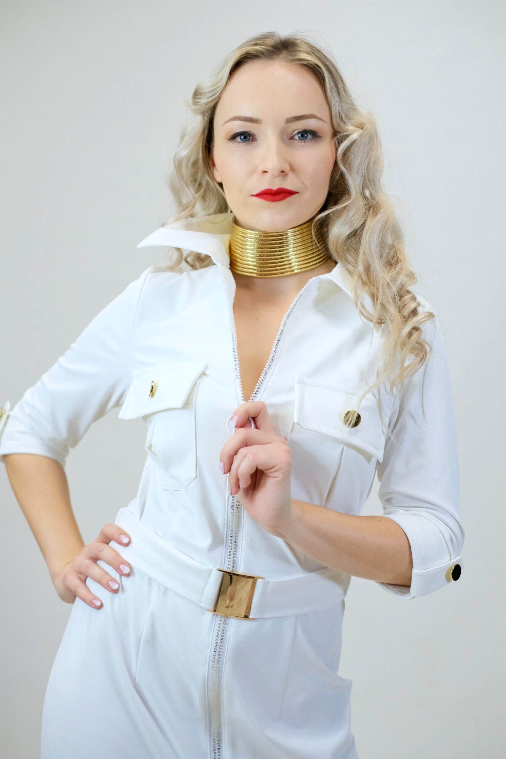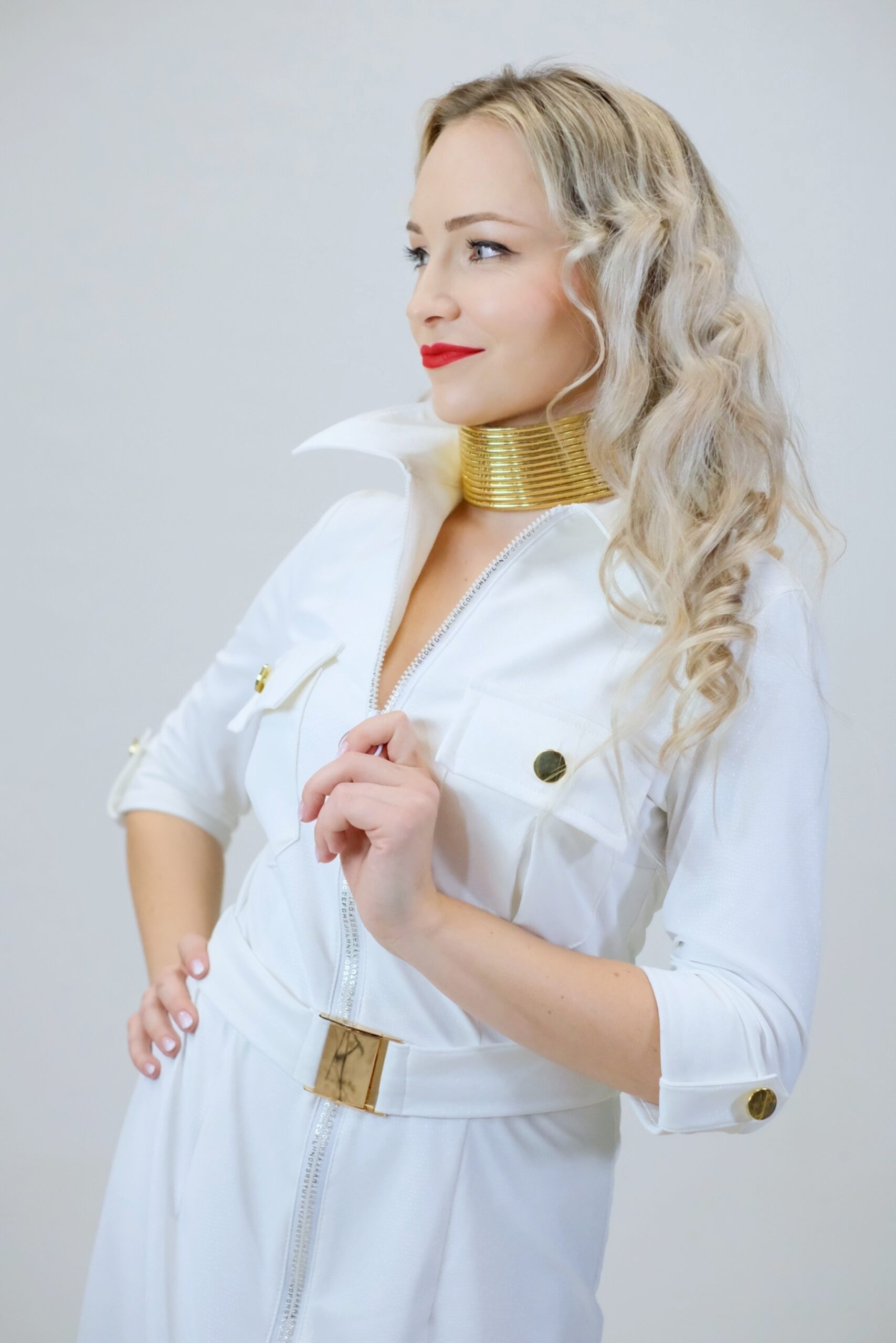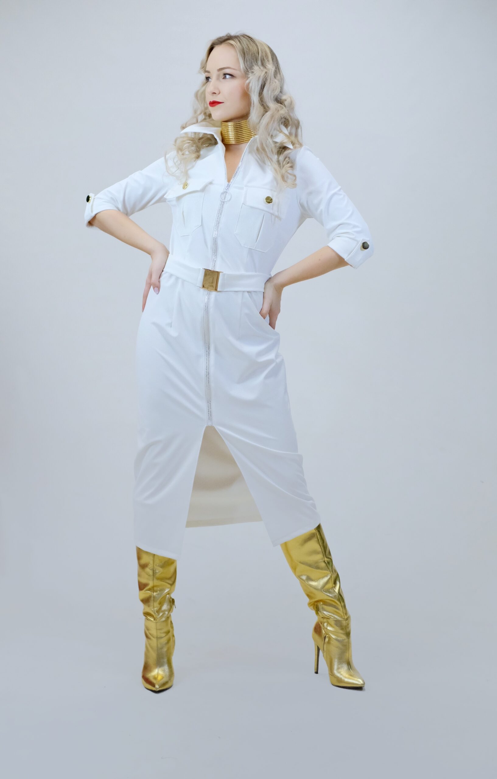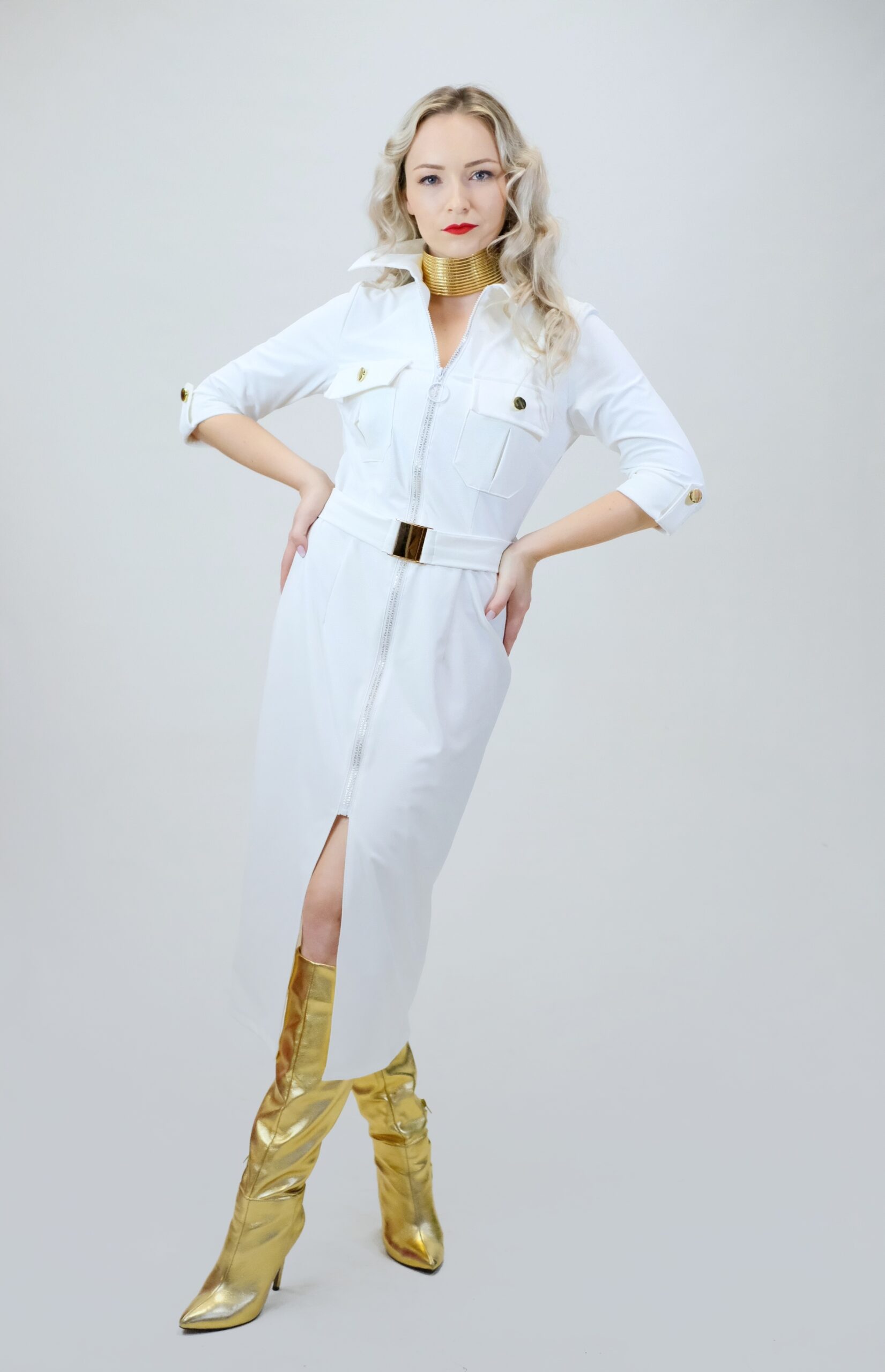 Šaty sú navrhnuté v jednoduchom rovnom strihu, ktorý sa vďaka veľmi elastickému materiálu dokonale prispôsobí vašej postave. Šaty sú inšpirované pánskym šatníkom, čo vidieť na spracovaní goliera, ktorý vychádza z pánske košele a vreciek. Šaty sú ušité v nádhernej snehobielej látke, ktorá sa na svetle miernel leskne. Šaty majú priložený opasok z rovnakého materiálu. Šaty kombinujte so zlatými doplnkami, ktoré skvele ladia k zlatej spone na opasku a ozdobným zlatým gombíkom.