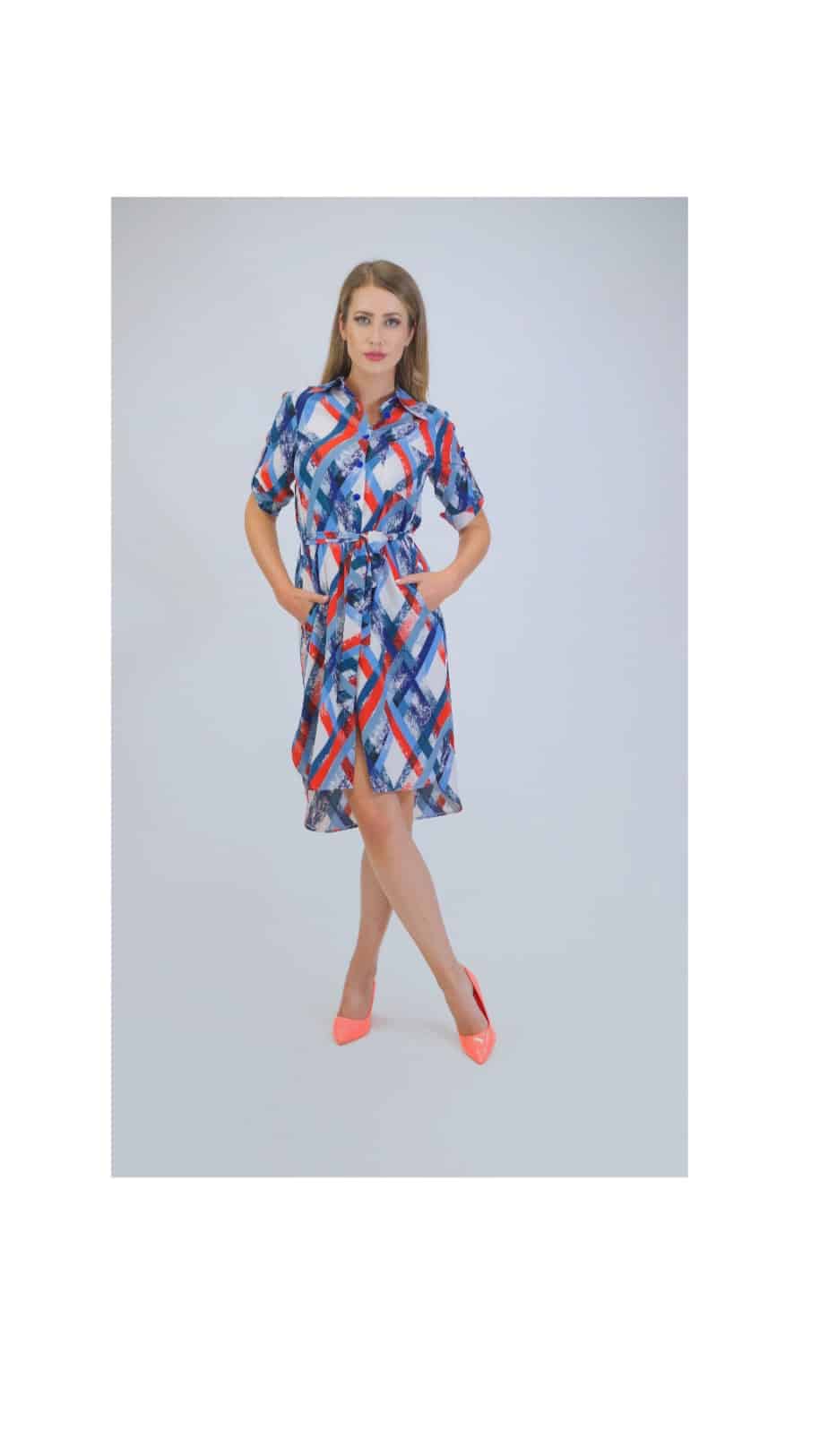 Šaty sú ušité v pohodlnom košeľovom strihu, ktorý sadne na každý typ postavy a budete sa v ňom cítiť výborne počas celého dňa. Šaty majú funkčné vrecka a rukávy sa dajú vyhrnúť čo im dodáva športový nádych. Košeľový strih šiat je u našich zákazníčok populárny ,aj vďaka jeho variabilite, môžete ho rovnako dobre nosiť s opätkami, ako aj s teniskami. Šaty sú navrhnuté v jednoduchom geometrickom vzore s prúžkami modrej ,oranžovej a bielej.