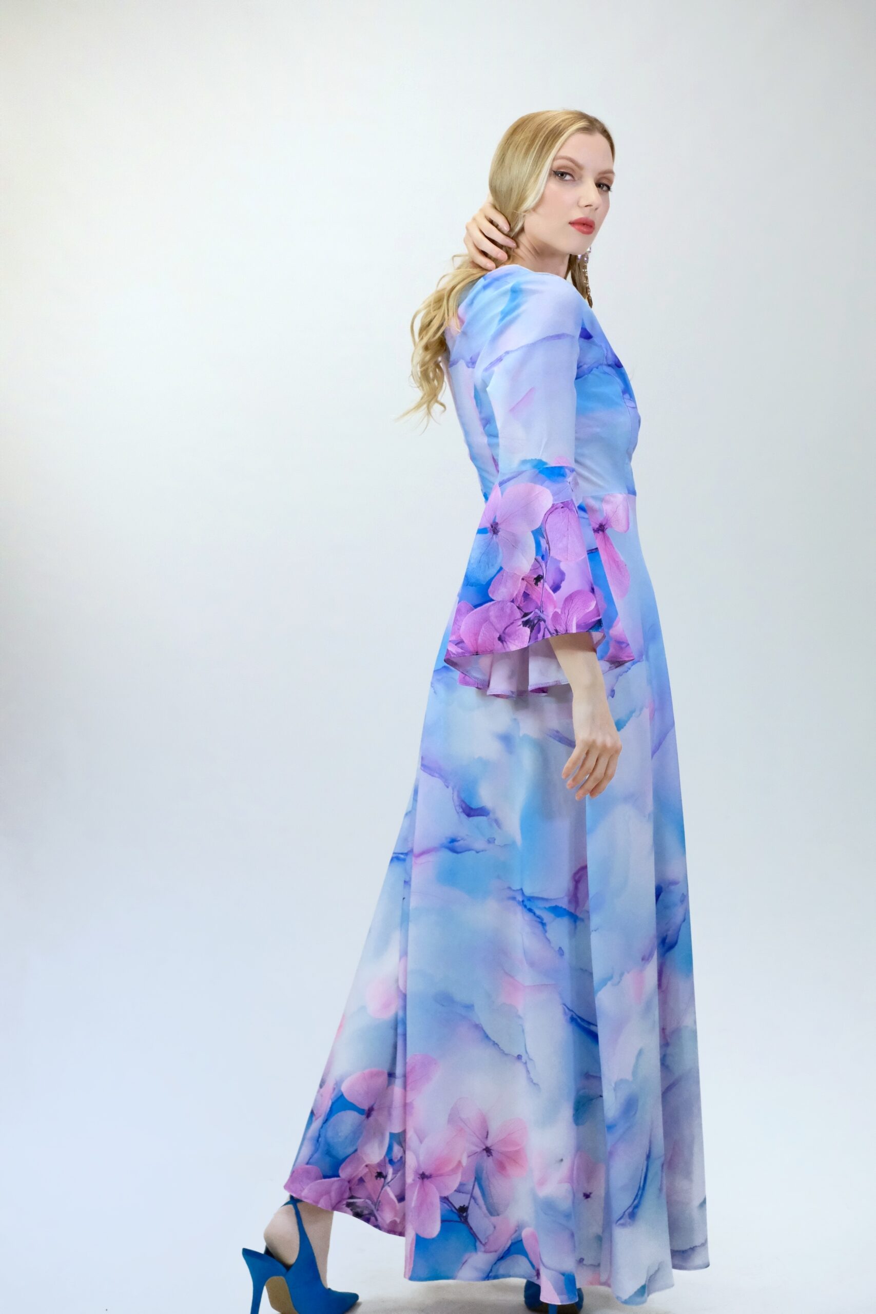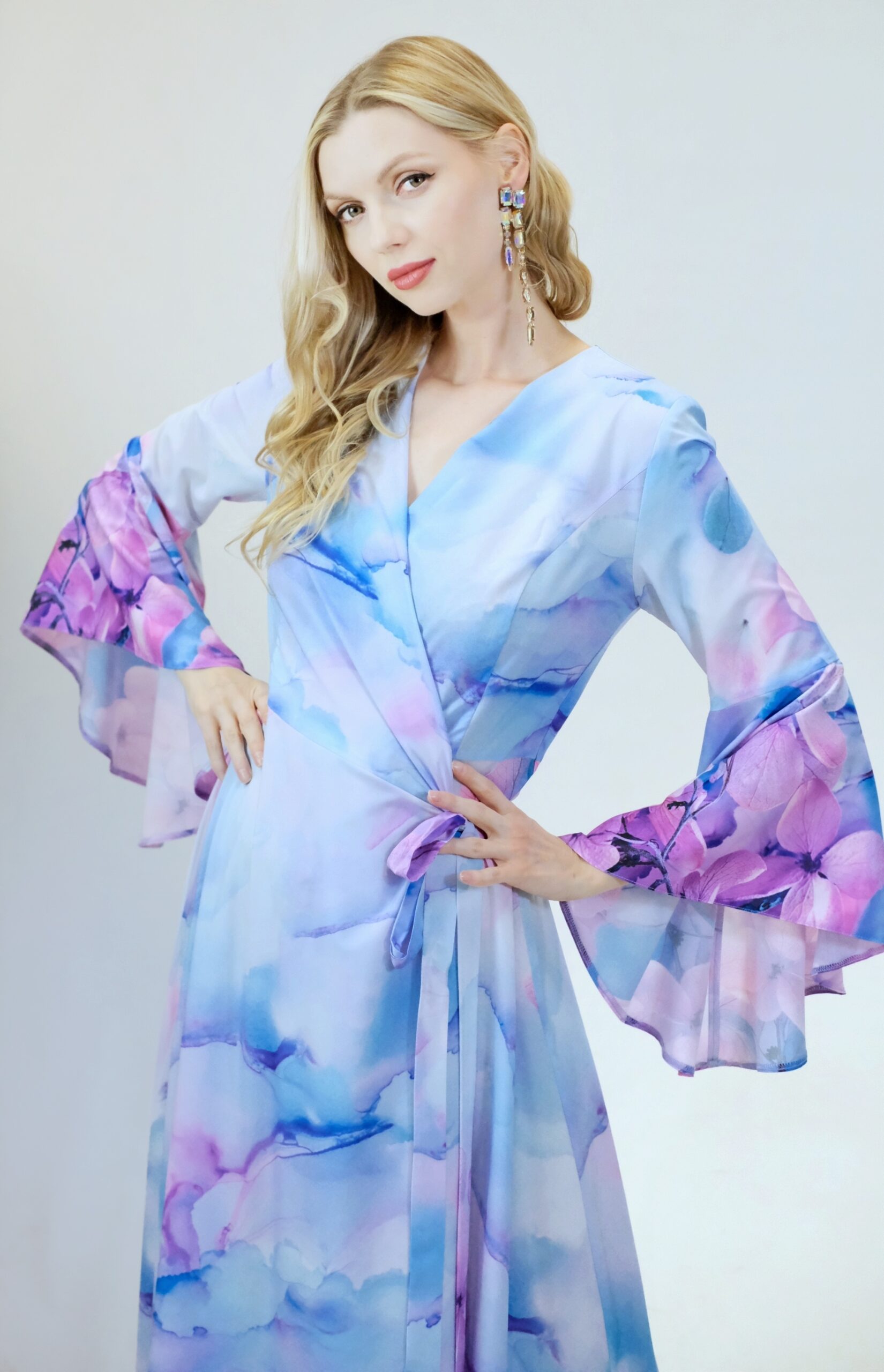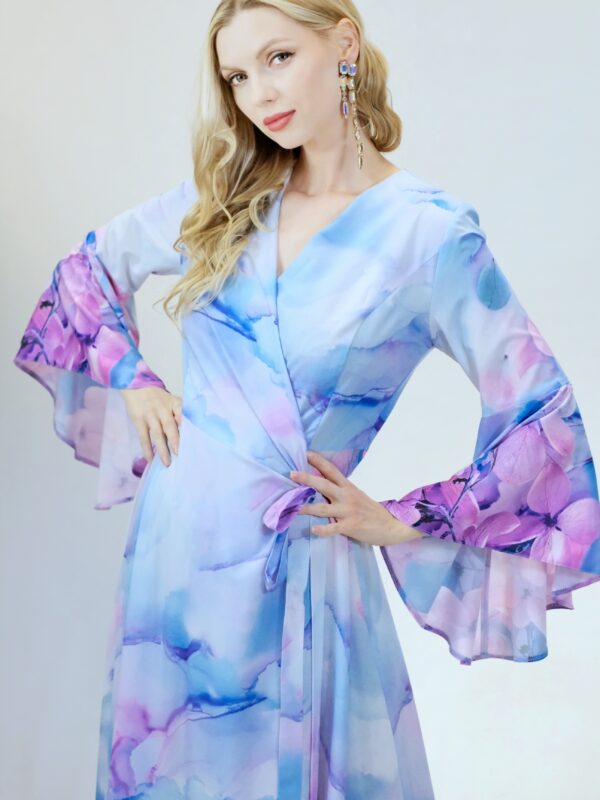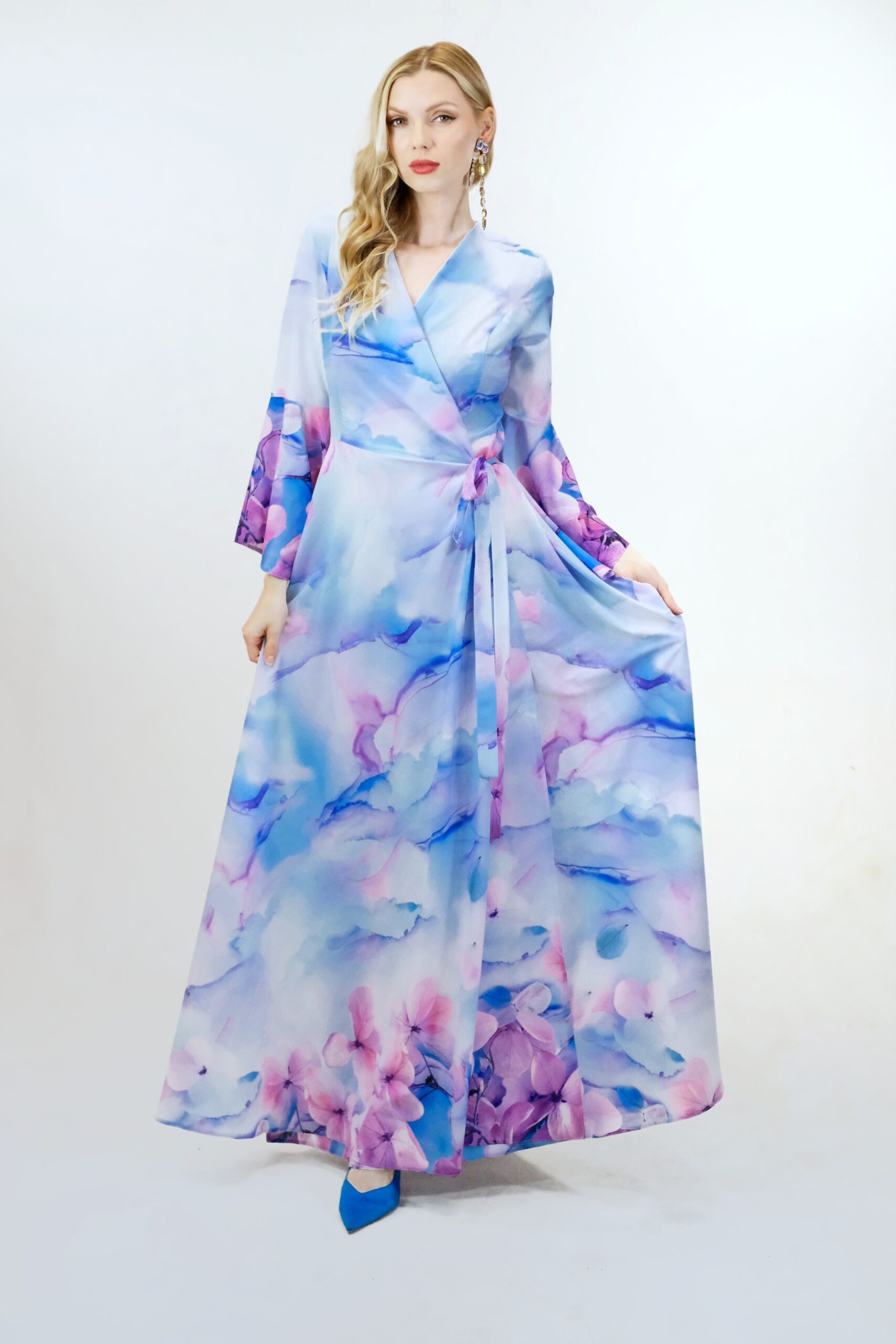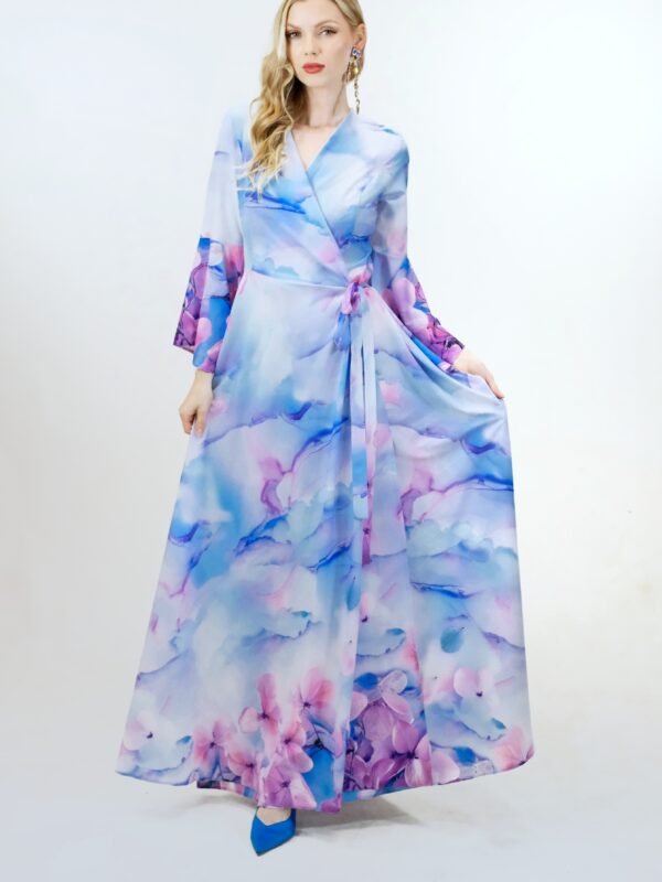 Šaty sú navrhnuté v pohodlnom zavinovaciom strihu, ktorý sa prispôsobí každému typu postavy. Šaty sa uväzujú na šnúrku na boku. Šaty majú preložený výstrih a voľné padavé rukávy, ktoré im dodávajú na romantickosti a ležérnosti. Šaty sú dlhé až po zem. Šaty sú vyrobené z materiálu, ktorý je nádhernou kombináciou modrých a fialových odtieňov sa jemným florálnym motívom. Šaty sa skvele hodia na letnú spoločenskú udalosť, ako napríklad svadba alebo záhradná párty.