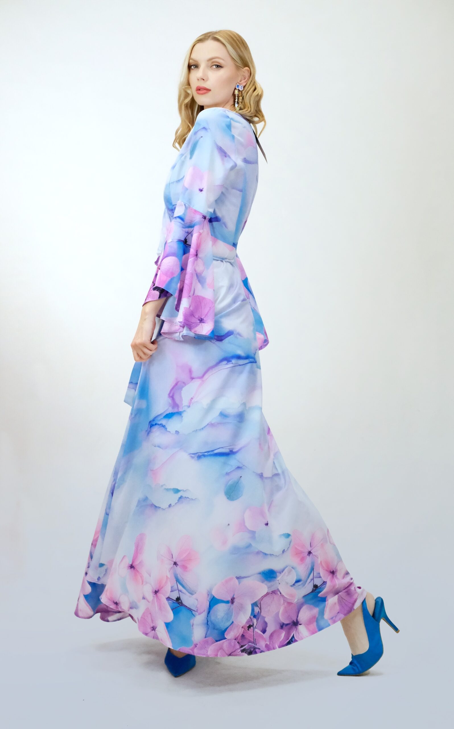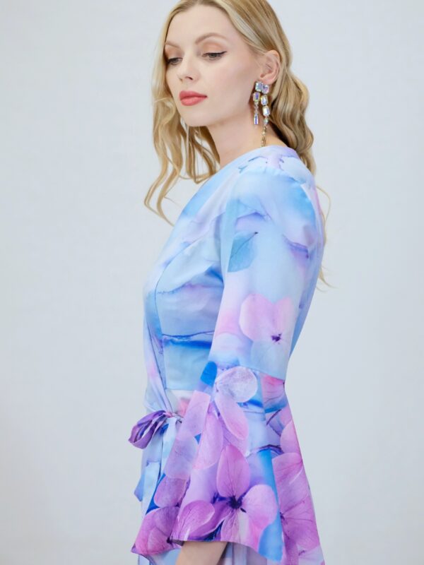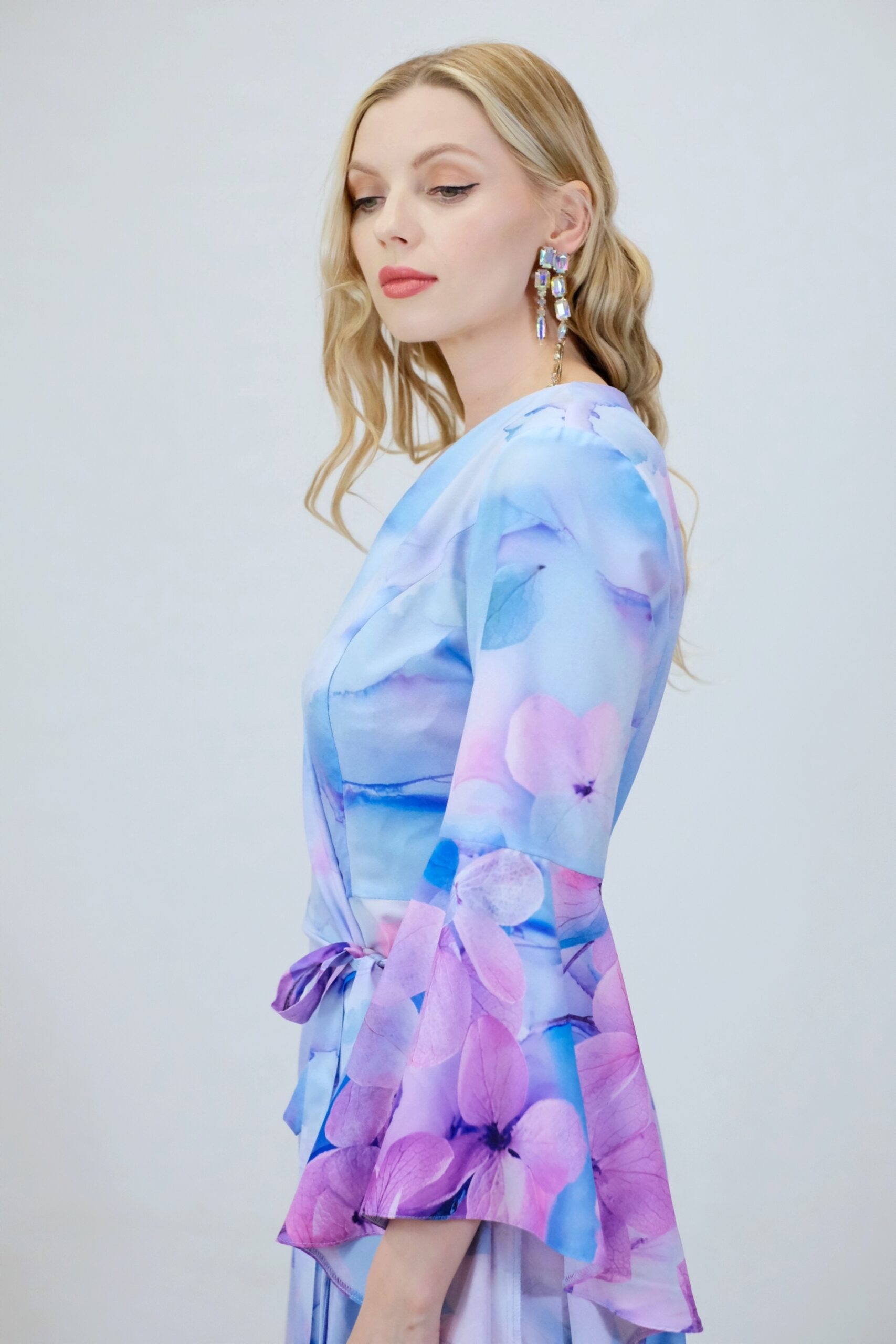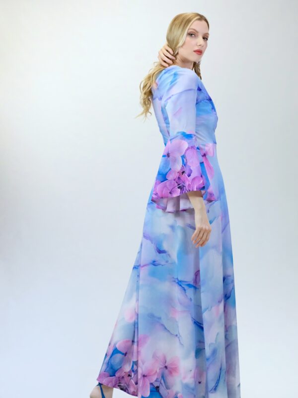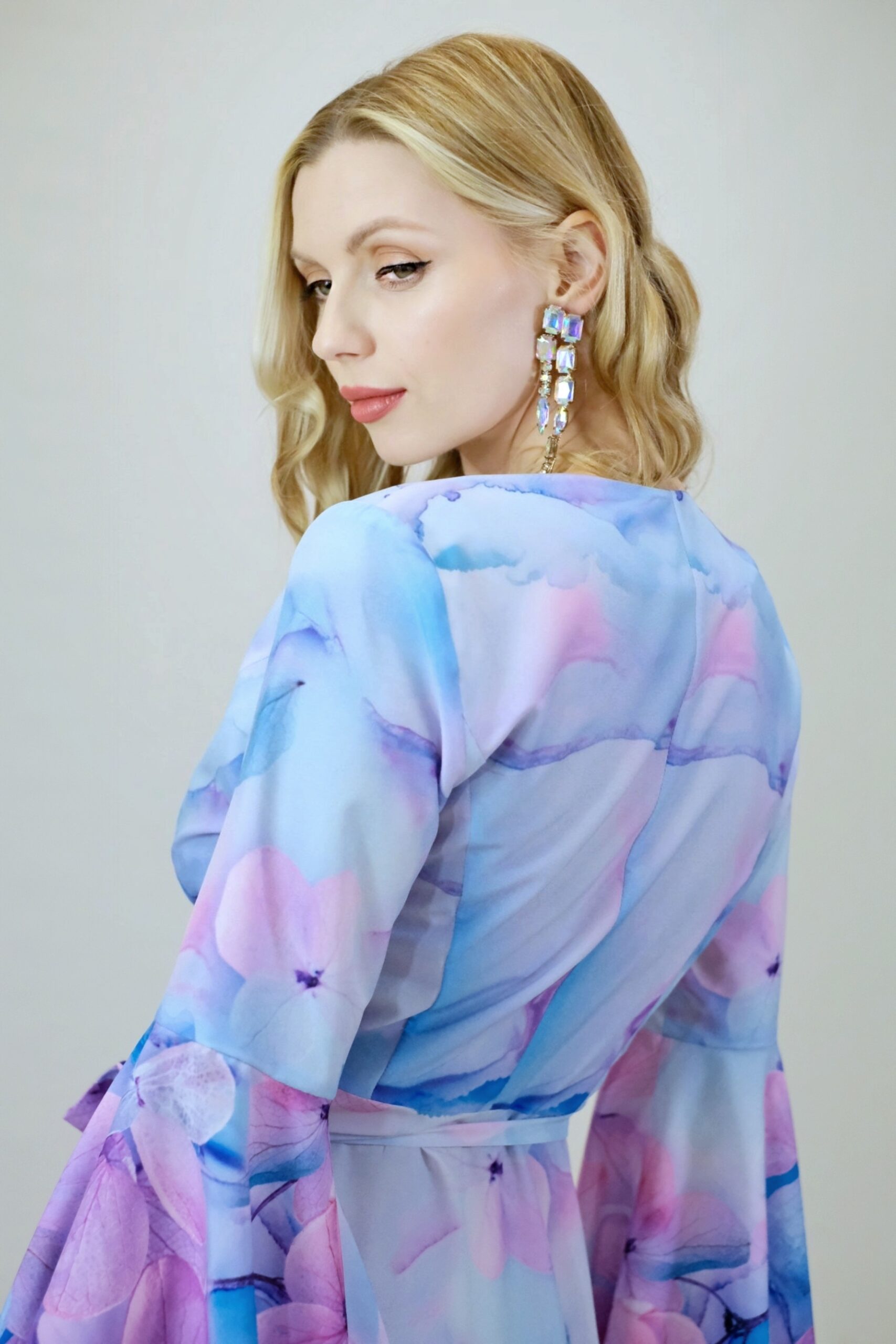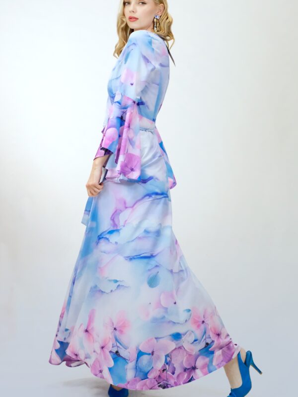Šaty sú navrhnuté v pohodlnom zavinovaciom strihu, ktorý sa prispôsobí každému typu postavy. Šaty sa uväzujú na šnúrku na boku. Šaty majú preložený výstrih a voľné padavé rukávy, ktoré im dodávajú na romantickosti a ležérnosti. Šaty sú dlhé až po zem. Šaty sú vyrobené z materiálu, ktorý je nádhernou kombináciou modrých a fialových odtieňov sa jemným florálnym motívom. Šaty sa skvele hodia na letnú spoločenskú udalosť, ako napríklad svadba alebo záhradná párty.