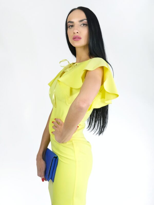 Šaty sú ušité v pohodlnom áčkovom strihu, ktorý sa výborne hodí na každý typ postavy. Šaty majú romantické volánové rukávy, ktoré inak jednoduchému strihu dodávajú šmrnc. Romantický nádych šatám naopak dodáva mašlička v oblasti priekrčníka, ktorú si môžete upraviť. Šaty sú ušité v slniečkovo-žltej farbe, ktorá rozžiari Vás aj každý Váš outfit. Pre wau effekt skombinujte s kráľovsko modrou farbou.