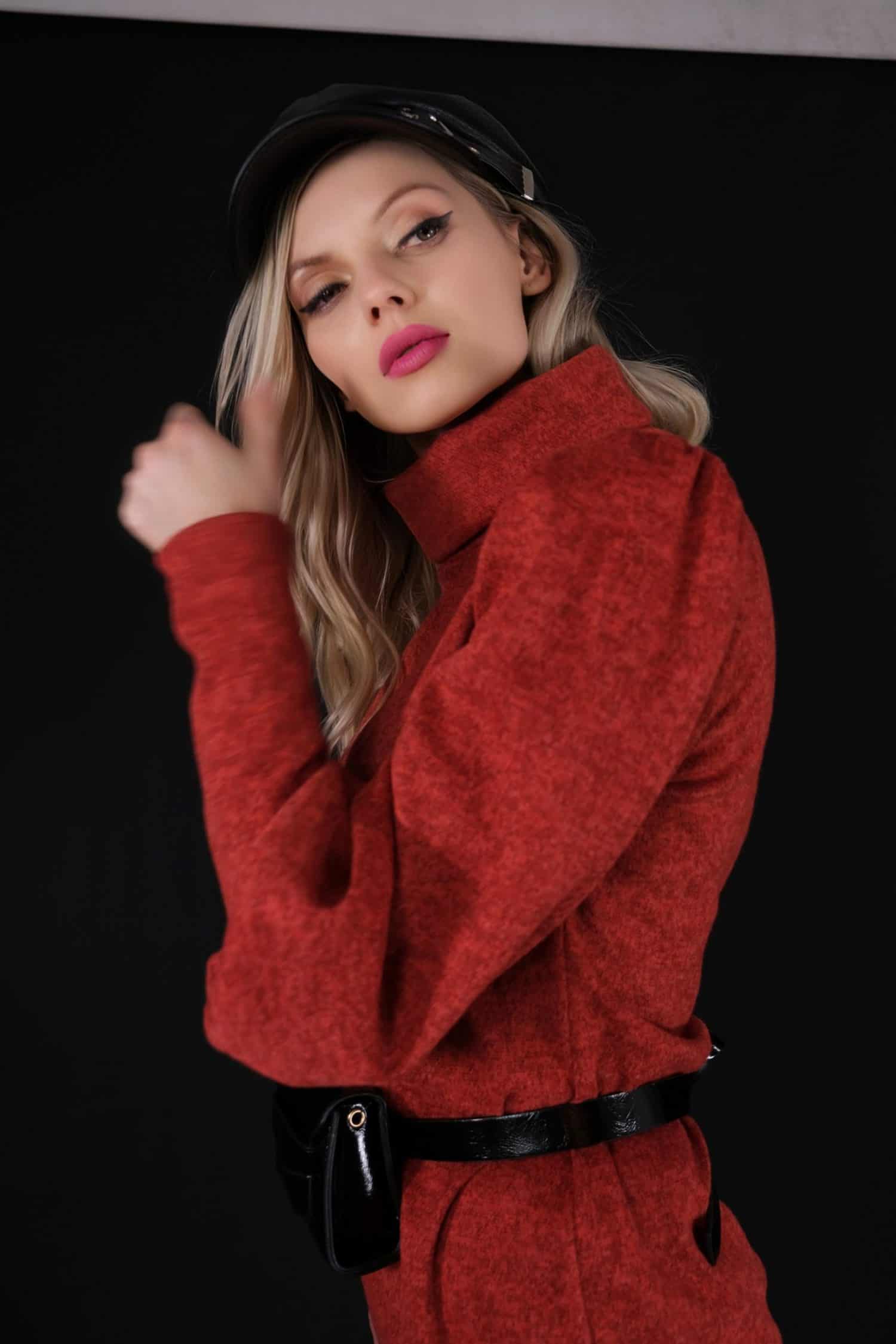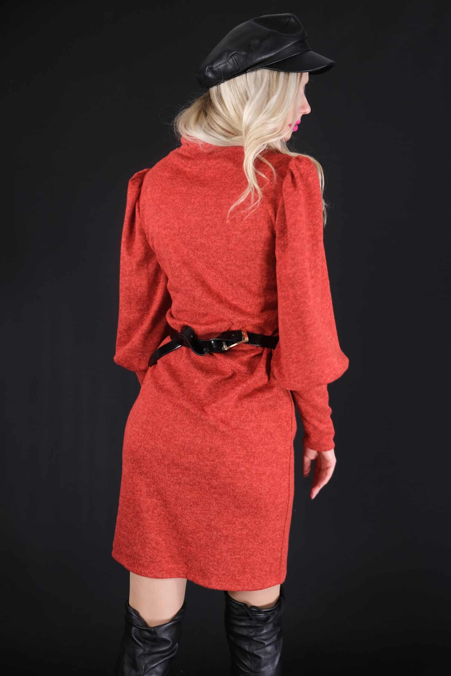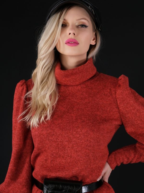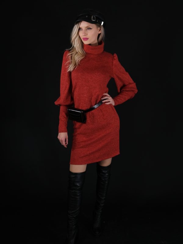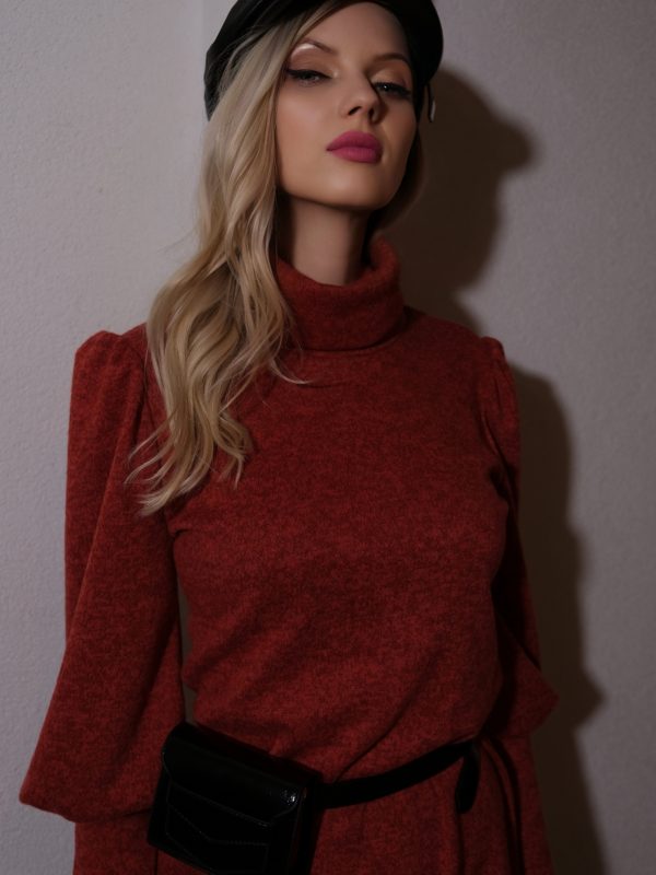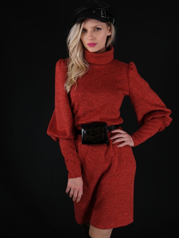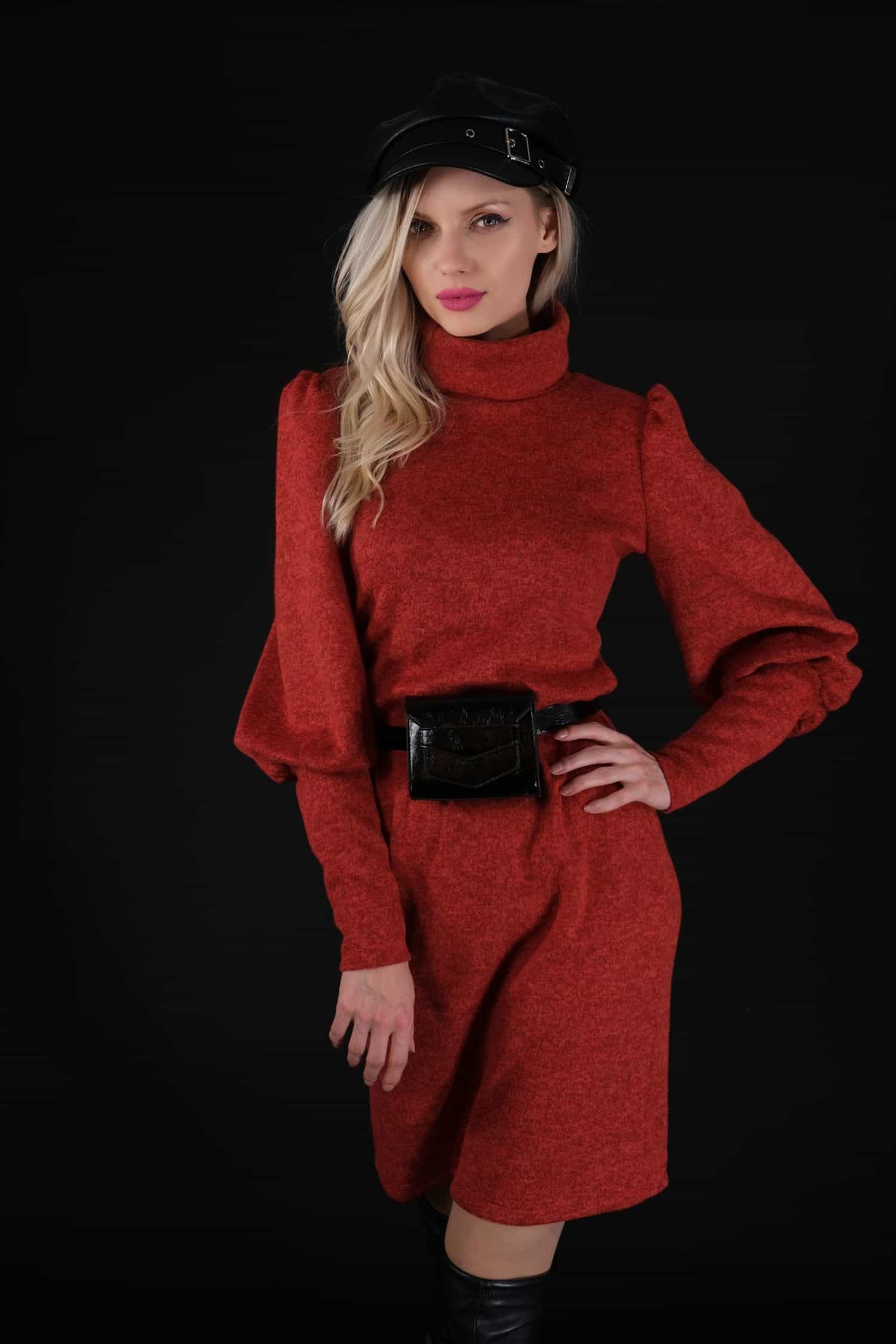 Šaty ušité v prispôsobivom puzdrovom strihu z mäkučkého úpletu, ktorý Vás udrží v teple aj v nadchádzajúcich chladných dňoch . Šaty majú rolákový golier, ktorý padne v chladnom počasí vhod. Zaujímavým detailom je košeľové spracovanie rukávovej manžety a bohémske voľne rukávy, ktoré šatám dodávajú šmrnc. Šaty sú ušité v príjemnej škoricovej farbe, ktorá sa výborne kombinuje s tmavými aj kontrastnými farbami vo Vašom šatníku.