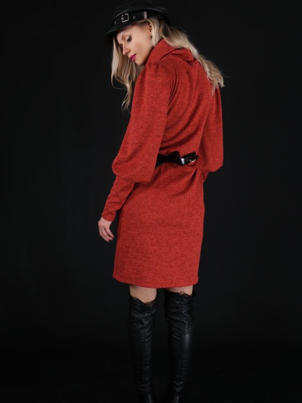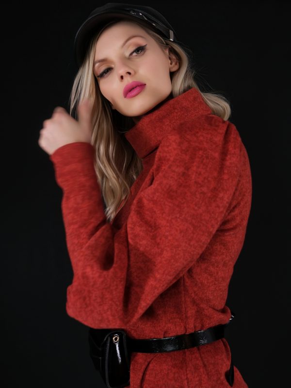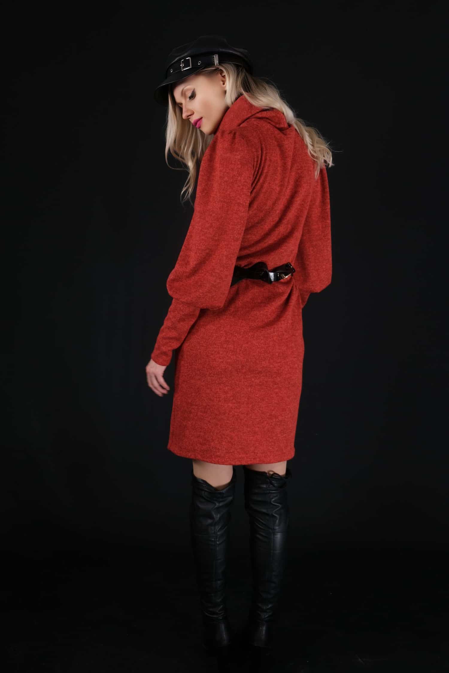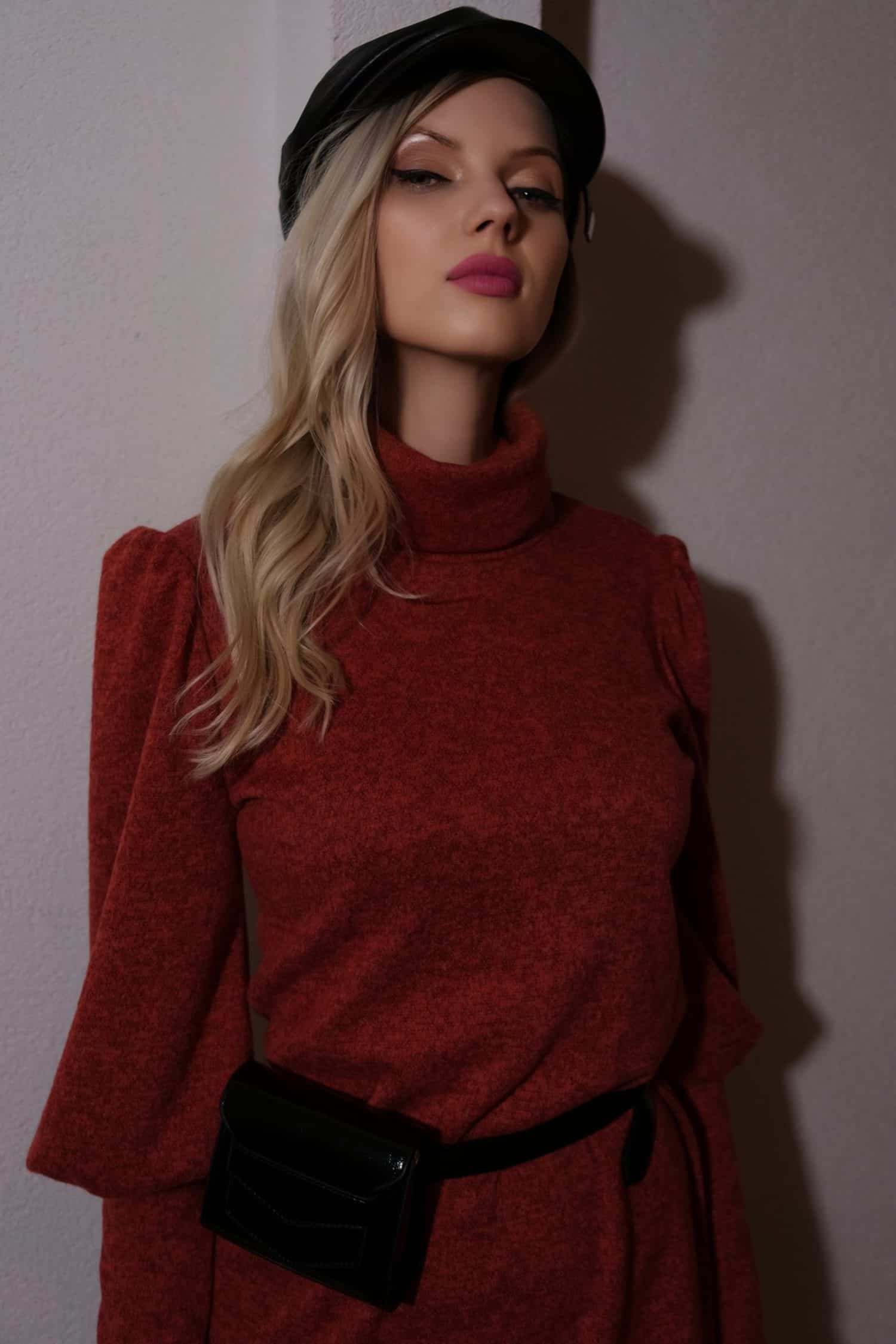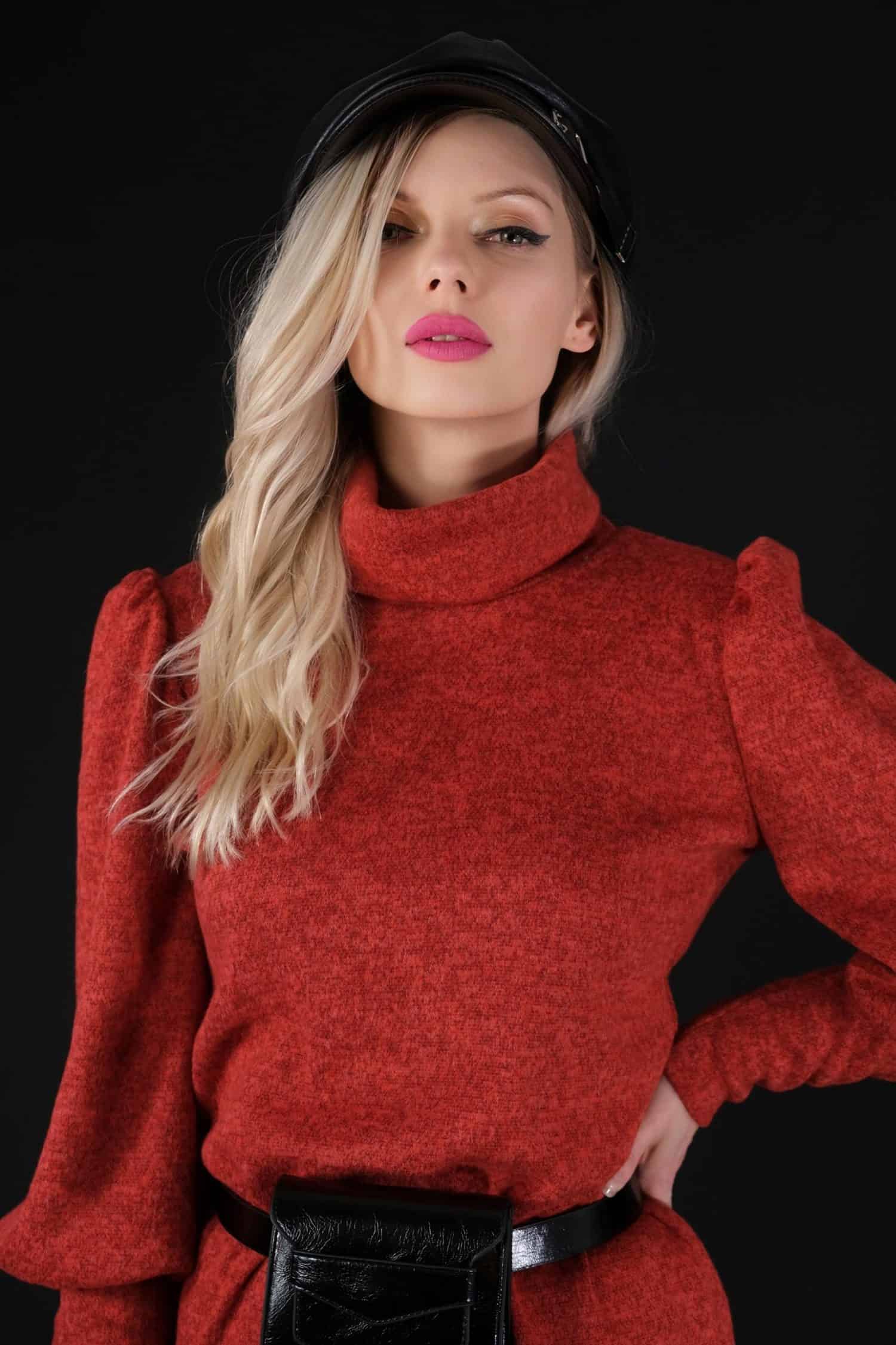 Šaty ušité v prispôsobivom puzdrovom strihu z mäkučkého úpletu, ktorý Vás udrží v teple aj v nadchádzajúcich chladných dňoch . Šaty majú rolákový golier, ktorý padne v chladnom počasí vhod. Zaujímavým detailom je košeľové spracovanie rukávovej manžety a bohémske voľne rukávy, ktoré šatám dodávajú šmrnc. Šaty sú ušité v príjemnej škoricovej farbe, ktorá sa výborne kombinuje s tmavými aj kontrastnými farbami vo Vašom šatníku.