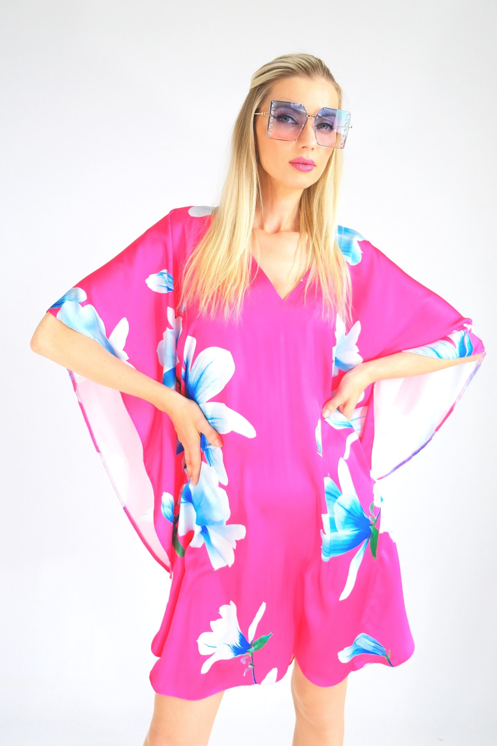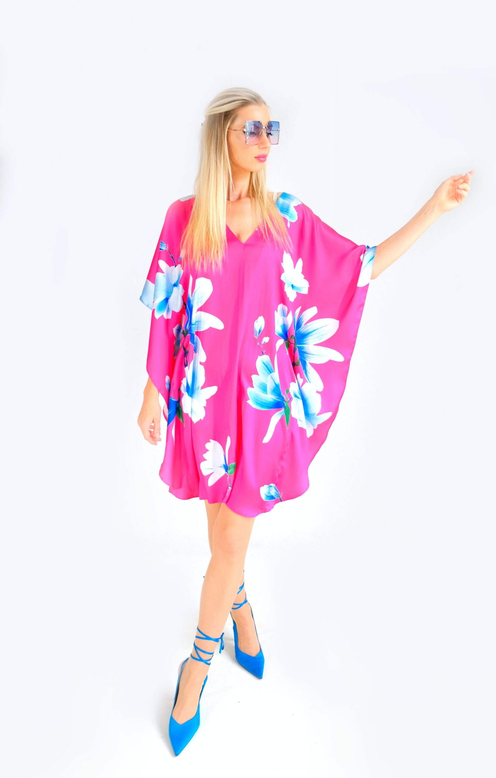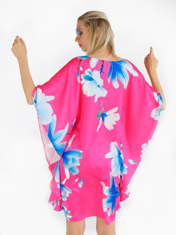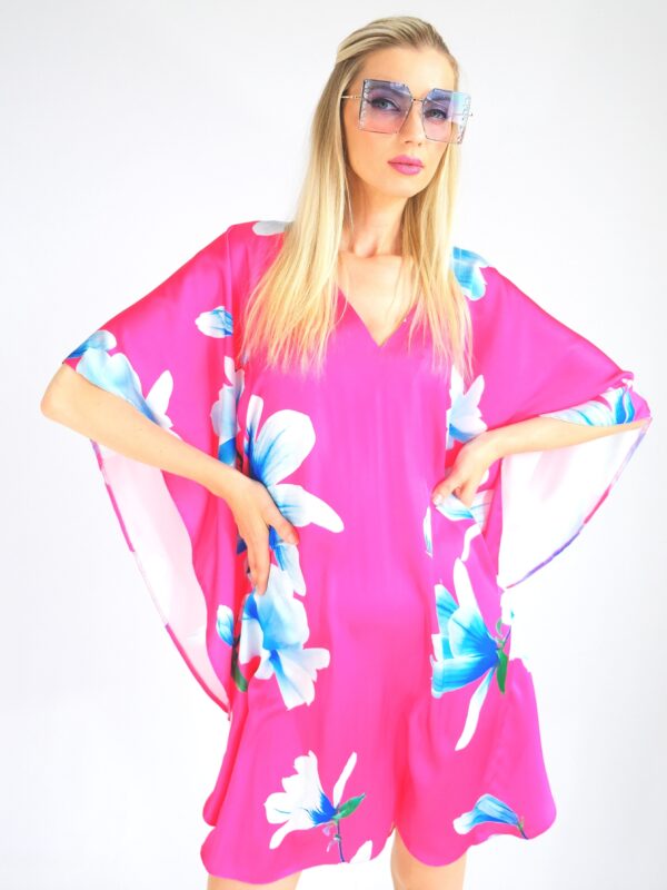 Šaty sú navrhnuté v tvare štvorca, ktorý je v na bokoch zošitý a vytvárajú dojem motýlích krídiel. Šaty sú tým pádom veľmi vzdušné, ušité z kĺzavého materiálu. Jednoduchý strih šiat necháva naplno vyniknúť výraznému vzoru strelícii na výraznom cyklámenovom pozadí. Výnimočné šaty na každú príležitosť , či je to letná oslava alebo dovolenka.