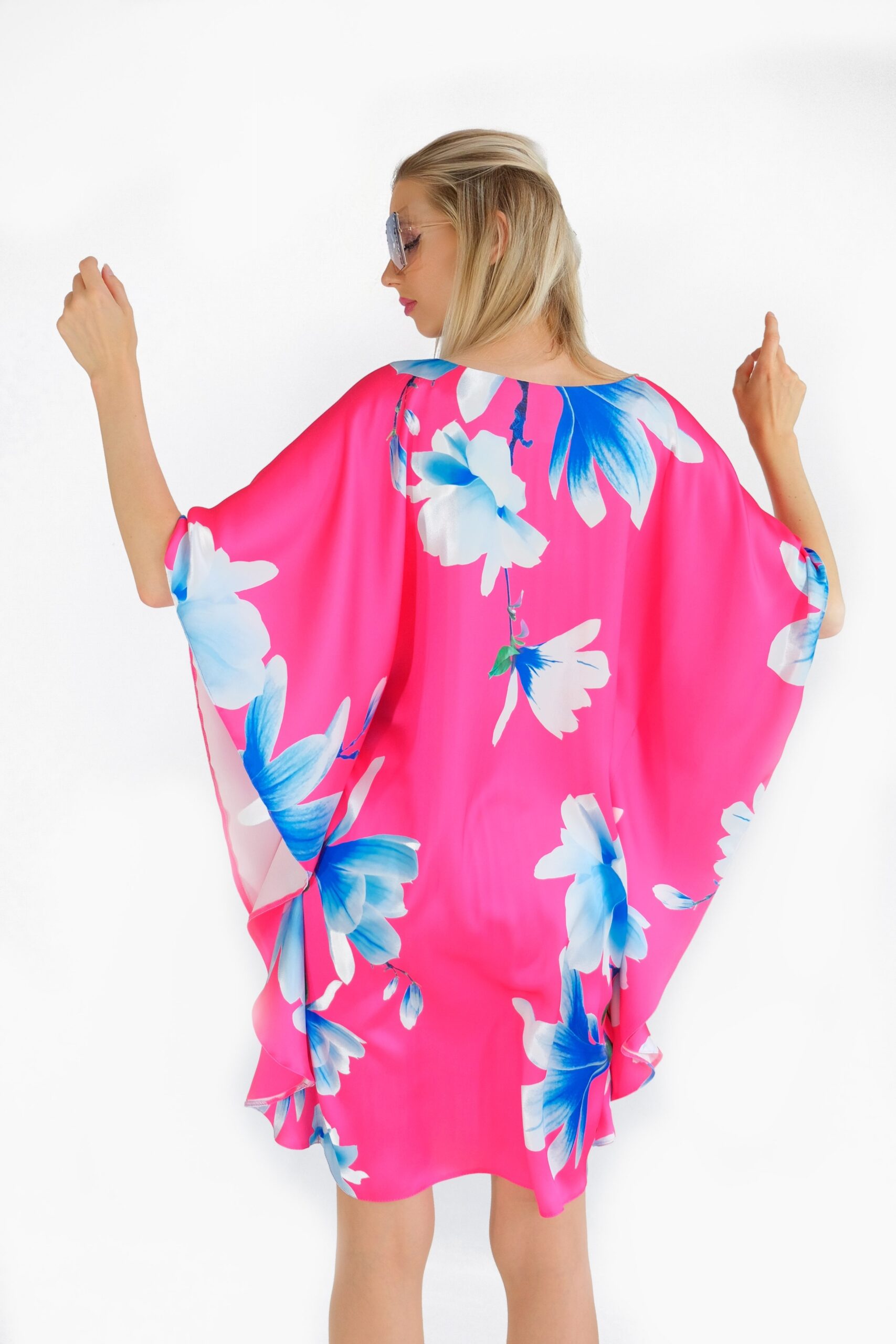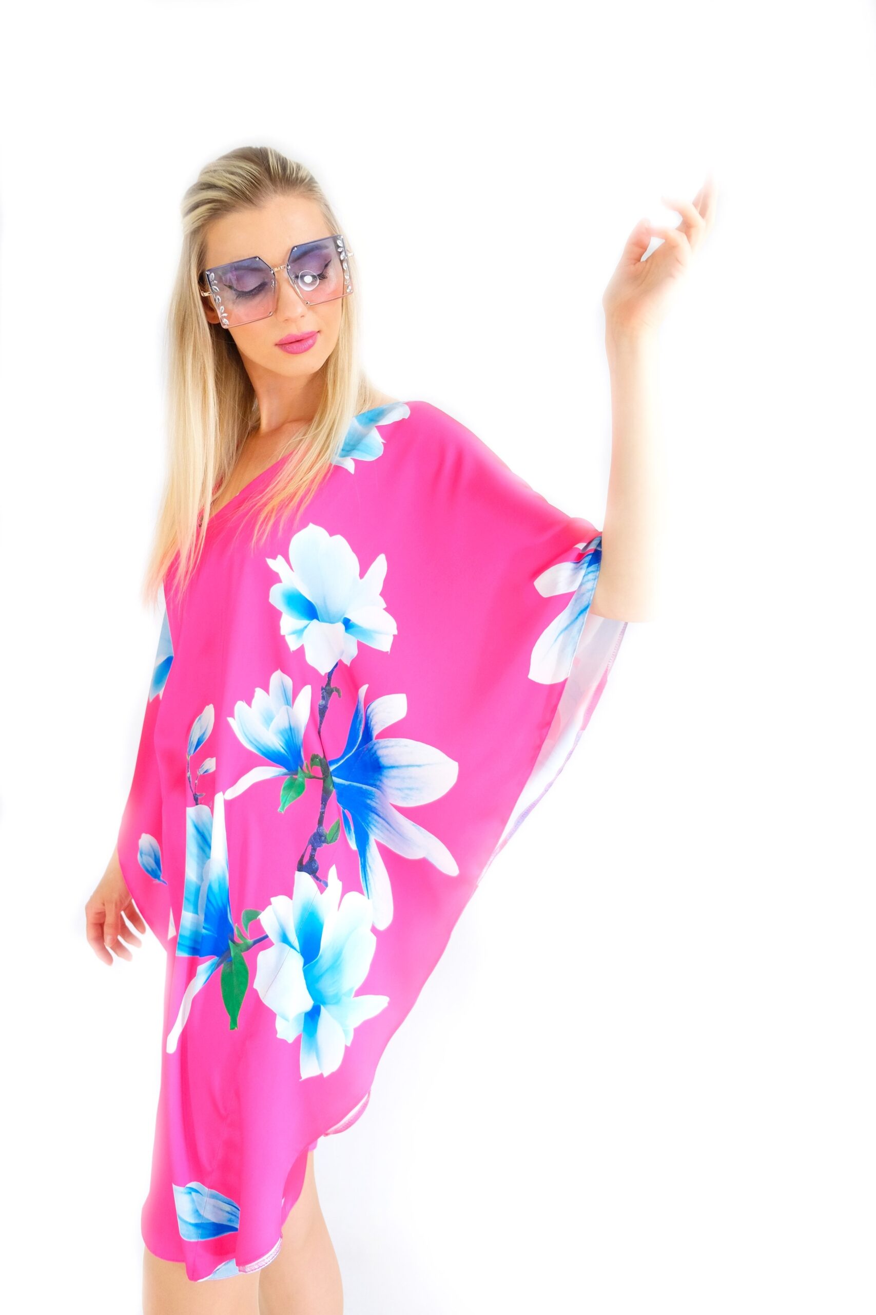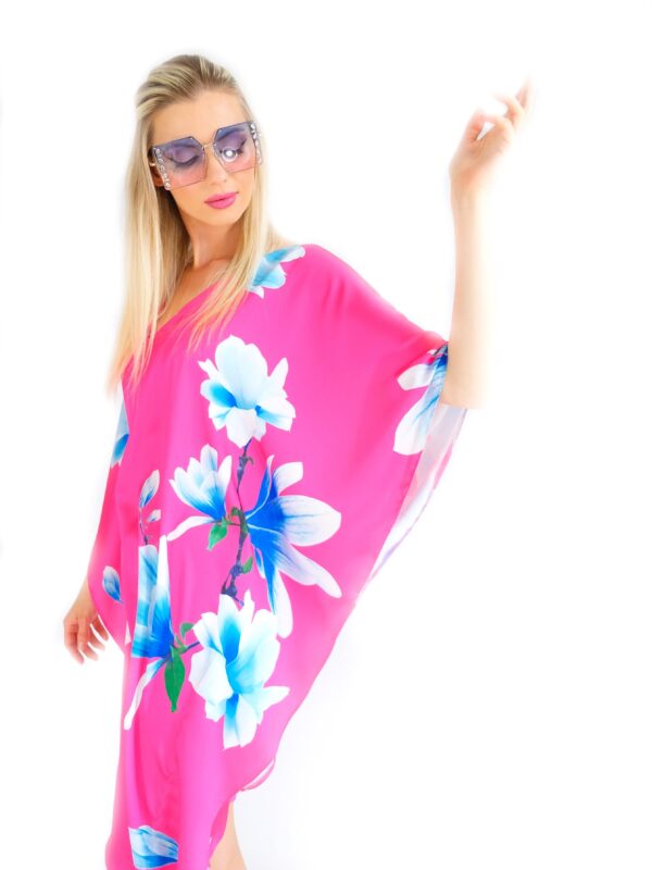 Šaty sú navrhnuté v tvare štvorca, ktorý je v na bokoch zošitý a vytvárajú dojem motýlích krídiel. Šaty sú tým pádom veľmi vzdušné, ušité z kĺzavého materiálu. Jednoduchý strih šiat necháva naplno vyniknúť výraznému vzoru strelícii na výraznom cyklámenovom pozadí. Výnimočné šaty na každú príležitosť , či je to letná oslava alebo dovolenka.