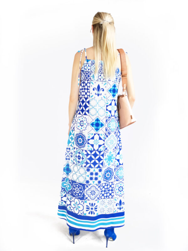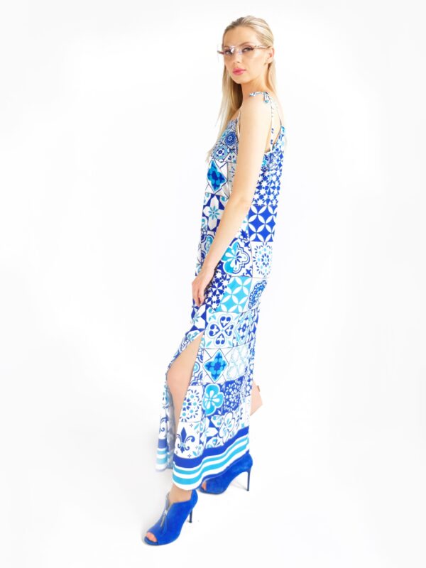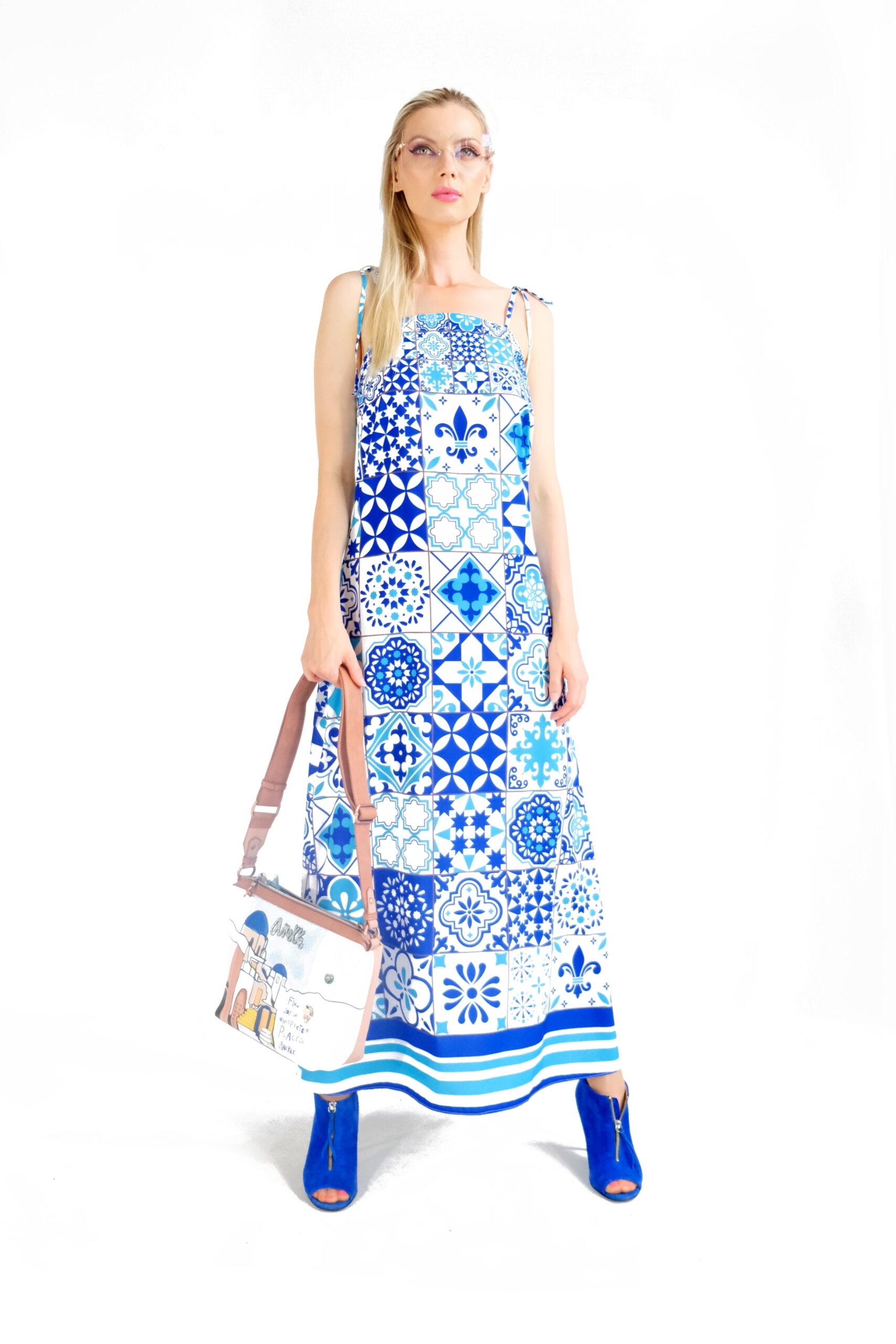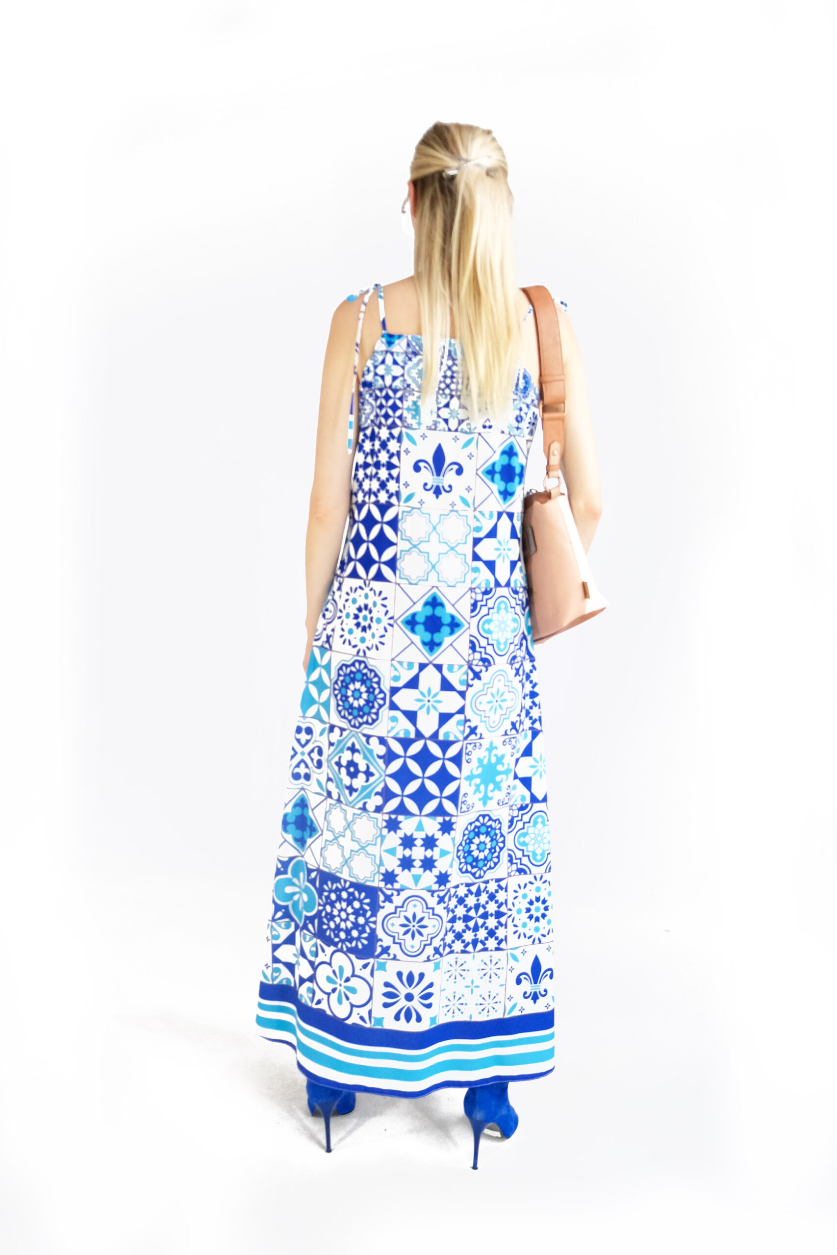 Šaty sú navrhnuté v jednoduchom áčkovom strihu. Šaty sú ušité z ľahkého letného materiálu, v ktorom sa budete cítiť komfortne aj počas letných dní. Šaty sú stelesnením leta so špagetovými ramienkami a rozstrihmi na bokoch. Najzaujímavejší na šatách je práve vzor, ktorý pripomína obľúbené ostrovy a ich ikonickú bielo-modrú architektúru. Buďte aj Vy, gréckou bohyňou a zažiarte v jednoduchých letných šatách. Skombinujte ich so sandálami a bielymi doplnkami pre ucelený letný look.