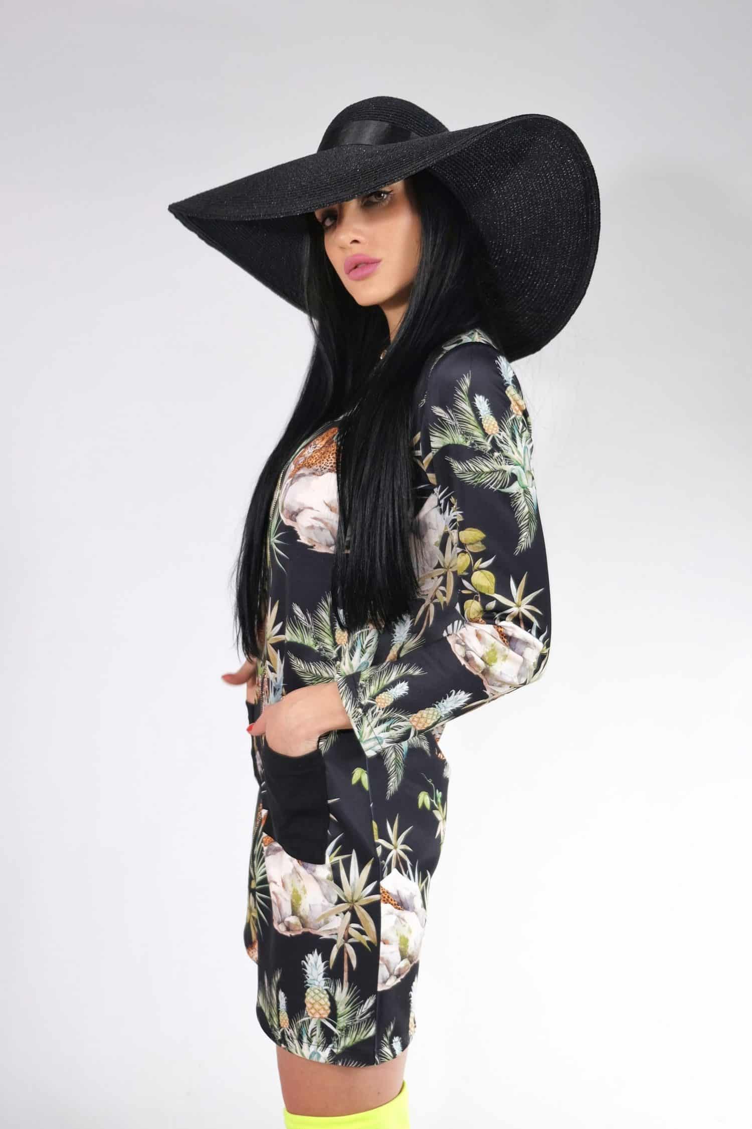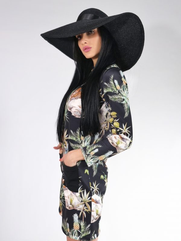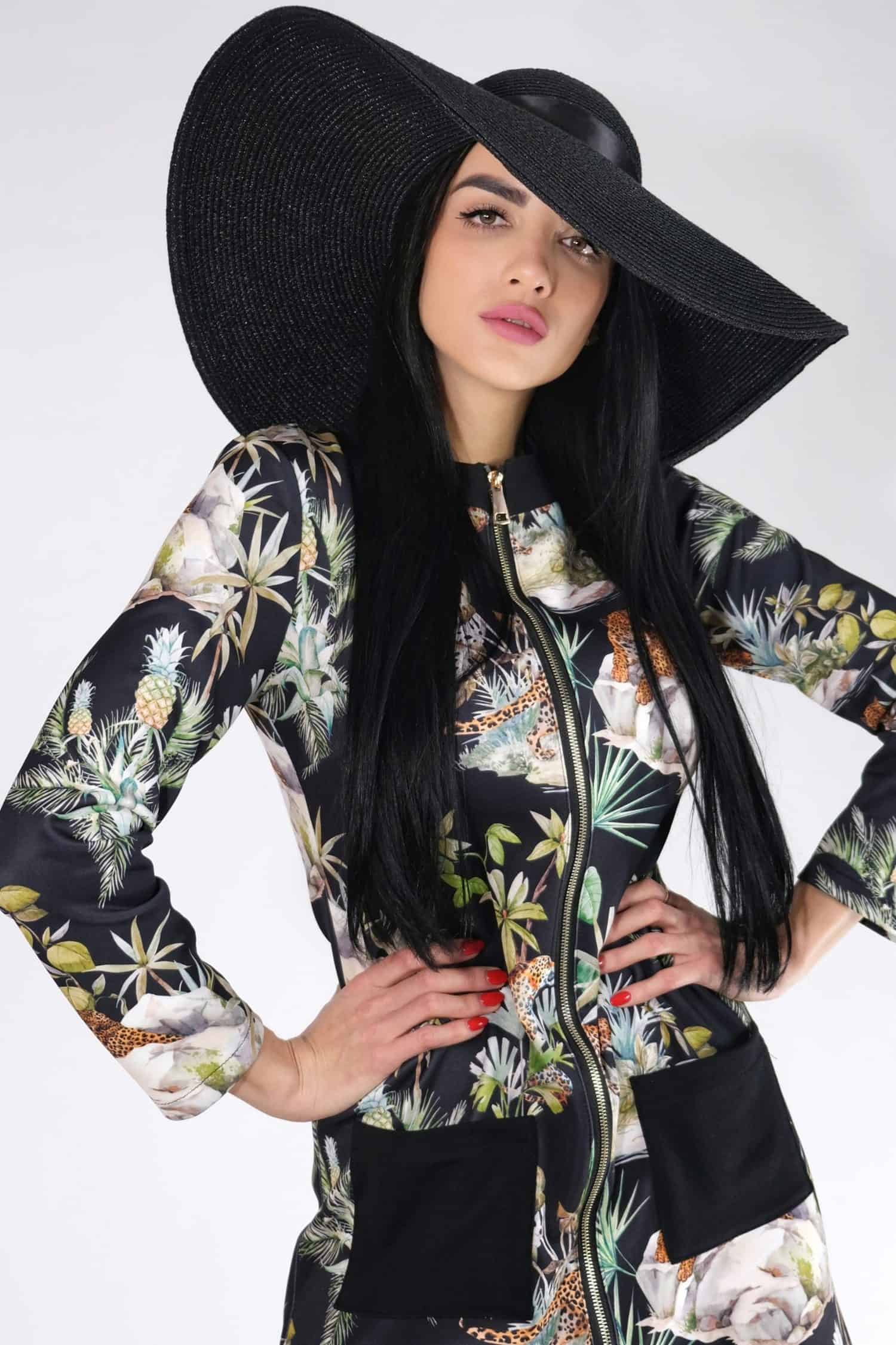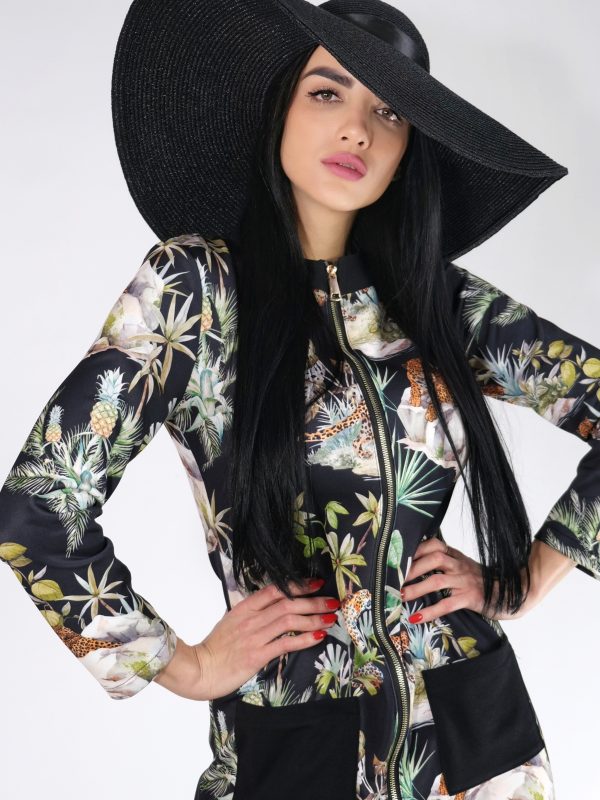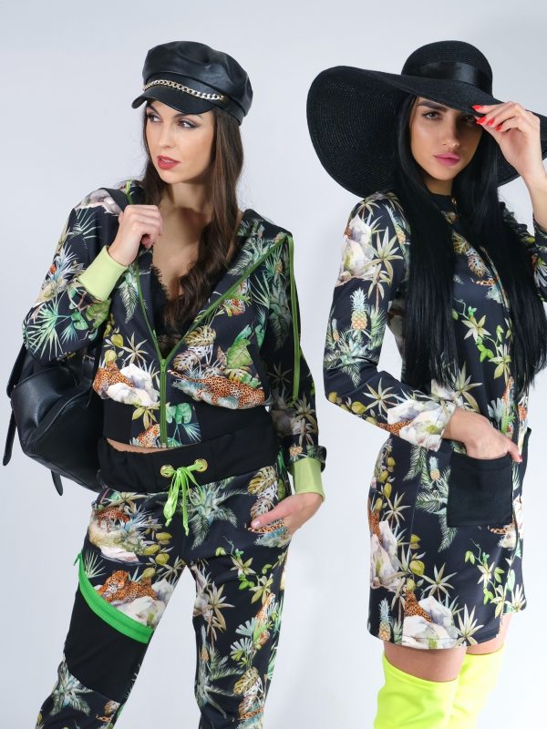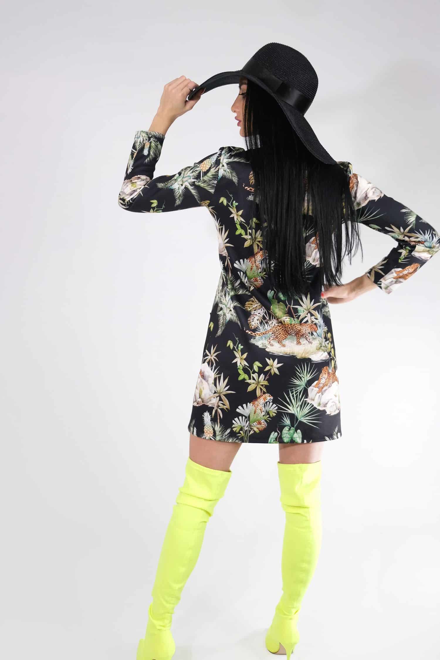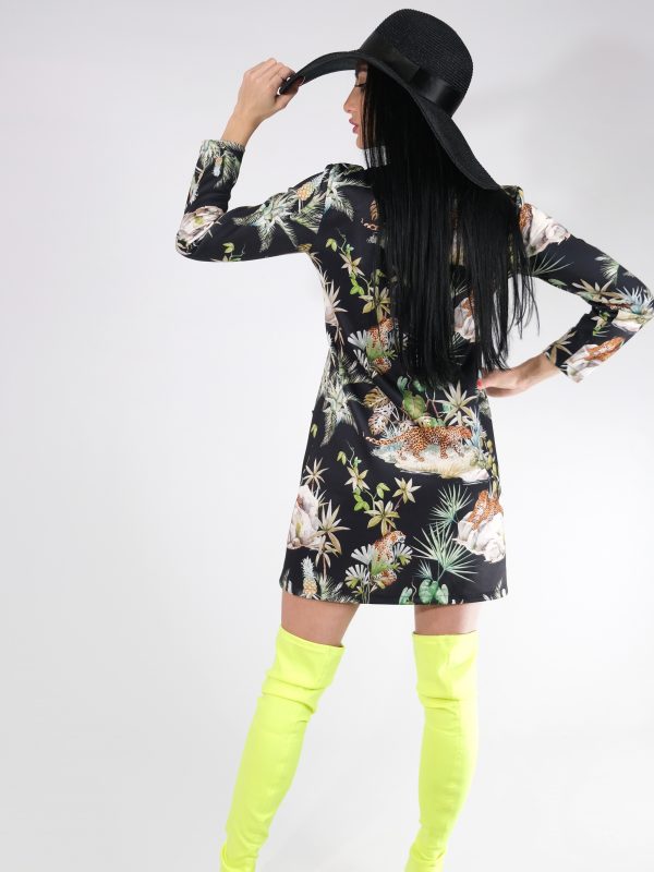 Šaty navrhnuté v jednoduchom puzdrovom strihu, ktorý sa aj vďaka zipsu po celej dĺžke prispôsobí postave. Šaty sú ušité s úmyslom byť komfortné, aby ste sa v nich cítila pohodlne celý deň . Ležérny strih šiat skvelo dopĺňa výrazná potlač kombinujúc zvieracie motívy s motívmi džungle. Šaty skombinujete ako aj s tmavšími, tak aj svetlejšími doplnkami. Inšpirujte sa našou stylistkou a dolaďte k šatám neónovo zelené doplnky a rozžiarte svoj outfit aj deň.