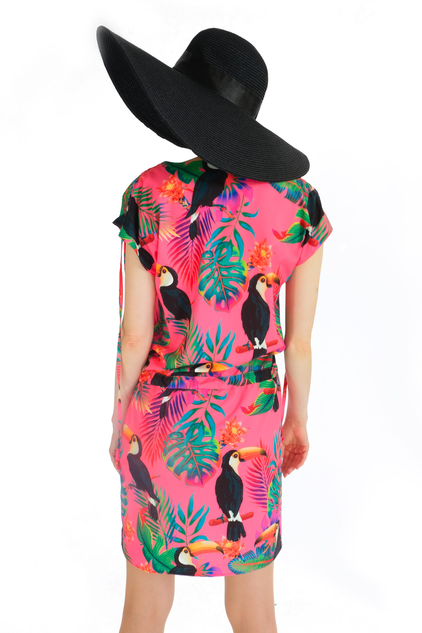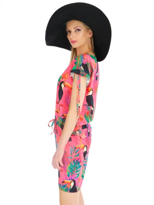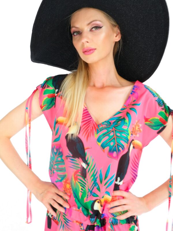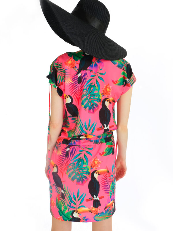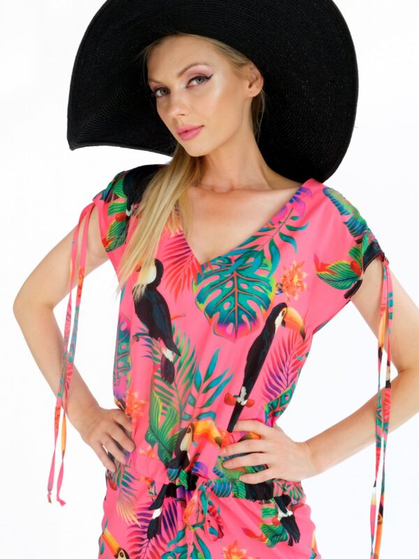 Šaty sú navrhnuté v pohodlnom tunikovom strihu, ktorý sa v páse dá stiahnuť. Šaty sú ušité vo veselej letnej potlači exotických zvierat a výborne sa kombinujú so všetkými letnými farbami. Zaujímavým detailom je riasenie na rukávoch, ktoré šatám dodáva na ležérnosti. Šaty sú ideálna voľba na horúci letný deň na pláži alebo v meste.