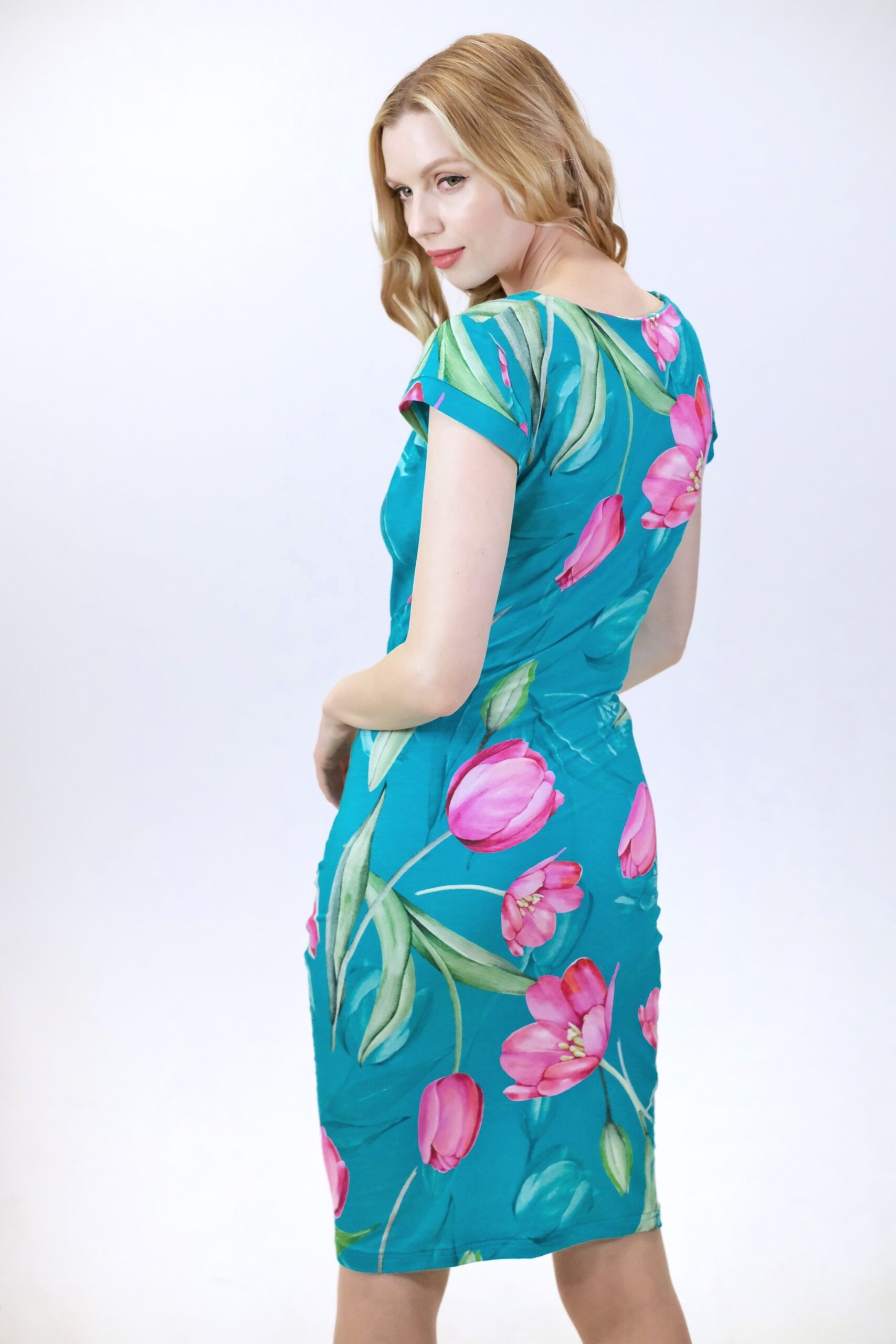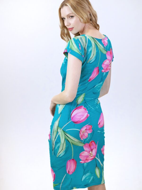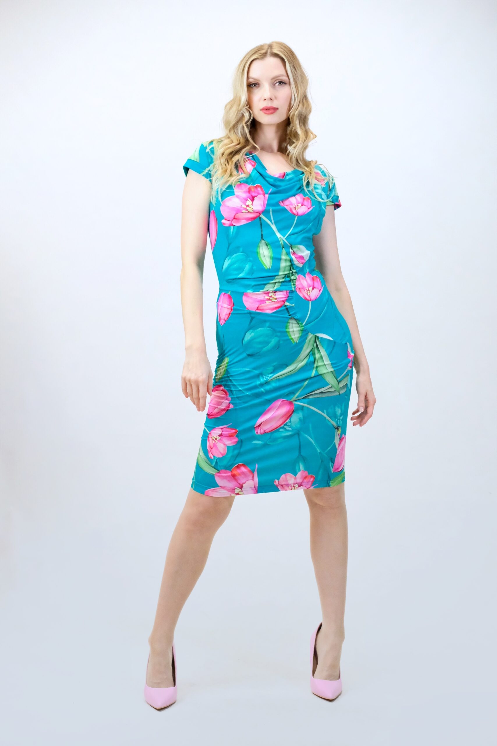 Šaty sú ušité z prispôsobivého elastického úpletu, ktorý Vám sadne ako druhá koža. Šaty sú navrhnuté s florálnym motívom na výraznom tyrkysovom podklade. Vďaka skvelému materiálu sa v nich budete cítiť komfortne počas celého dňa. Kombinujte s výraznými cyklamenovými doplnkami, ktoré zladíte ku kvetom.