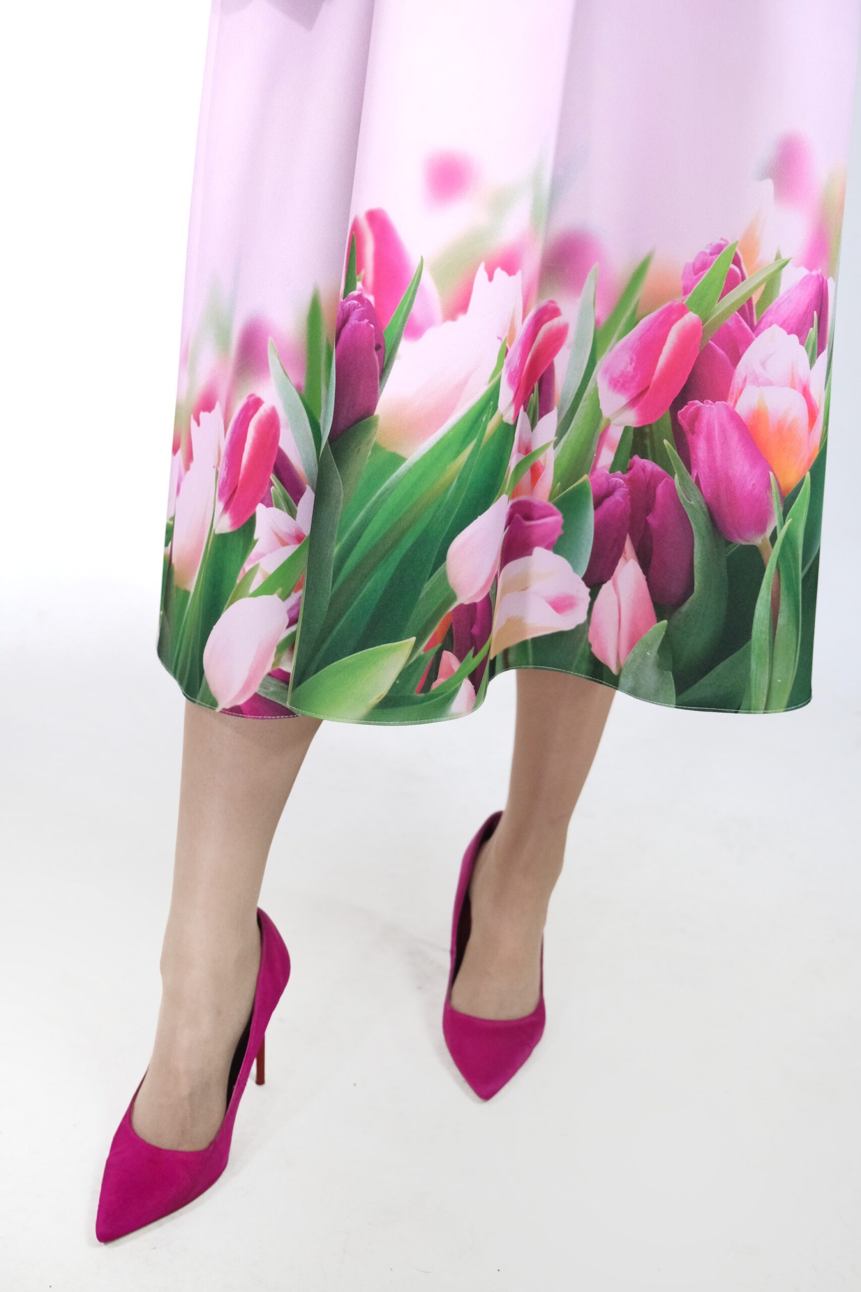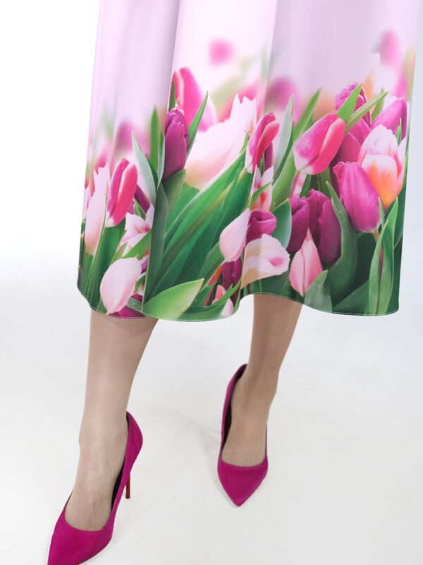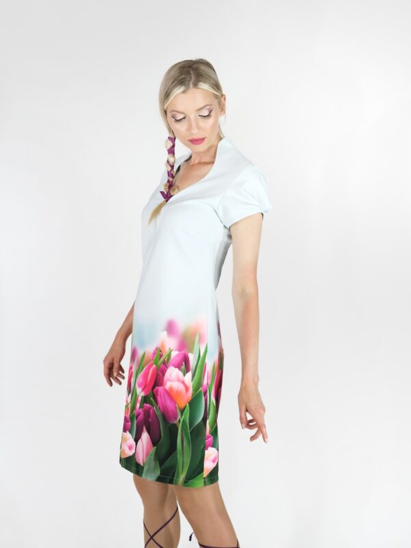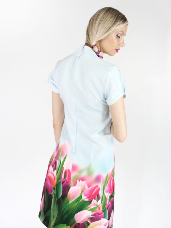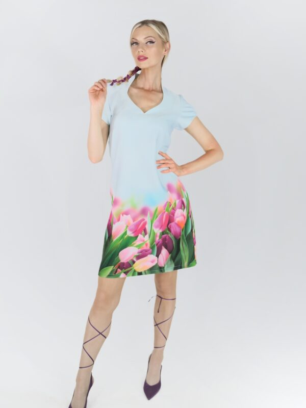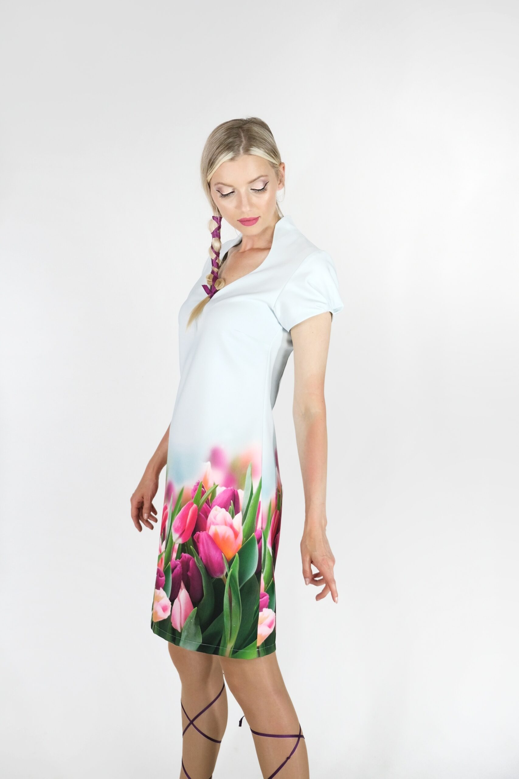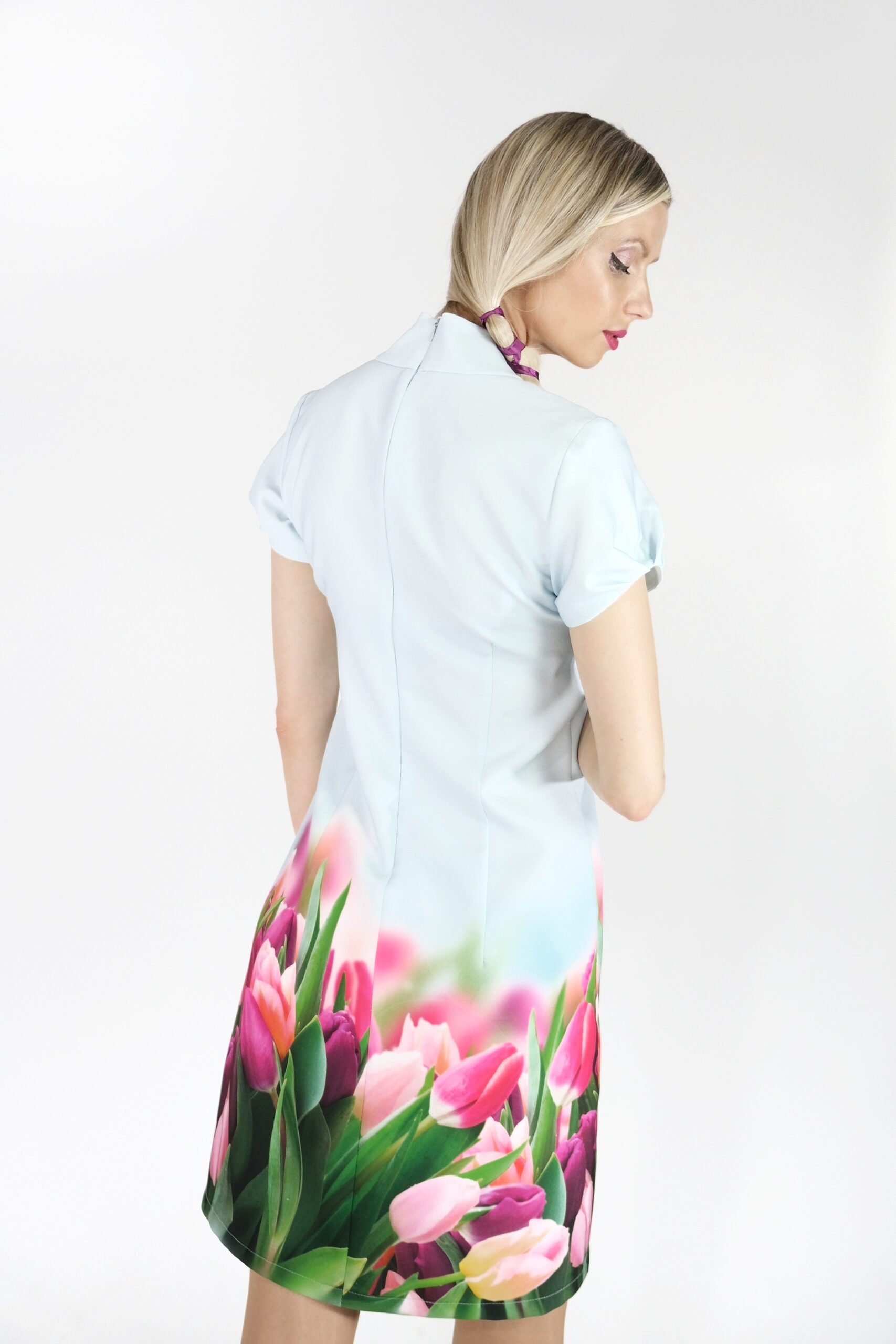 Šaty ušité v pohodlnom áčkovom strihu, ktorý výborne sadne na každú postavu. Šaty majú nariasené rukávy, čo im dodáva romantický nádych. Zaujímavým detailom je riešenie výstrihu, ktorý ma netradičný srdcový tvar. Šaty Vám vyrazia dych krásnym letným kvetinovým vzorom, ktorý pripomína rozkvitnutú lúku tulipánov. Výrazne farby tulipánov vyniknú o to viac na jemnej pastelovej modrej. Šaty Vám dodajú jednoznačný letný nádych a ľahko ich skombinujete s výraznými doplnkami.