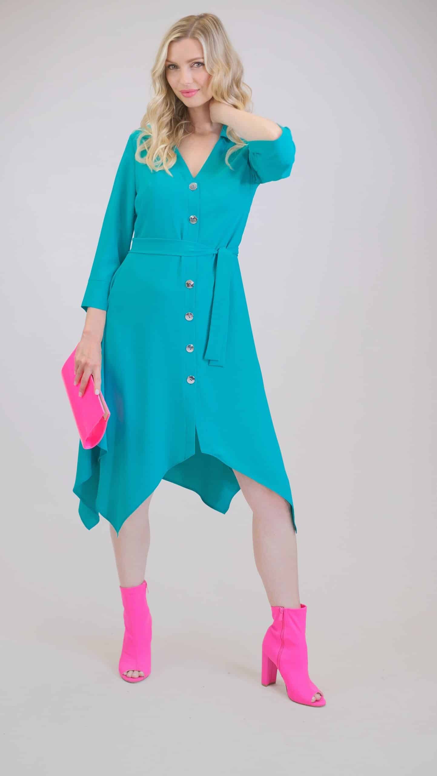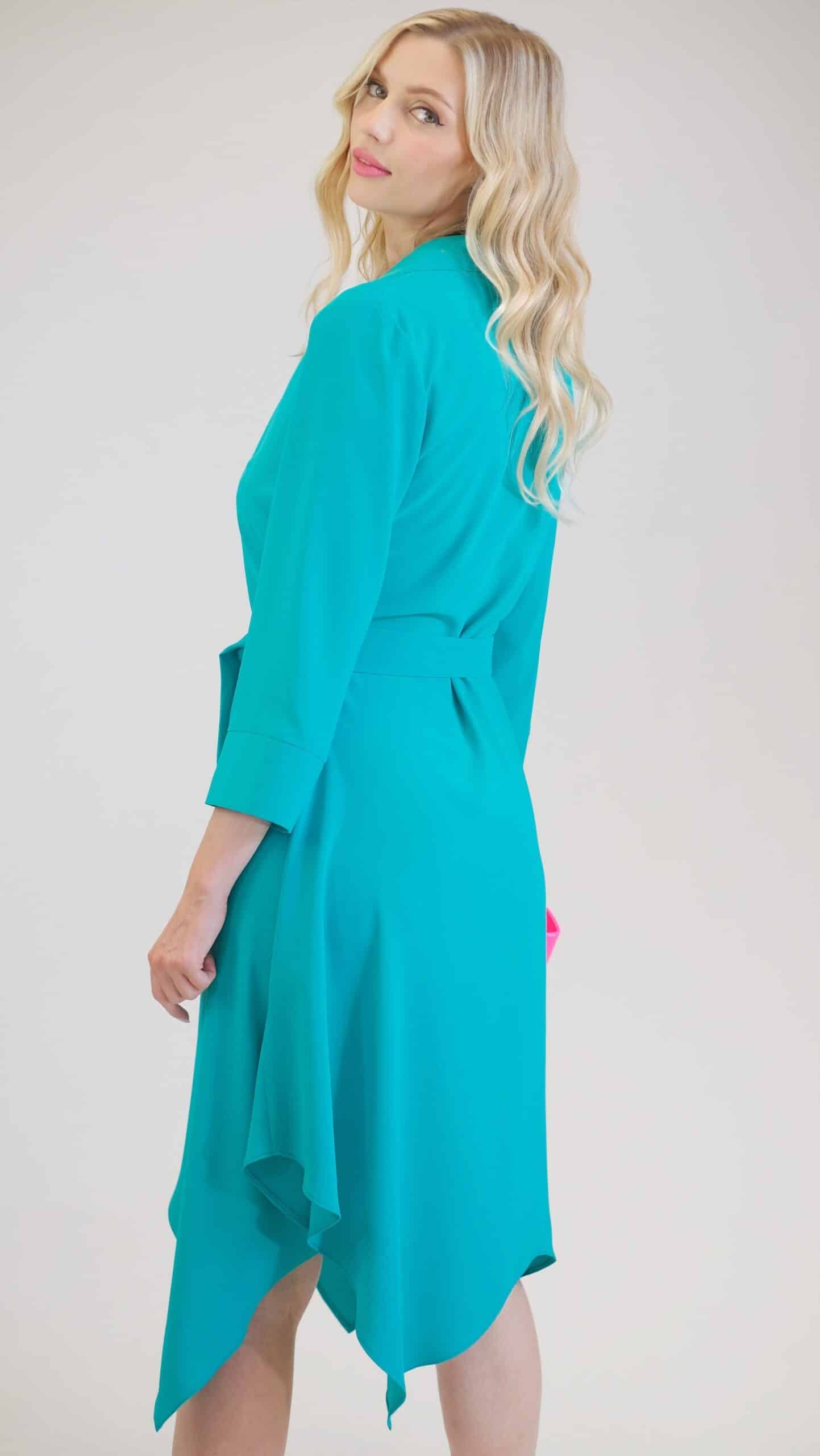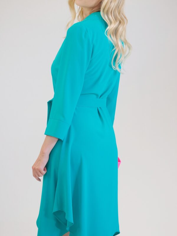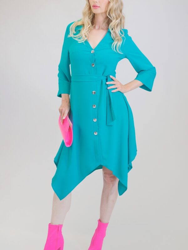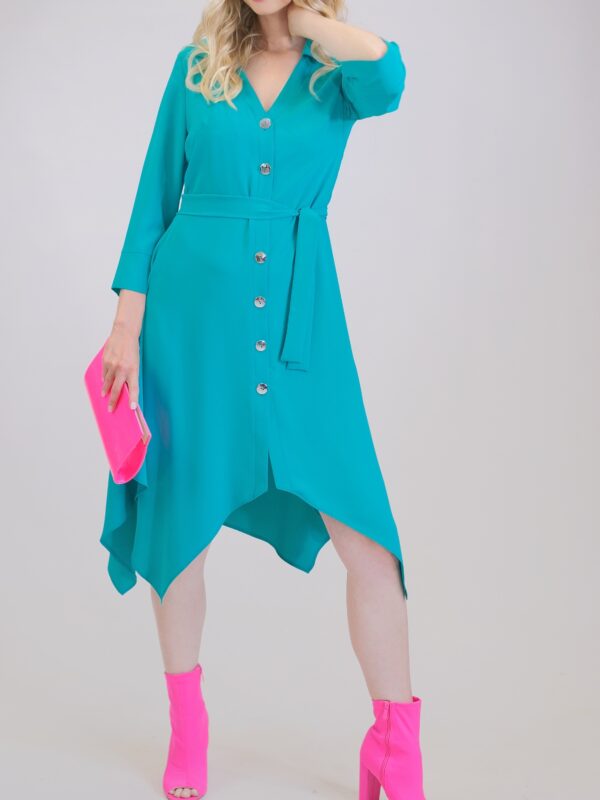 Šaty sú navrhnuté v obľúbenom áčkovom strihu, ktorý skvele sadne na každý typ postavy. Šaty sú rovného strihu a sú asymetricky strihané. Šaty majú opasok z vlastnej látky, vďaka , ktorému si viete vytvoriť pás. Šaty majú véčkový výstrih a sú ušité v krásnej tyrkysovej farbe. Šaty skombinujte s výraznými doplnkami ako naša stylistka.