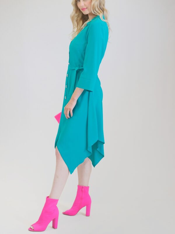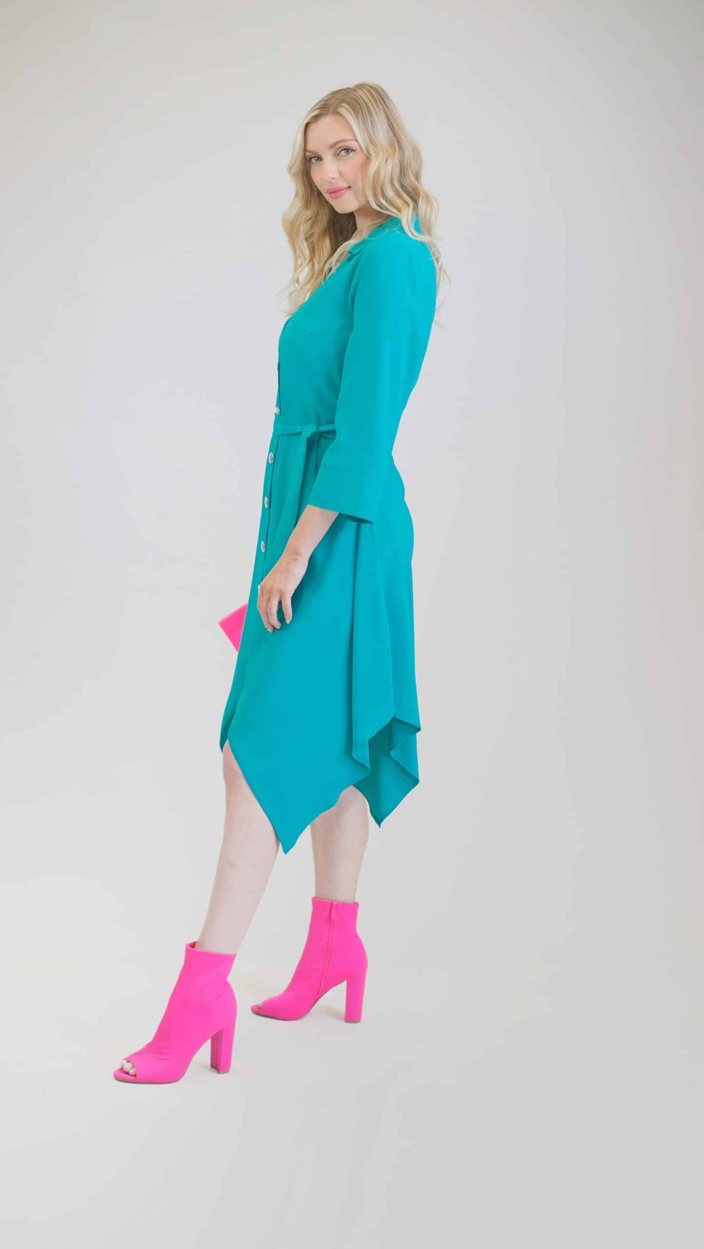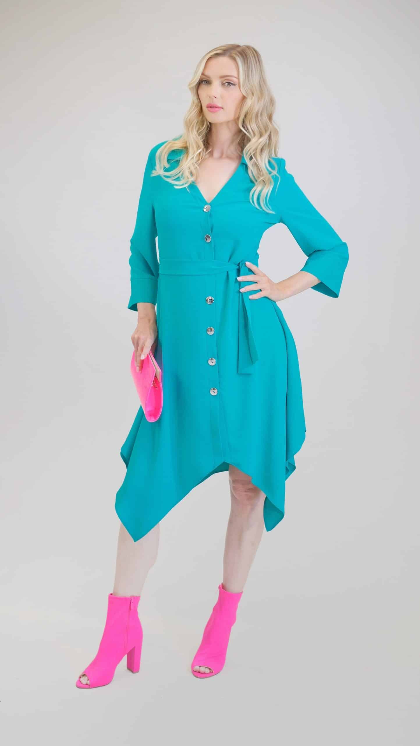 Šaty sú navrhnuté v obľúbenom áčkovom strihu, ktorý skvele sadne na každý typ postavy. Šaty sú rovného strihu a sú asymetricky strihané. Šaty majú opasok z vlastnej látky, vďaka , ktorému si viete vytvoriť pás. Šaty majú véčkový výstrih a sú ušité v krásnej tyrkysovej farbe. Šaty skombinujte s výraznými doplnkami ako naša stylistka.