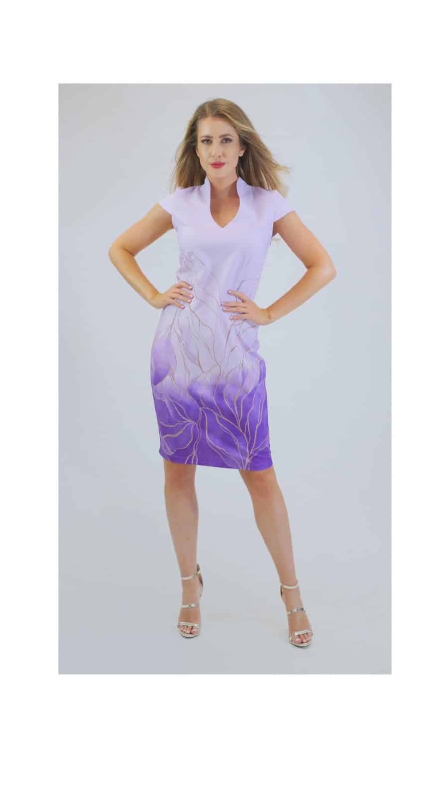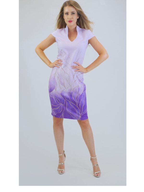 Šaty sú ušité v pohodlnom puzdrovom strihu. Šaty sú navrhnuté vo výnimočnom bordúrovom motíve. Zaujímavým detailom šiat je spracovanie goliera, ktorý je naschvál prinechaný a krásne vám zoštíhli krk. Najvýraznejším na šatách je vzor, ktorý pripomína zlaté intarzie s fialovým nádychom. Šaty kombinujte s výraznými zlatými doplnkami pre wow efekt ako naša aranžérka. Šaty sú vhodnou voľbou na letnú svadbu pre svadobné mami ako aj pre hostí.
