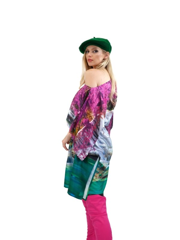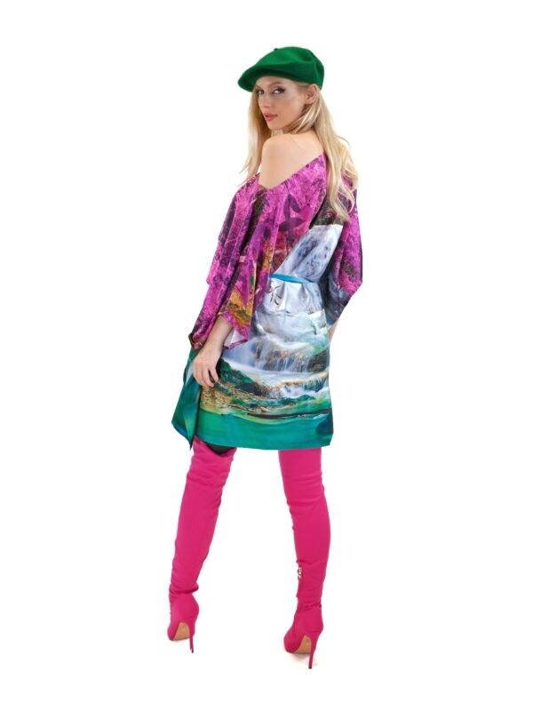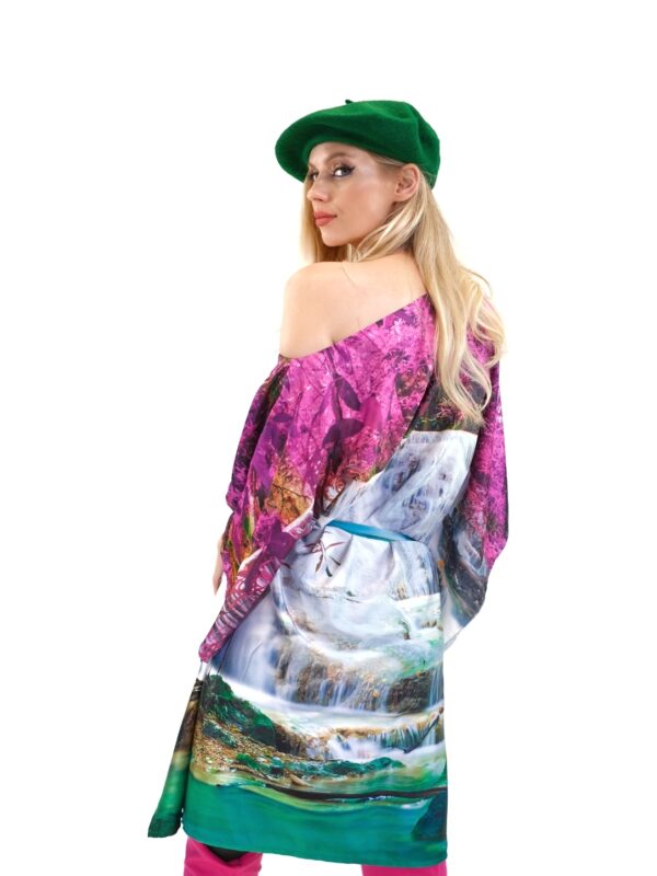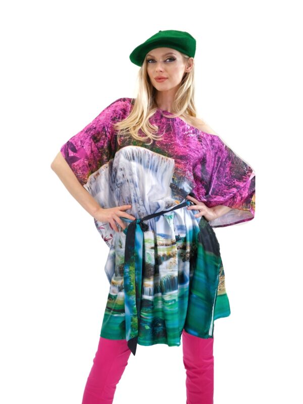 Šaty sú ušité v pohodlnom strihu, v ktorom sa budete cítiť, že na sebe nič nemáte. Šaty sú navrhnuté v jednoduchom strihu zo štvorca látky s ozdobnými vybíjanými cvokmi. Šaty majú výnimočný orientálny vzor vodopádu a kvitnúcej sakury, ktorý kombinuje dve farby tejto sezóny cyklámenovú a zelenú.
