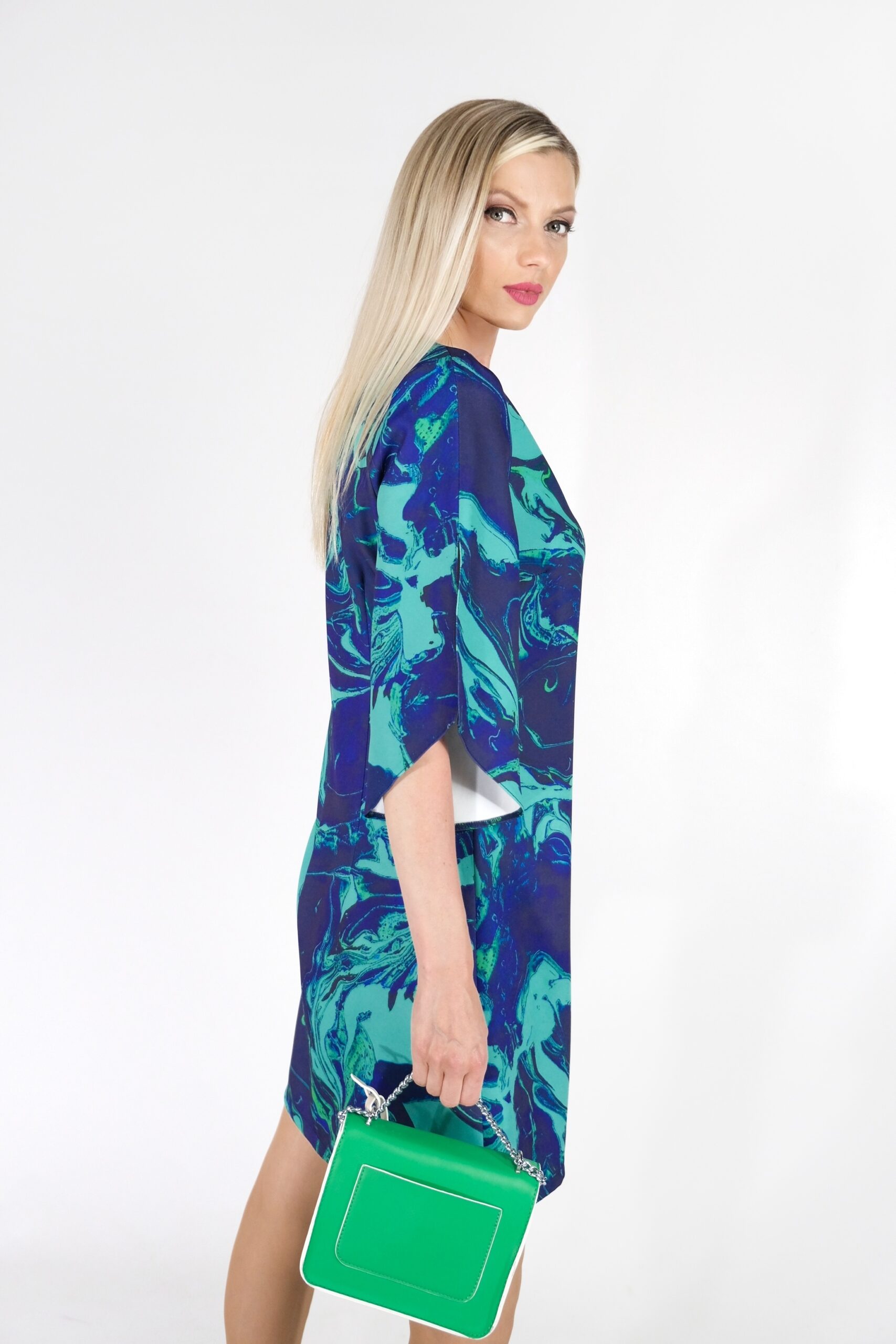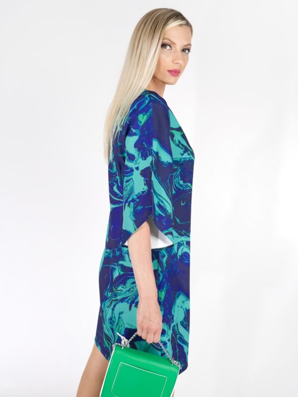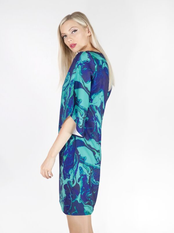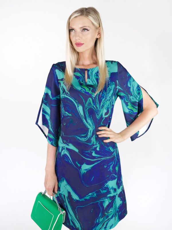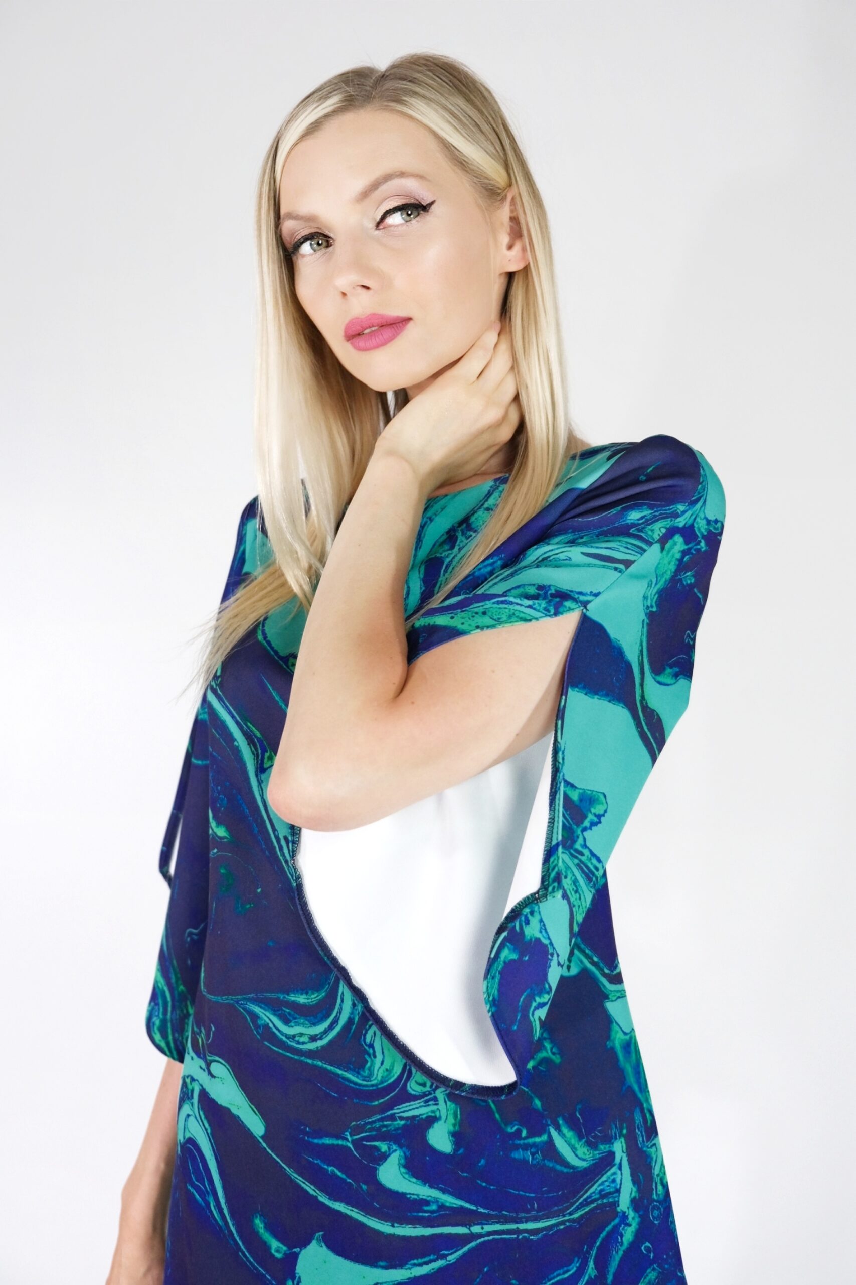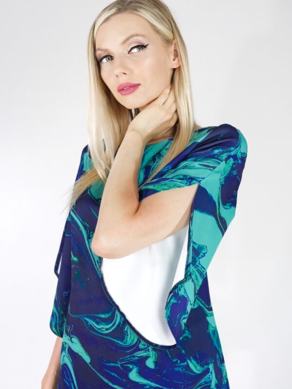 Šaty sú navrhnuté v áčkovom strihu, ktorý skvele sadne na každú postavu. Šaty sú ušité z pohodlného materiálu s výraznými bohémskymi rukávmi, ktoré im dodávajú na komforte. Šaty sú navrhnuté z materiálu kombinujúc zelenú a modrú vo vzore, ktorý pripomína vlny na rozbúrenom mori pre tie z Vás, ktoré majú radi tlmené a neutrálne vzory na šatách.