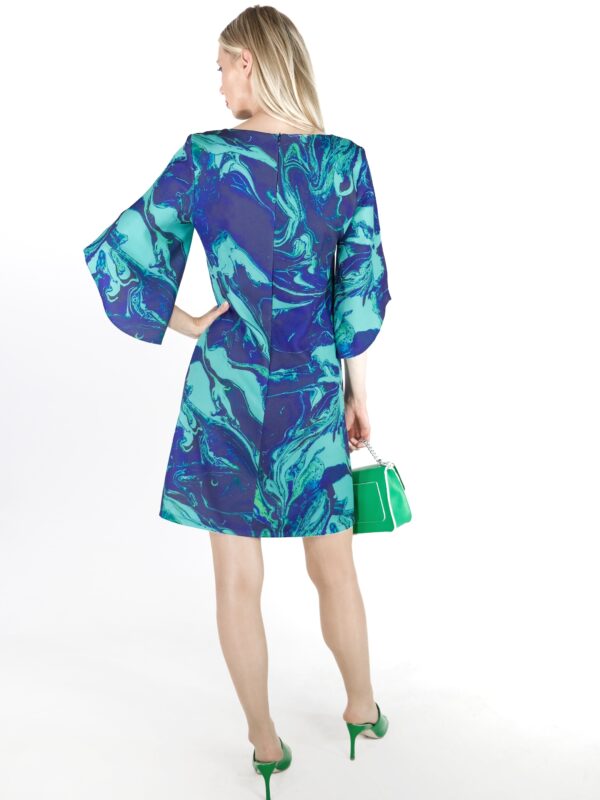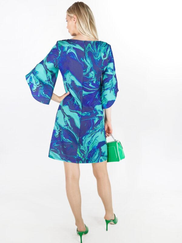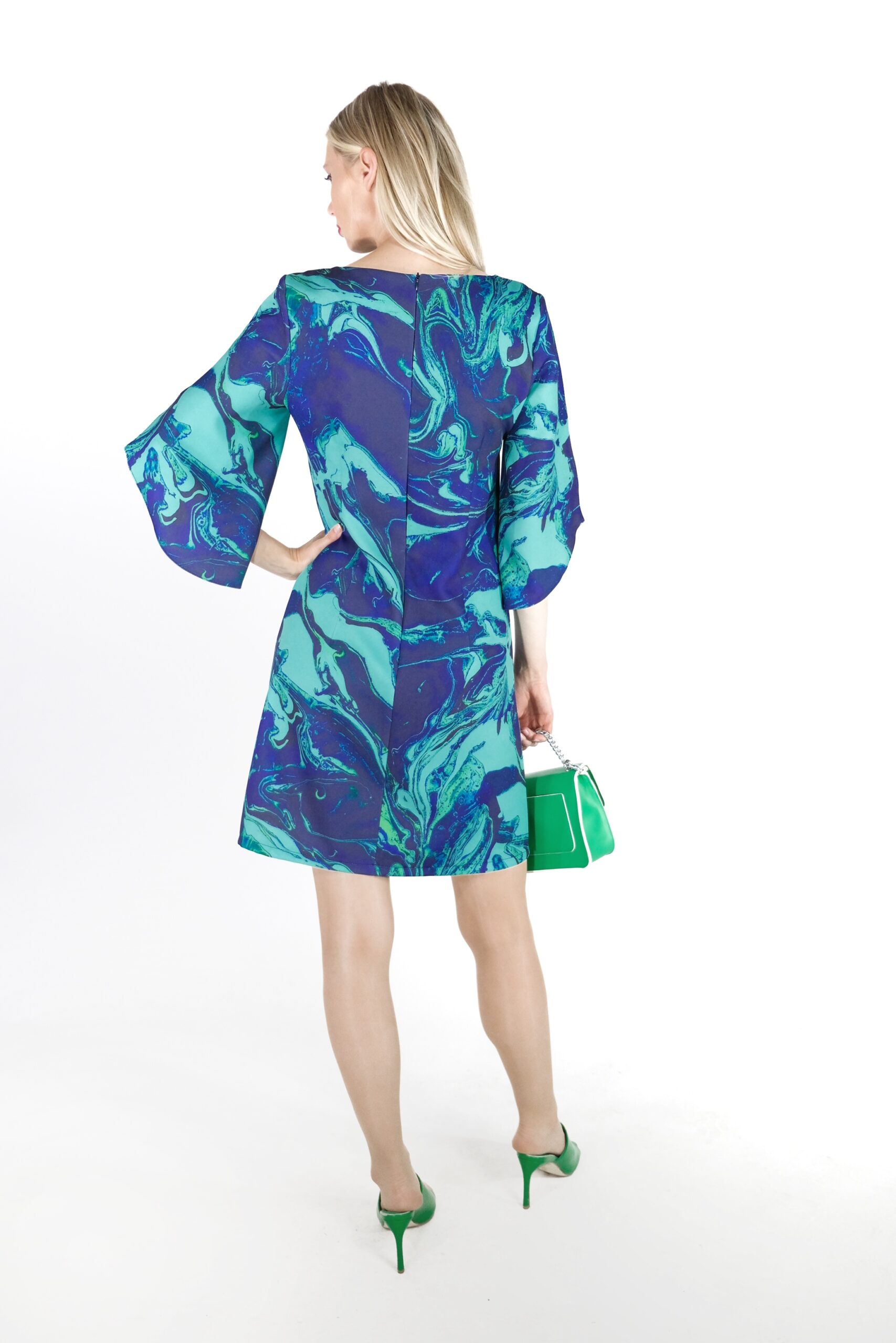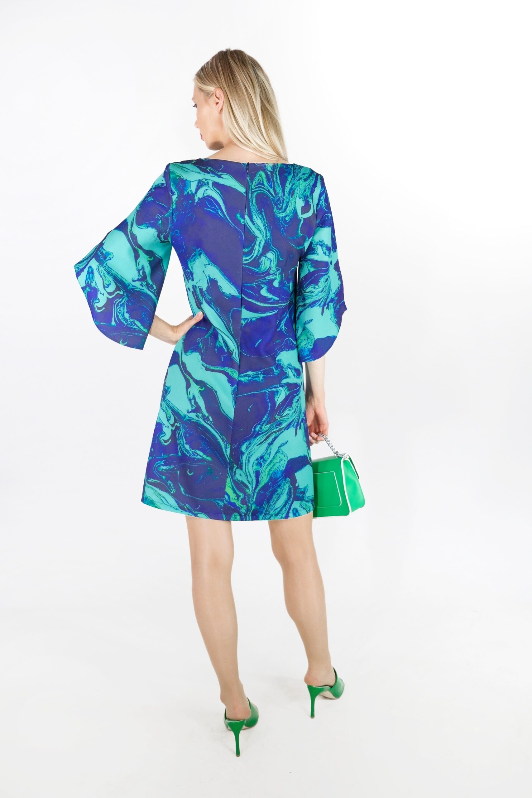 Šaty sú navrhnuté v áčkovom strihu, ktorý skvele sadne na každú postavu. Šaty sú ušité z pohodlného materiálu s výraznými bohémskymi rukávmi, ktoré im dodávajú na komforte. Šaty sú navrhnuté z materiálu kombinujúc zelenú a modrú vo vzore, ktorý pripomína vlny na rozbúrenom mori pre tie z Vás, ktoré majú radi tlmené a neutrálne vzory na šatách.