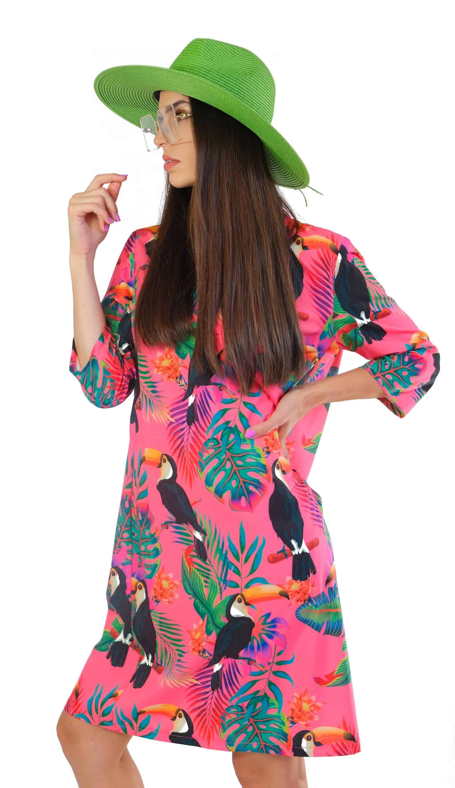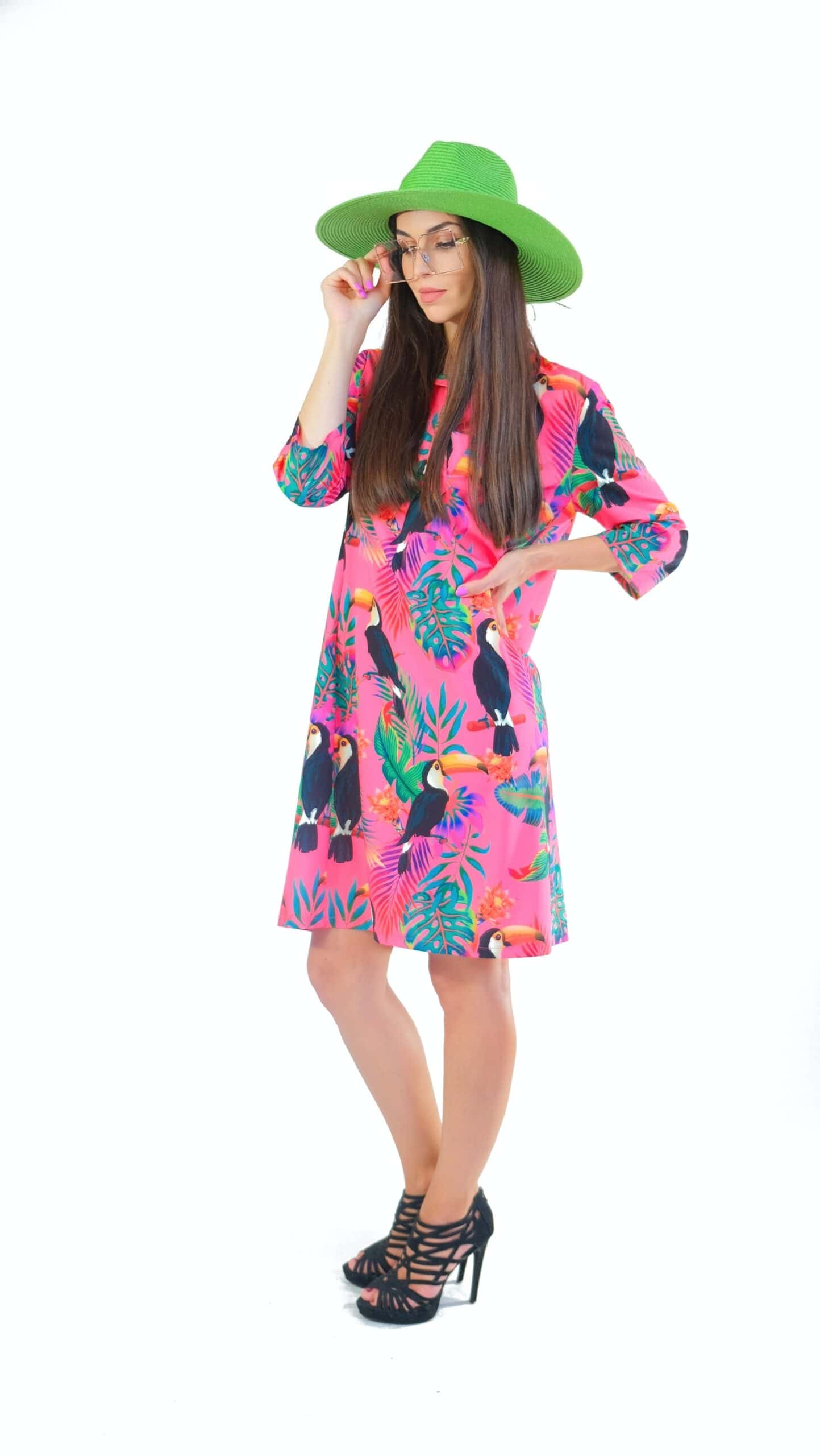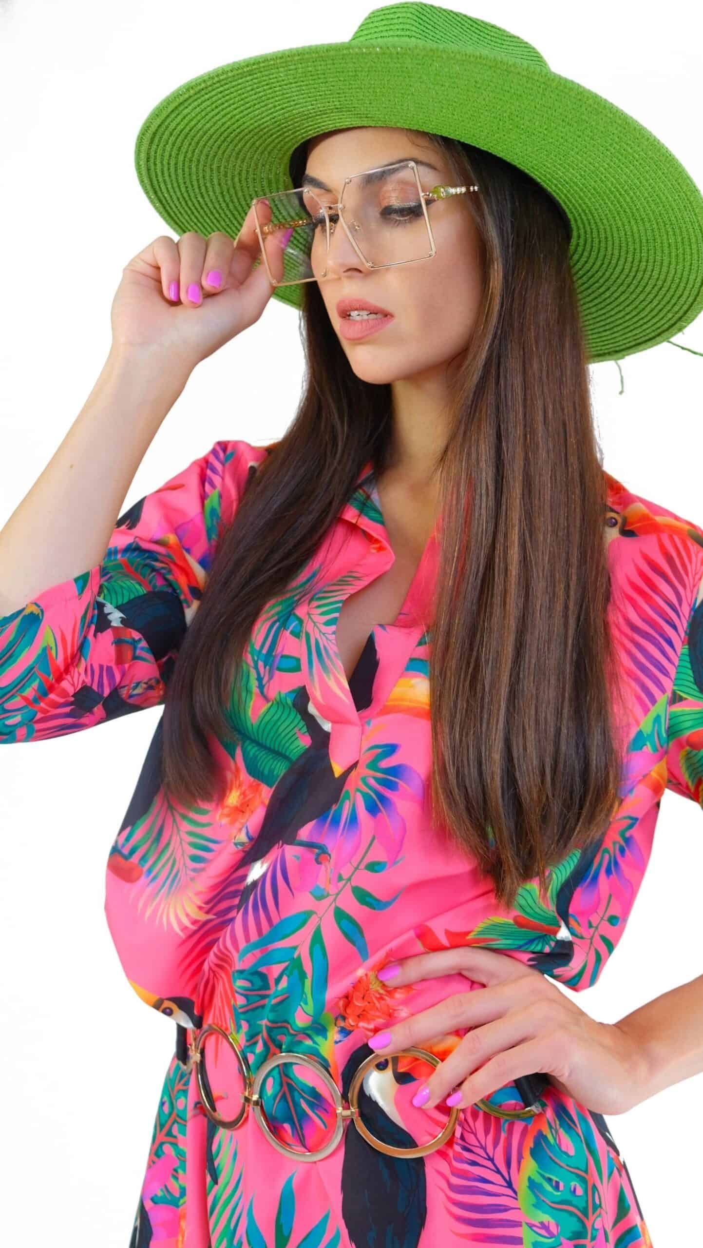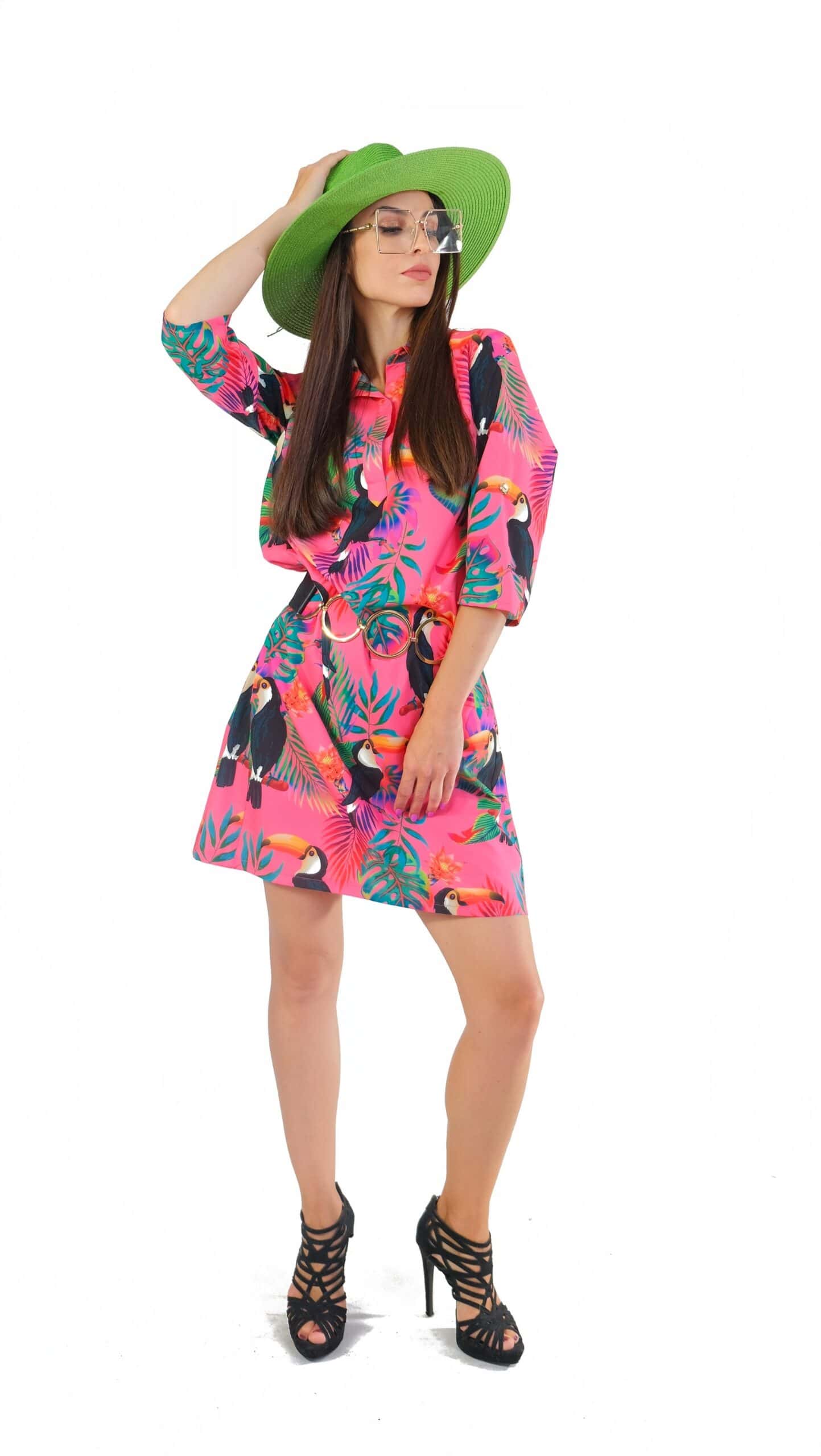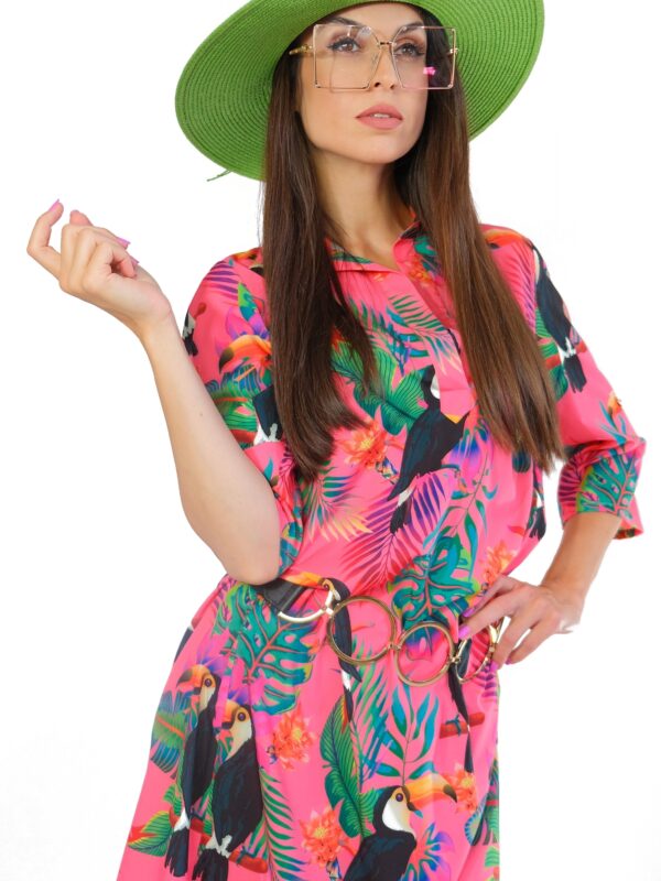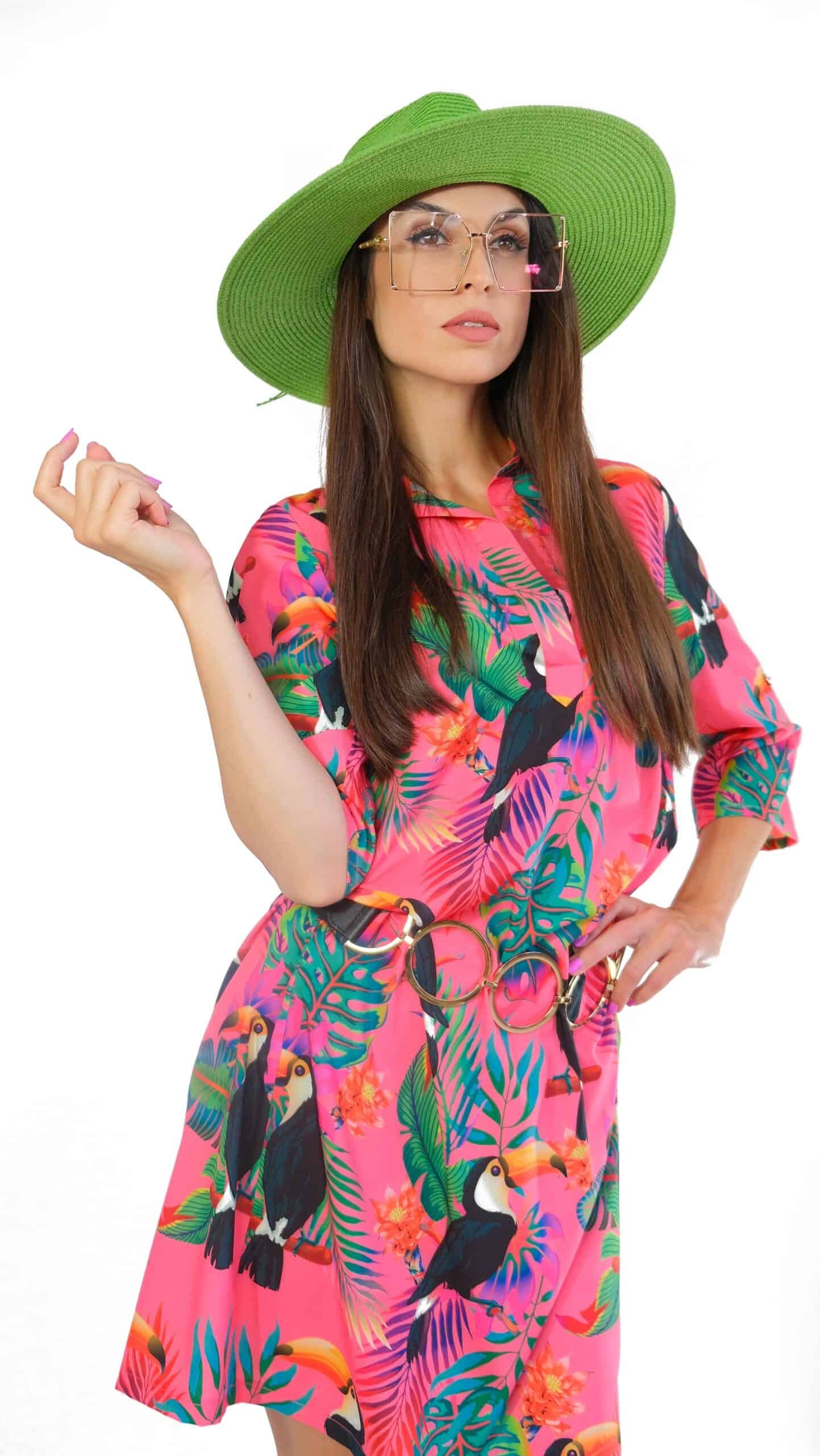 Šaty sú ušité v pohodlnom áčkovom strihu , ktorý si berie inšpiráciu z pánskej košele v oversize strihu. Šaty výborne sadnú na každý typ postavy a vďaka veselému vzoru ľahko zakryjú drobné nedostatky. Šaty majú veselý vzor ako vystrihnutý z africkej divočiny aj tento vzor doslova žiari farbami pre wau letný look skombinujte so zelenými alebo nebesky modrými doplnkami.