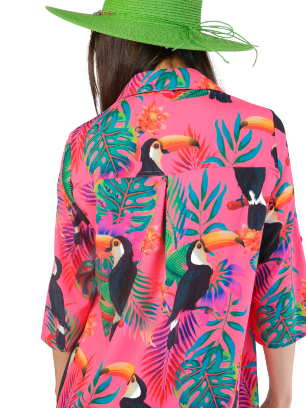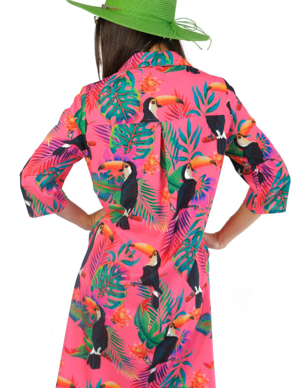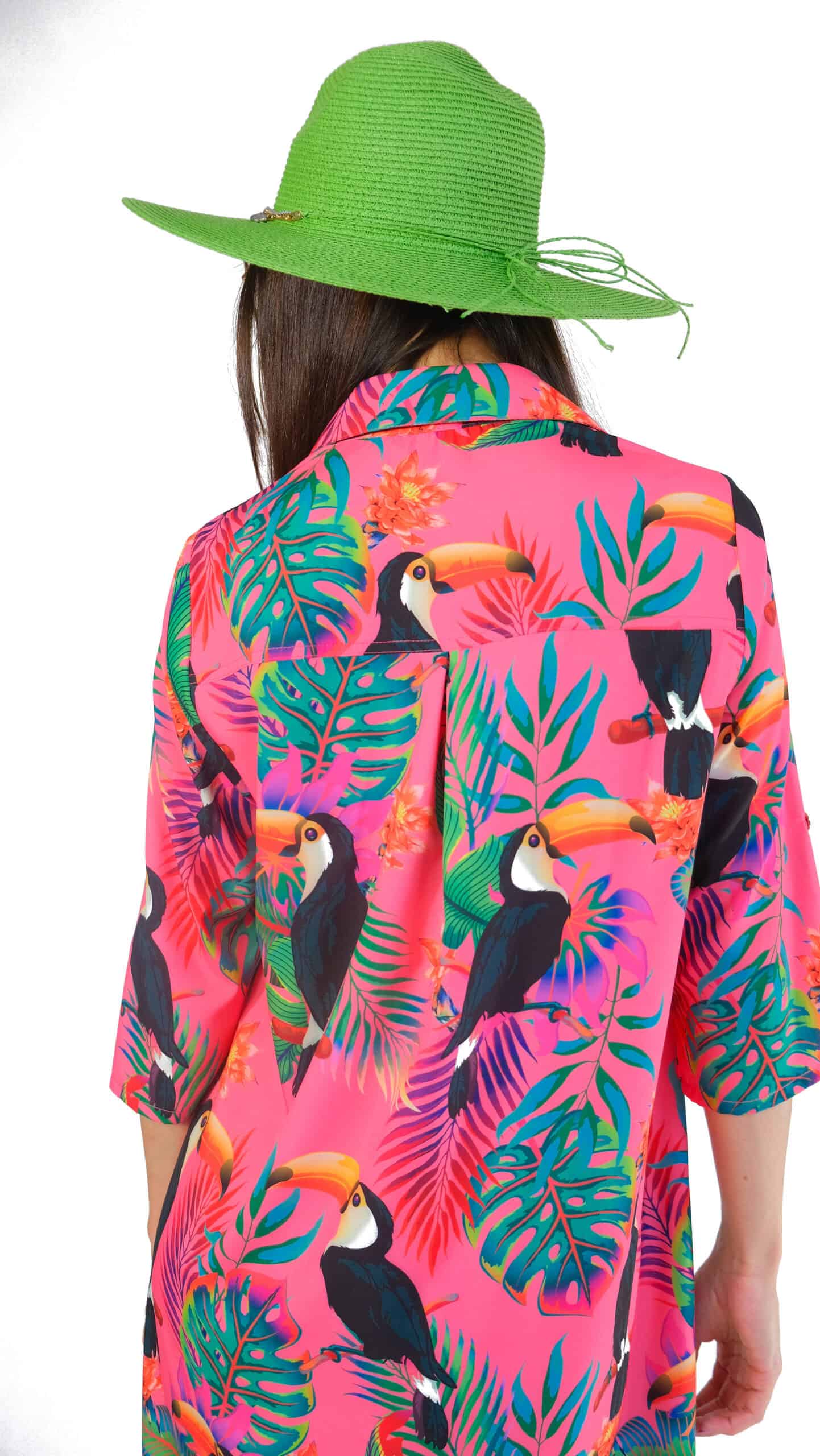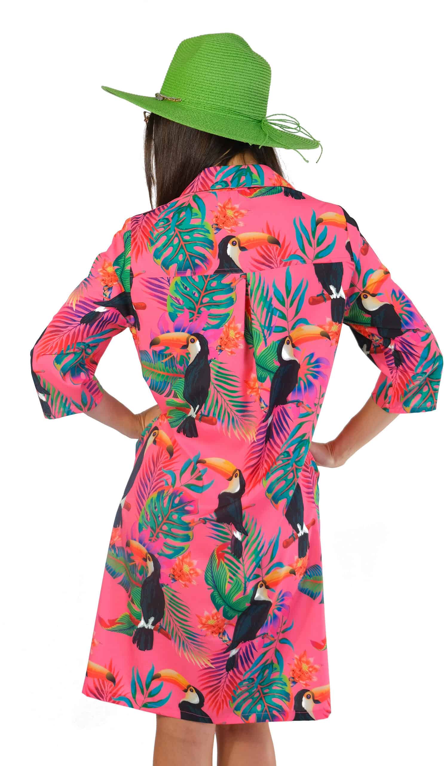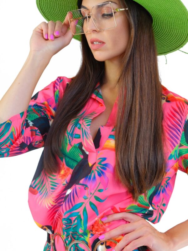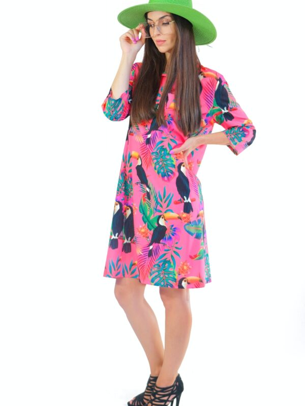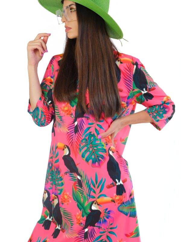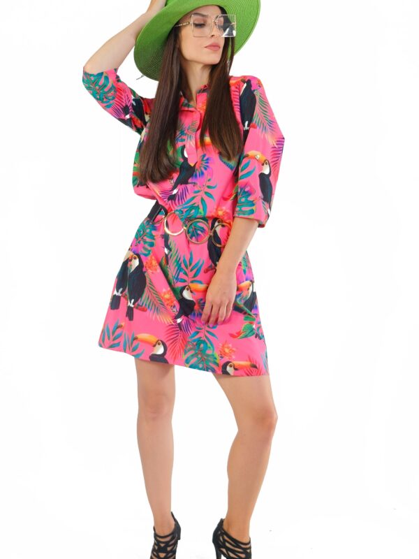 Šaty sú ušité v pohodlnom áčkovom strihu , ktorý si berie inšpiráciu z pánskej košele v oversize strihu. Šaty výborne sadnú na každý typ postavy a vďaka veselému vzoru ľahko zakryjú drobné nedostatky. Šaty majú veselý vzor ako vystrihnutý z africkej divočiny aj tento vzor doslova žiari farbami pre wau letný look skombinujte so zelenými alebo nebesky modrými doplnkami.